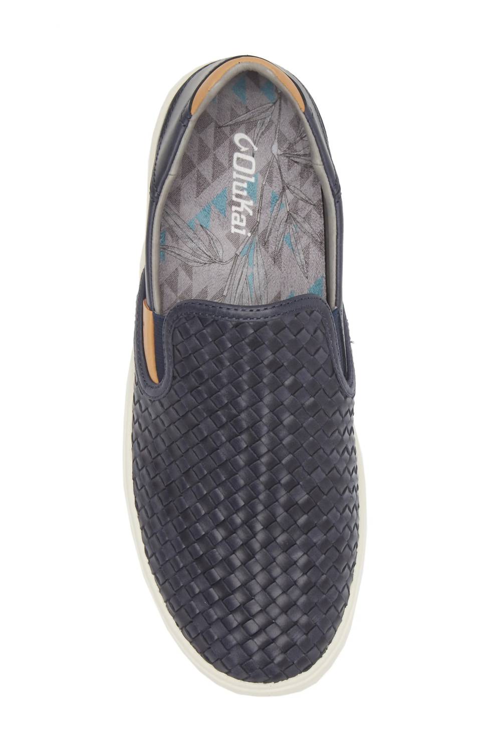 Elevate your spring wardrobe with the OluKai Men's Lae'ahi Lauhala Shoes, a minimalist sneaker crafted in Trench Blue. These dapper sneakers boast a hand-woven lauhala mat design using antiqued and burnished leather, ensuring each pair has a unique appearance. Country of origin details are omitted, but the attention to island craftsmanship is clear. Perfect for vacations and casual outings, these flat sneakers feature a round toe and flat heel, making them comfortable yet stylish.