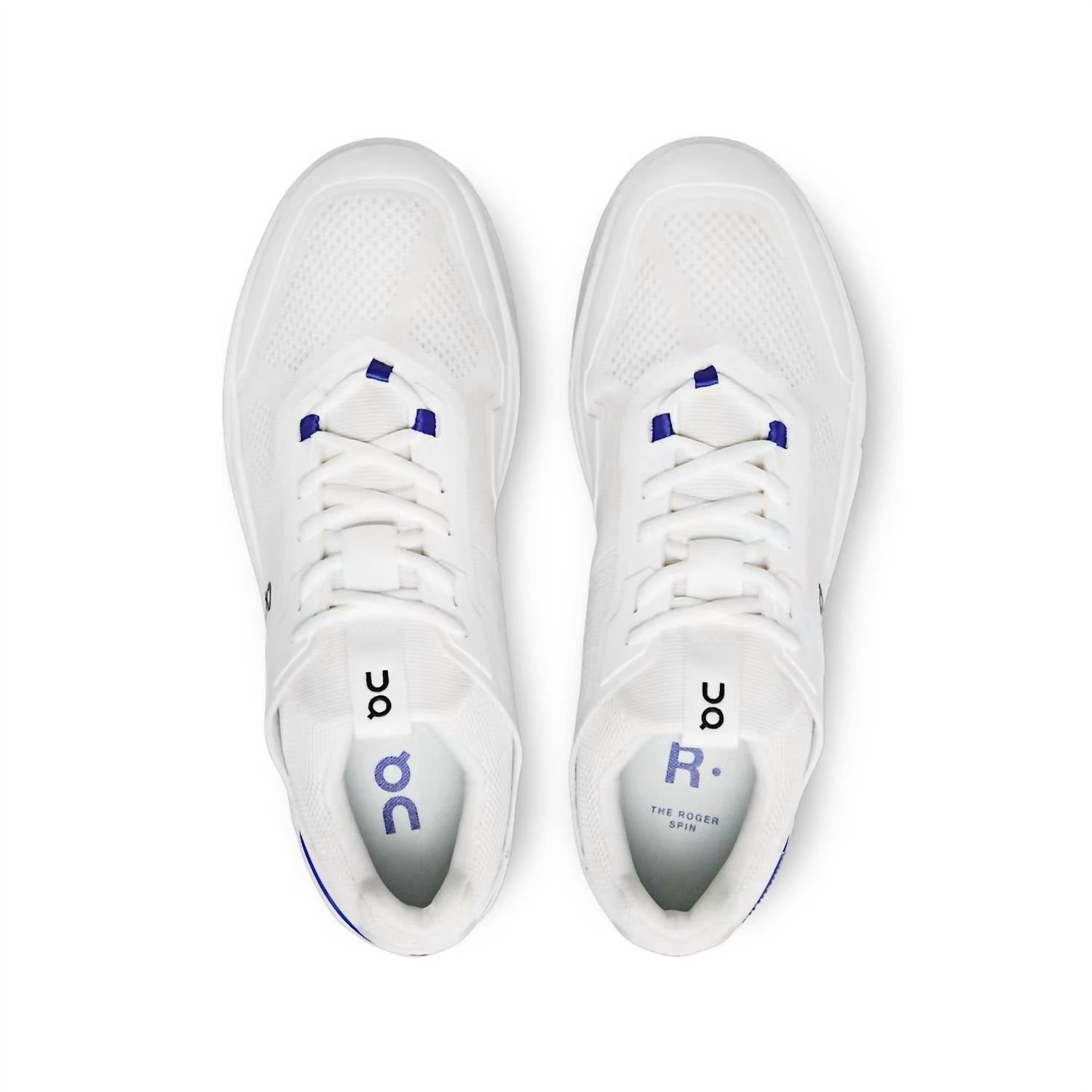 Discover the Men's The Roger Spin Sneaker by On Cloud, a fusion of style and performance in a sleek White Indigo hue. Designed with a breathable engineered mesh upper for ultimate cool comfort, this sneaker features CloudTec® cushioning for superior impact absorption. The updated, anatomically-considered design equips your feet with a TPU-injected Speedboard® to enhance forefoot flex. At a weight of 340.7g, this versatile athleisure sneaker takes you seamlessly from work to workout and beyond.