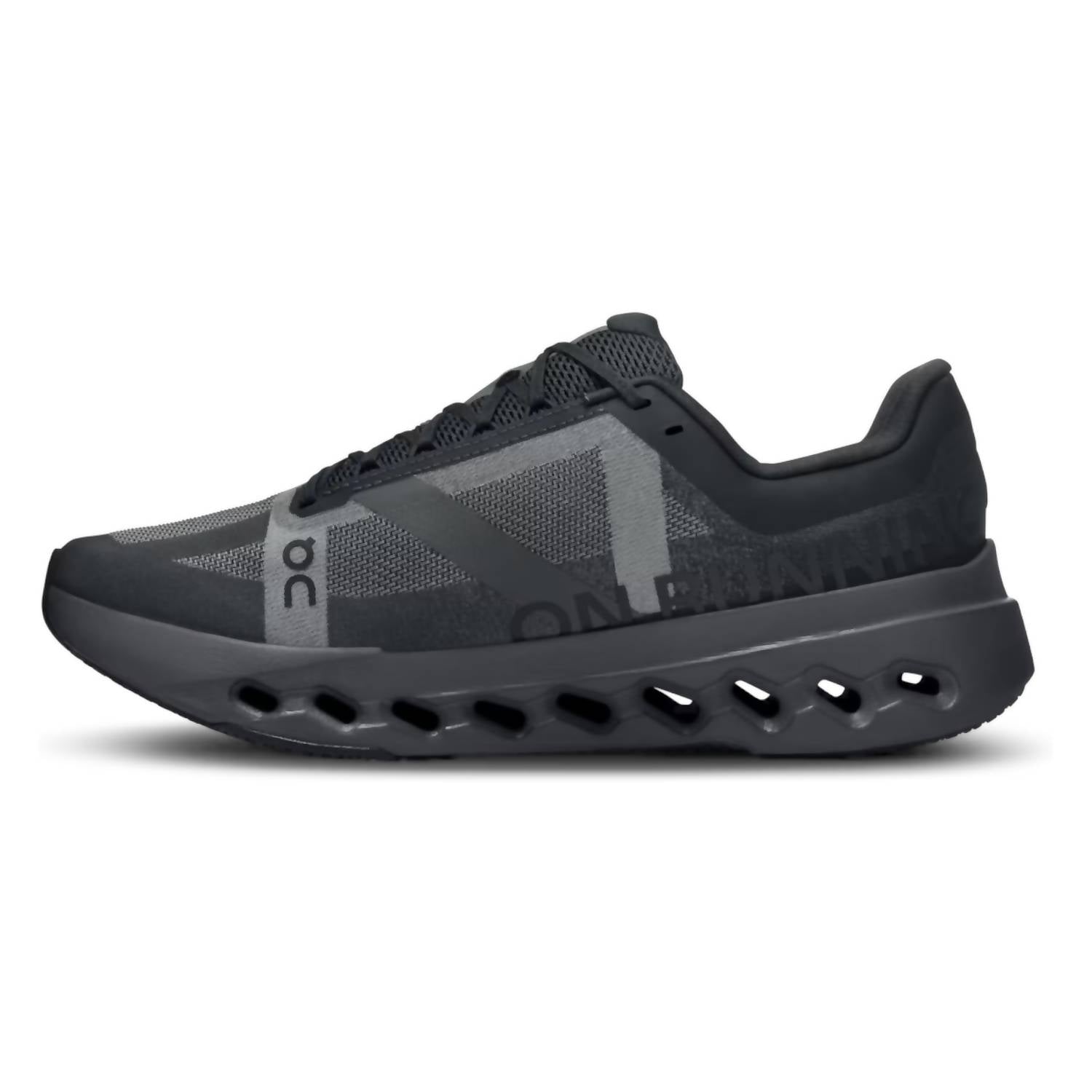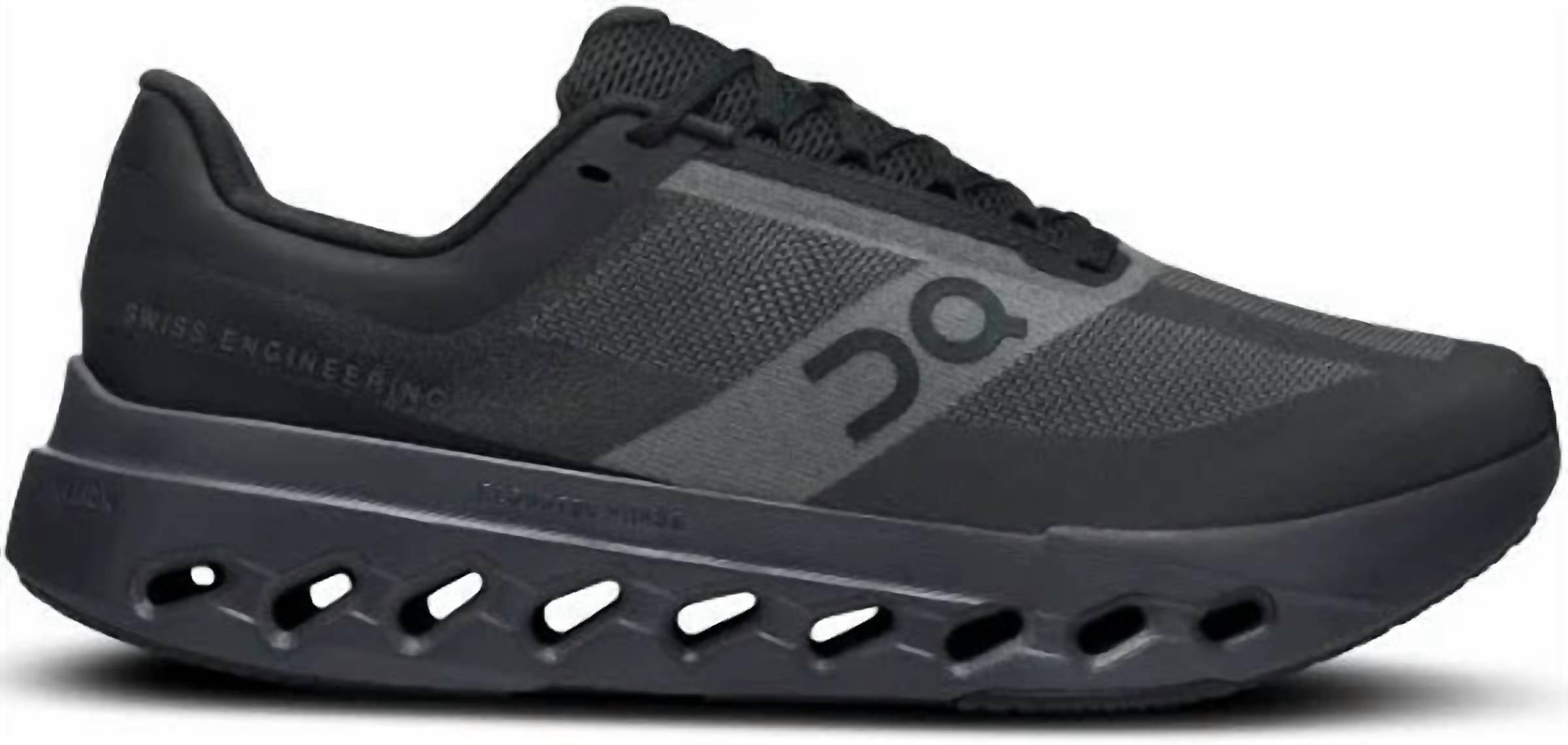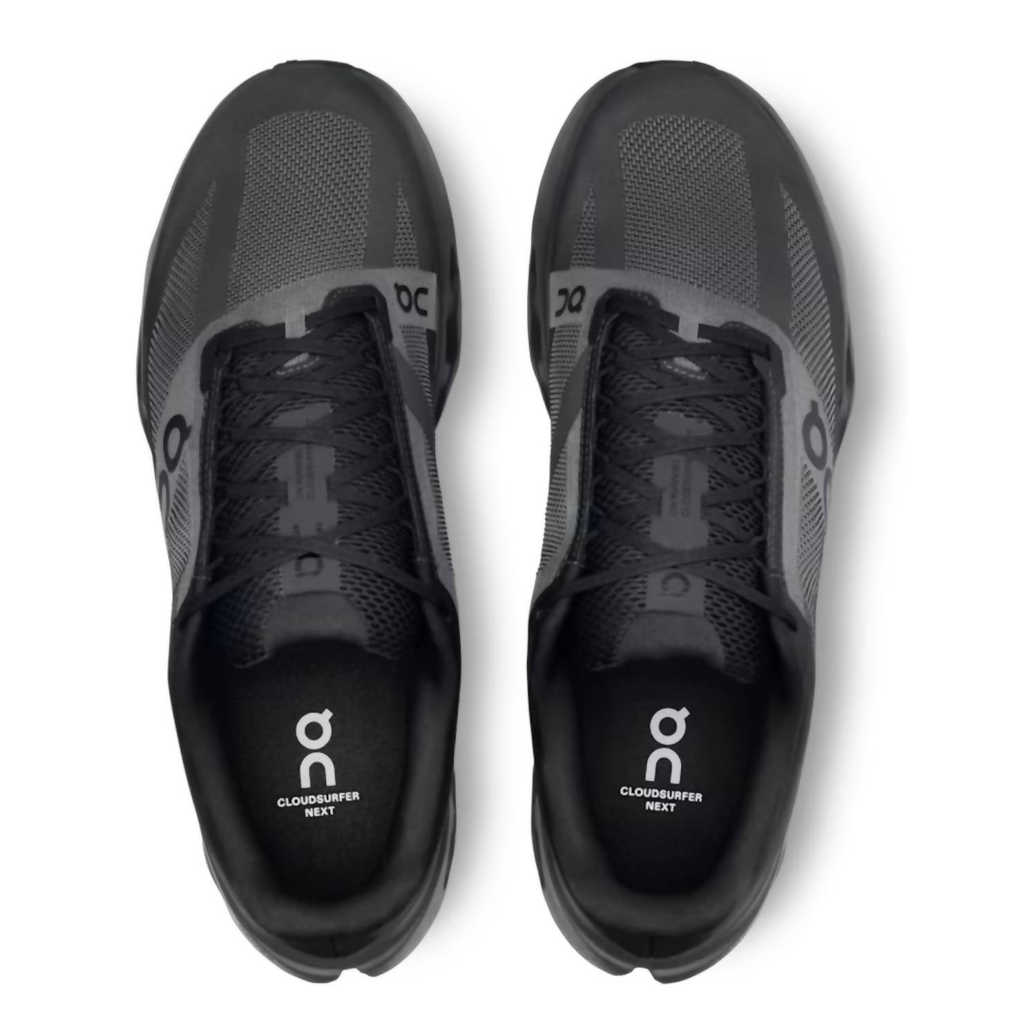 Experience effortless runs with the Men's Cloudsurfer Next Running Shoes by On Running, available in a sleek Black/Eclipse colorway. These athletic shoes feature a lightweight engineered woven upper for enhanced agility and a bouncy ride, thanks to the Helion™ superfoam midsole. The CloudTec Phase® cushioning offers smooth heel-to-toe transitions, while rubber pads on the outsole ensure durability and grip. Materials include Polyamide, Polyester, and Elastomeric Polyester, with a round toe shape and low heel height, ideal for fitness and workout occasions.