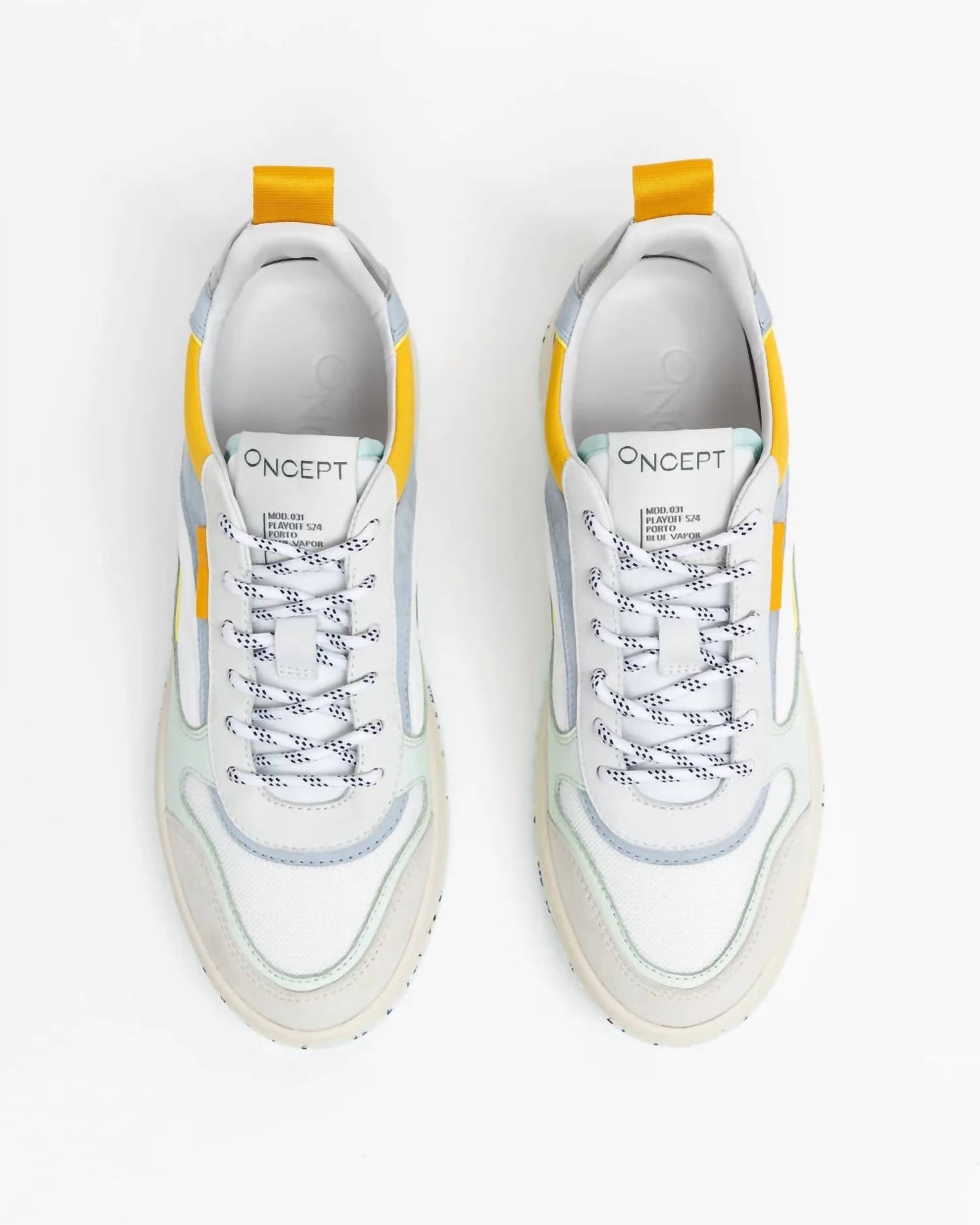 Introducing the Women's Porto Sneaker by Oncept in Blue Vapor, a contemporary take on classic silhouettes that embraces innovation. Crafted with a premium blend of materials including LWG-rated leather and Galactic recycled mesh, this sneaker offers both sustainable style and ultimate comfort. Featuring a signature Re[Speckled rubber outsole, it embodies streetwear trends perfect for spring travel. Designed with a flat heel under 1 inch and a round toe shape, the Porto Sneaker delivers on conscious fashion and everyday versatility.
