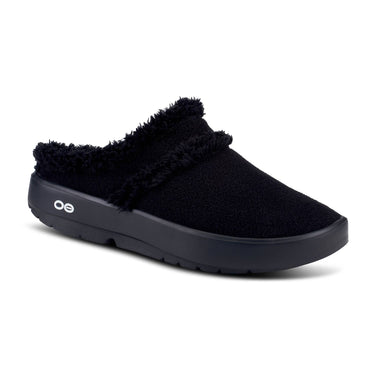 Experience unparalleled comfort with the Women's Oocoozie Mules in Black by OOFOS, perfect for all-day indoor lounging and quick errands. These slip-on shoes feature a vegan sherpa upper that is not only warm but also recyclable and machine washable. Utilizing OOFOS' proprietary OOfoam™ technology, these mules absorb 37% more impact, significantly reducing stress on your feet and joints. The round toe shape and medium width ensure a comfortable fit, making them an essential addition to your footwear collection.