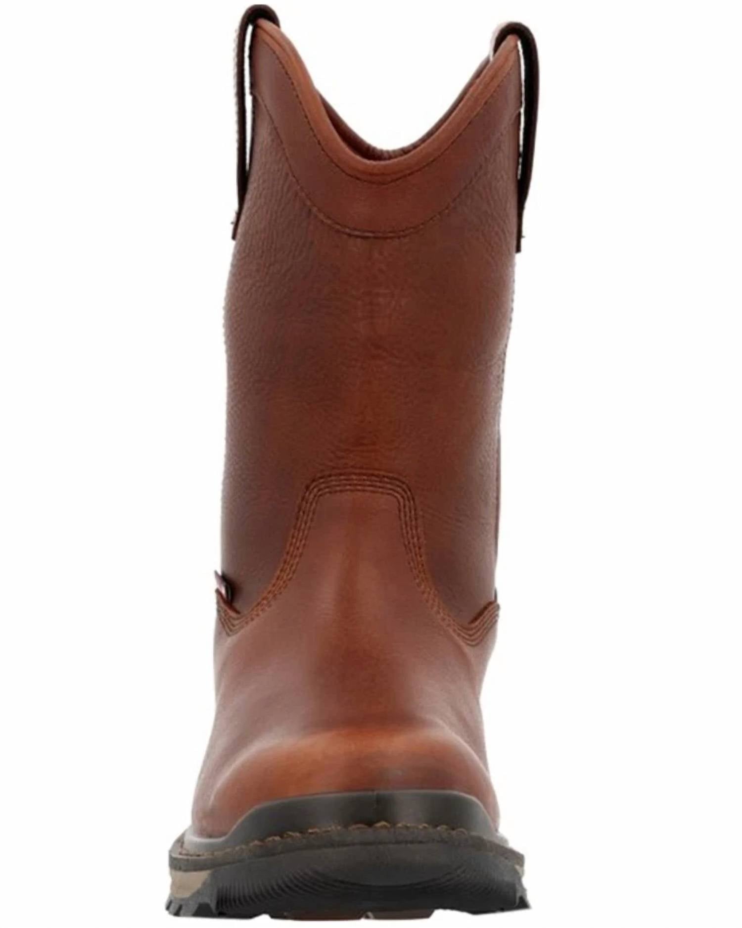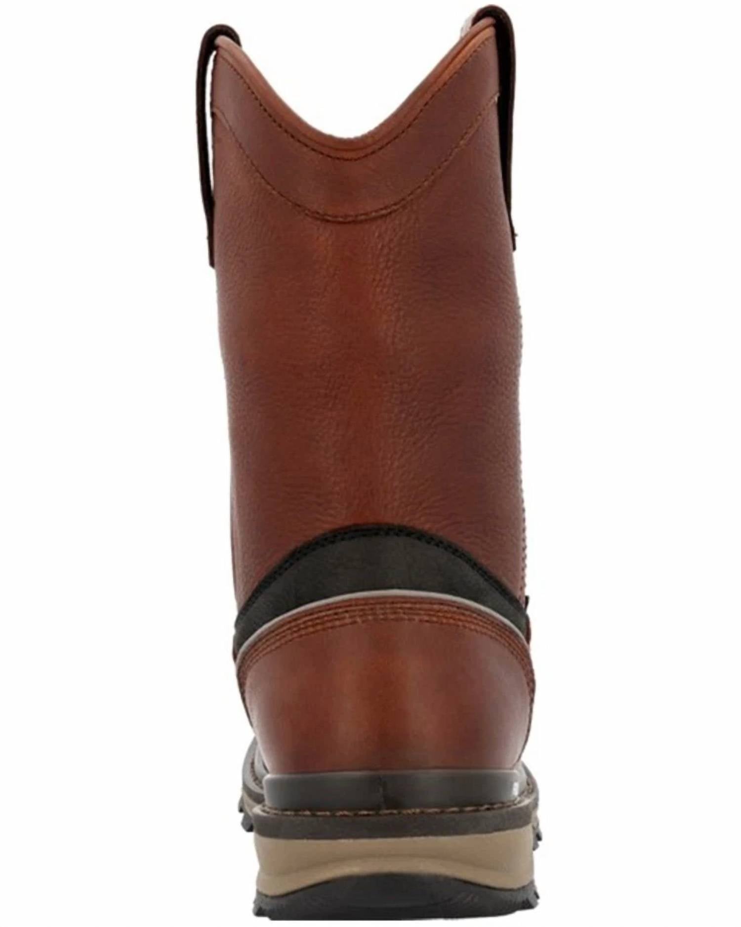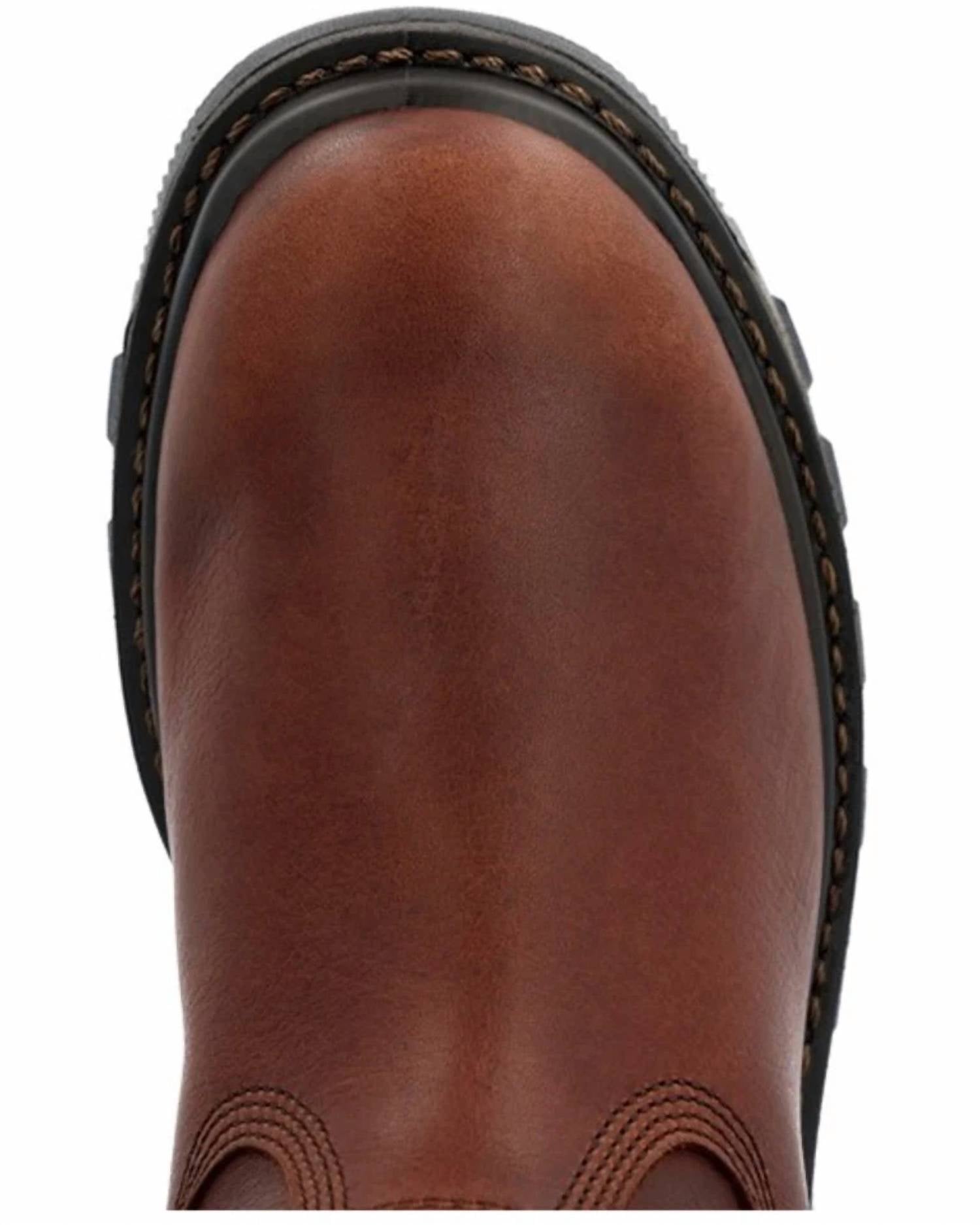Introducing the Men's Rams Horn Waterproof Boots by Rocky, perfect for your next vacation in the fall season. Crafted from durable leather with a stylish brown finish, these boots offer a round toe shape and a chunky heel for both comfort and support. Designed for men, these boots provide reliable protection against the elements while maintaining a fashionable edge.