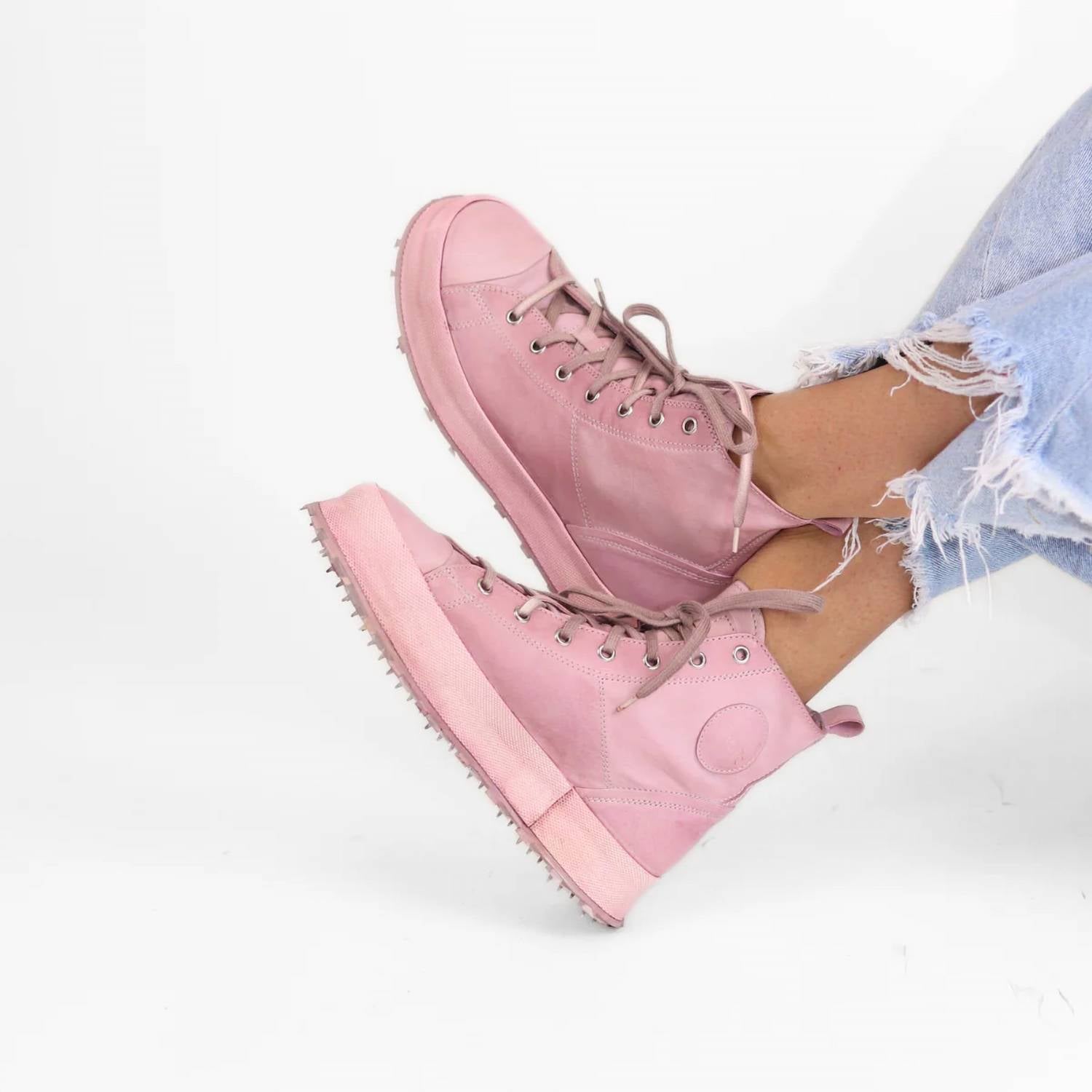 Designed for the modern traveler seeking contemporary streetwear appeal. Crafted in Italy with high-quality leather. Showcase a chic rose hue. Lace-up closure perfectly complements the round toe and platform heel, offering a heel height of 1.25 inches for comfortable elevation. Combining artistry and casual flair, your go-to sneakers for fall adventures.