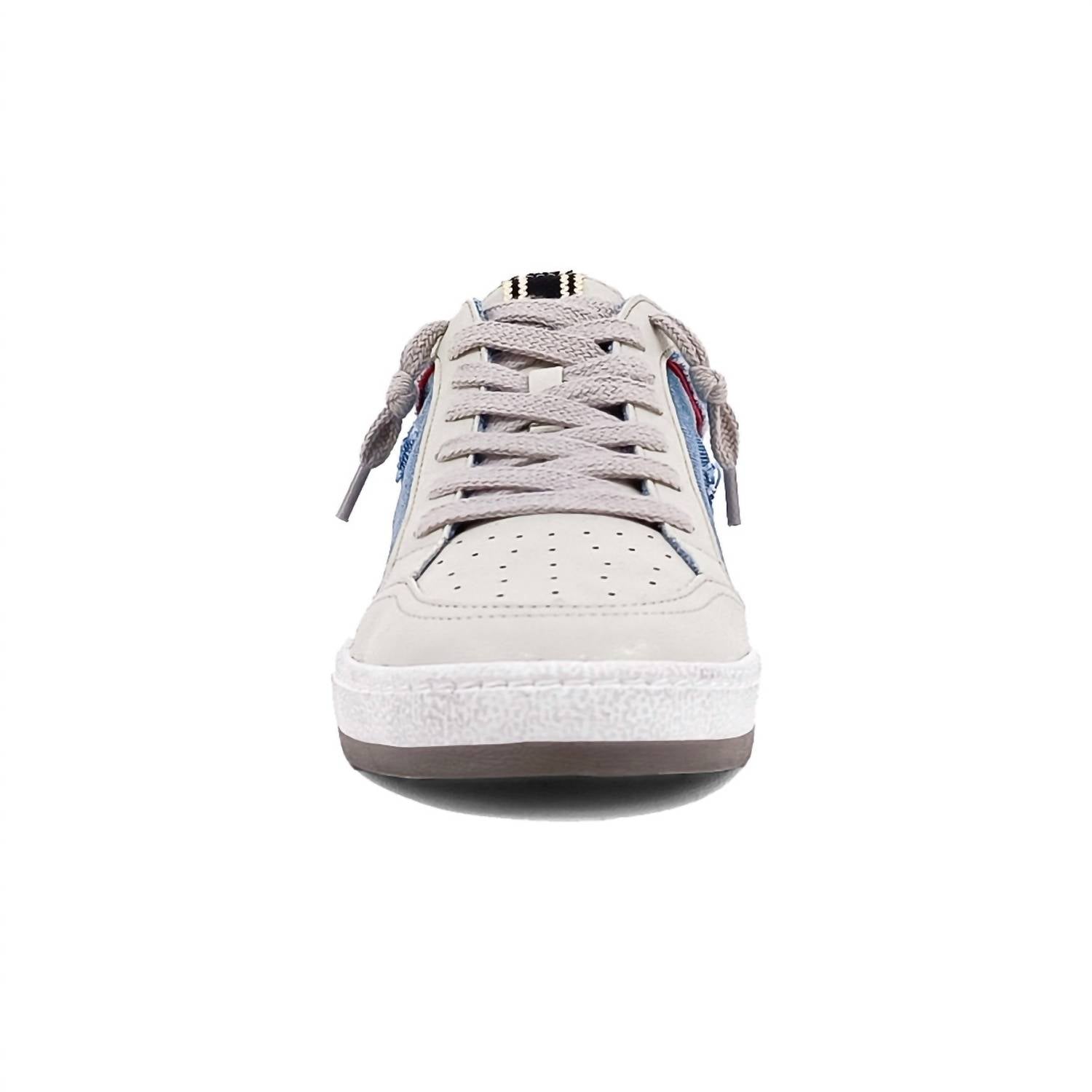 Offer a modern twist on vintage classics. Featuring a striking combination of nude faux leather and blue denim distressed fabric. Denim-colored sneakers are designed with a round toe and flat heel. Unique distressed sole, comfortable look.