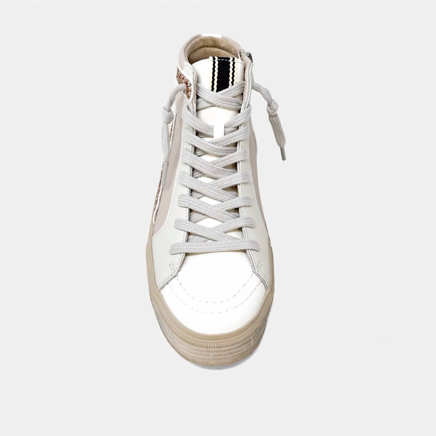 Step up your sneaker game with the Women's Rooney Sneakers by SHU SHOP, a stylish twist on vintage basketball footwear. Crafted in a unique Mushroom hue, these high-tops feature a striking mix of faux leather, glitter, and suede panels adorned with colorful embellishments. Their round toe design ensures comfort and versatility, making them a must-have addition to any wardrobe.