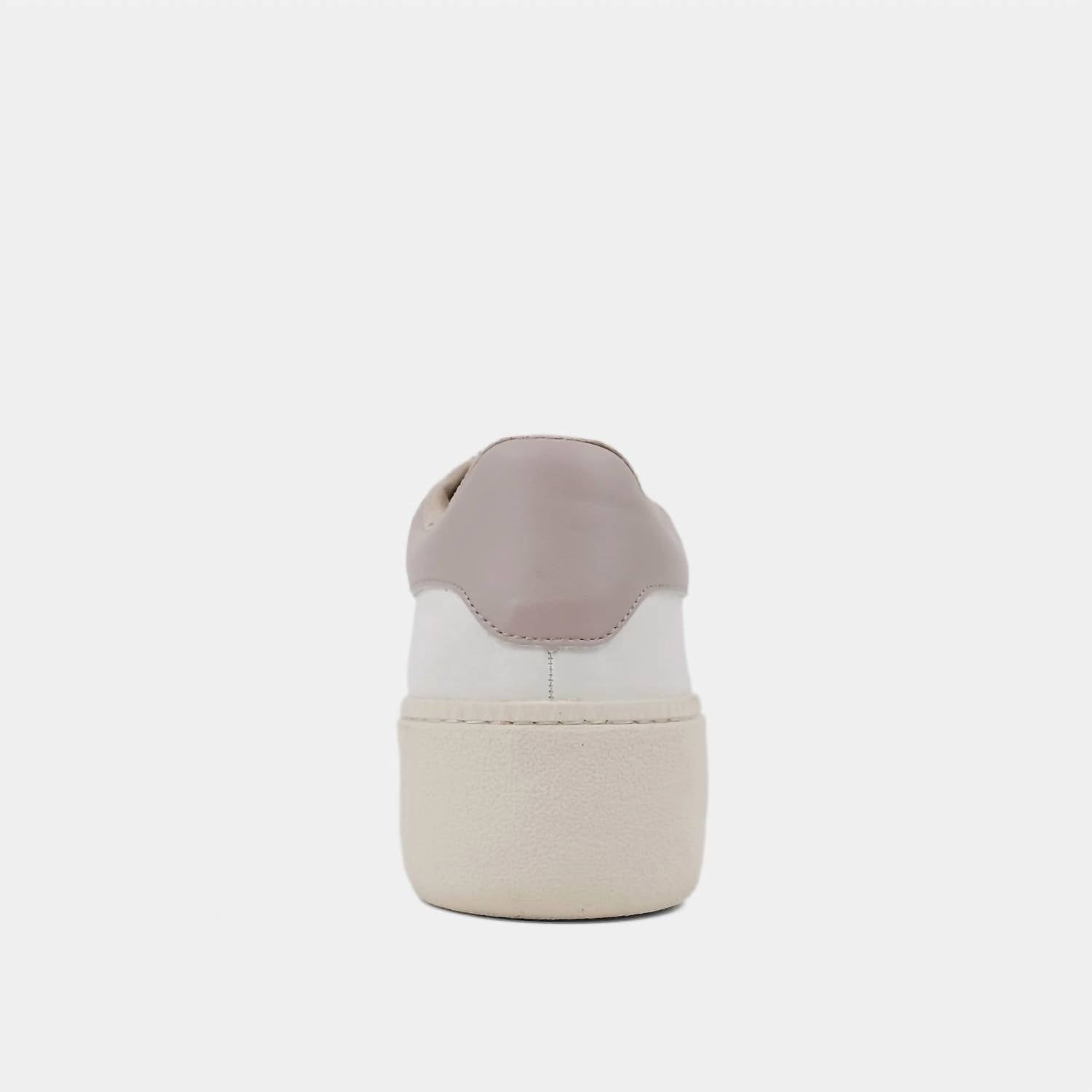 Introducing the Women's Sally Sneakers by SHU SHOP, a perfect blend of style and comfort. These mushroom-colored sneakers are crafted from high-quality faux leather featuring a chic white body with vibrant-hued panels and a contrasting nude minimalistic heel tab. The tall, chunky rubber platform and color-block flat heel provide a trendy look, while a padded insole assures comfort. With a round toe shape, these sneakers are a fashionable choice for any outfit.