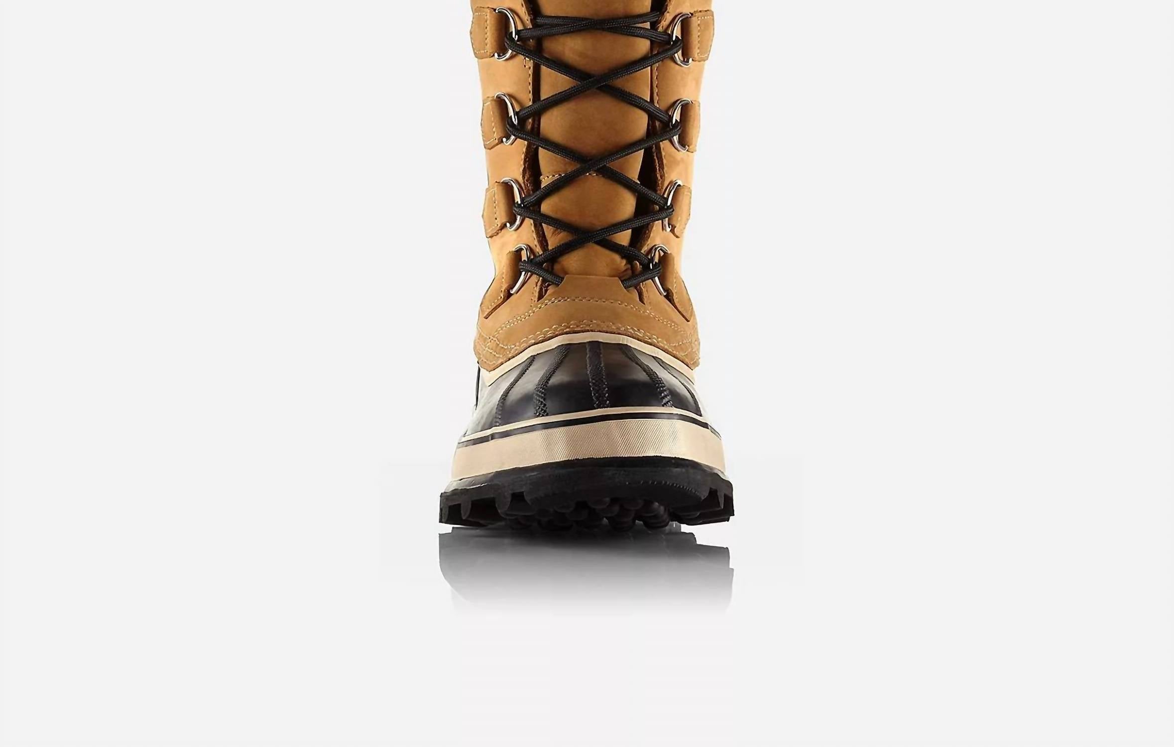 Embrace the cold, designed in a buff hue for both style and functionality during winter activities. Featuring a waterproof nubuck upper with a seam-sealed construction. Crafted to provide superior comfort and traction. Insulated with synthetic materials and include a removable 9 mm washable recycled felt inner boot with Sherpa pile snow cuff. With a low block heel of 1 inch and a round toe shape, perfect for trudging through heavy snow. Completed with a handcrafted waterproof vulcanized rubber shell and Sorel aero-trac non-loading outsole.