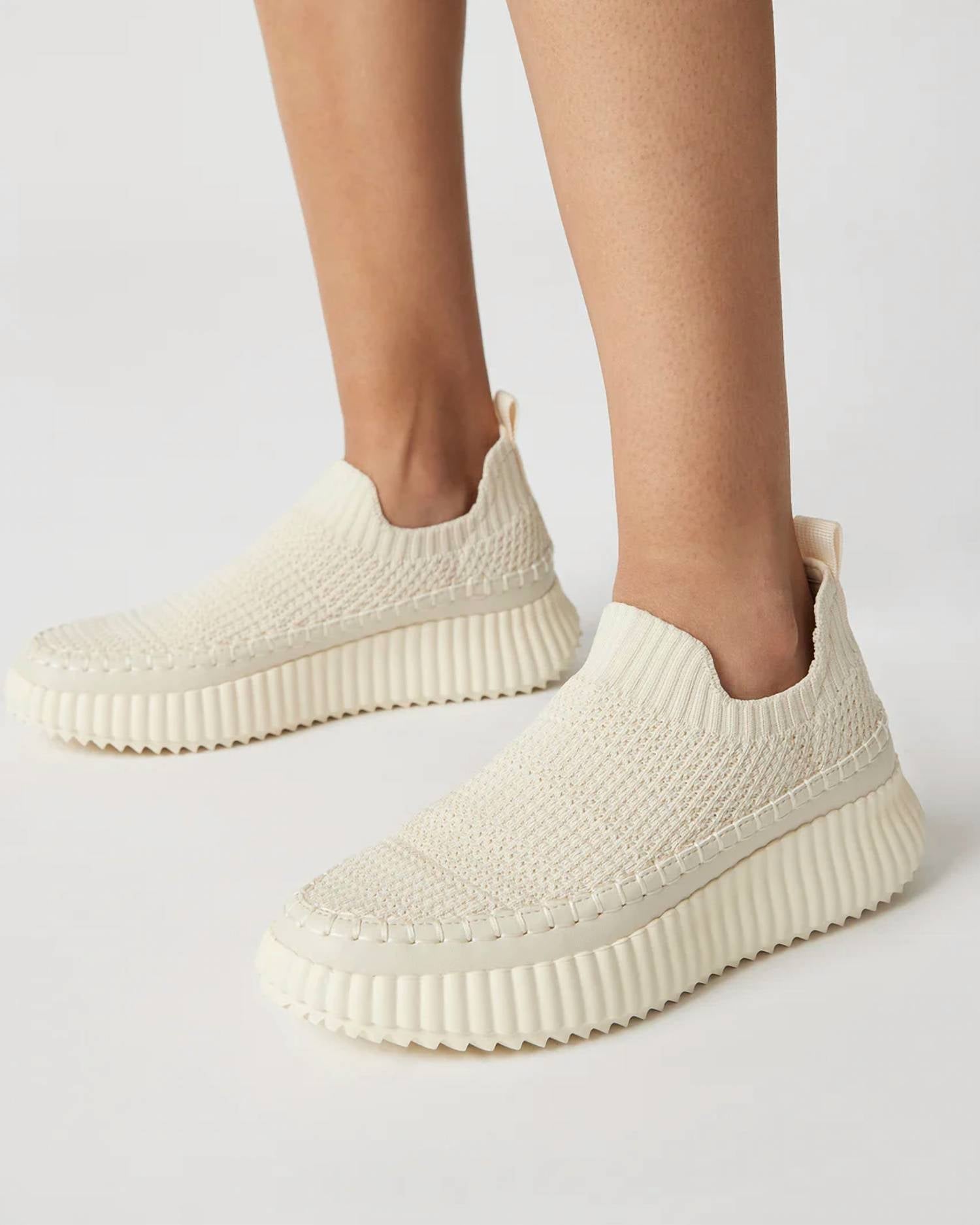 Step into the effortlessly chic. Modern design meets casual comfort. Featuring a slip-on style. Boast a beige waffle weave fabric upper that stretches for a perfect fit. Platform sole, distinguished by its 1.25-inch height and wide vertical ribbing, ensures cushioned steps. Enhanced with whipstitching around the welt. Crafted with a textile upper, lining, and sock complemented by a synthetic sole for long-lasting wear. Designed with a round toe and low platform heel. Promises both support and sophisticated style.