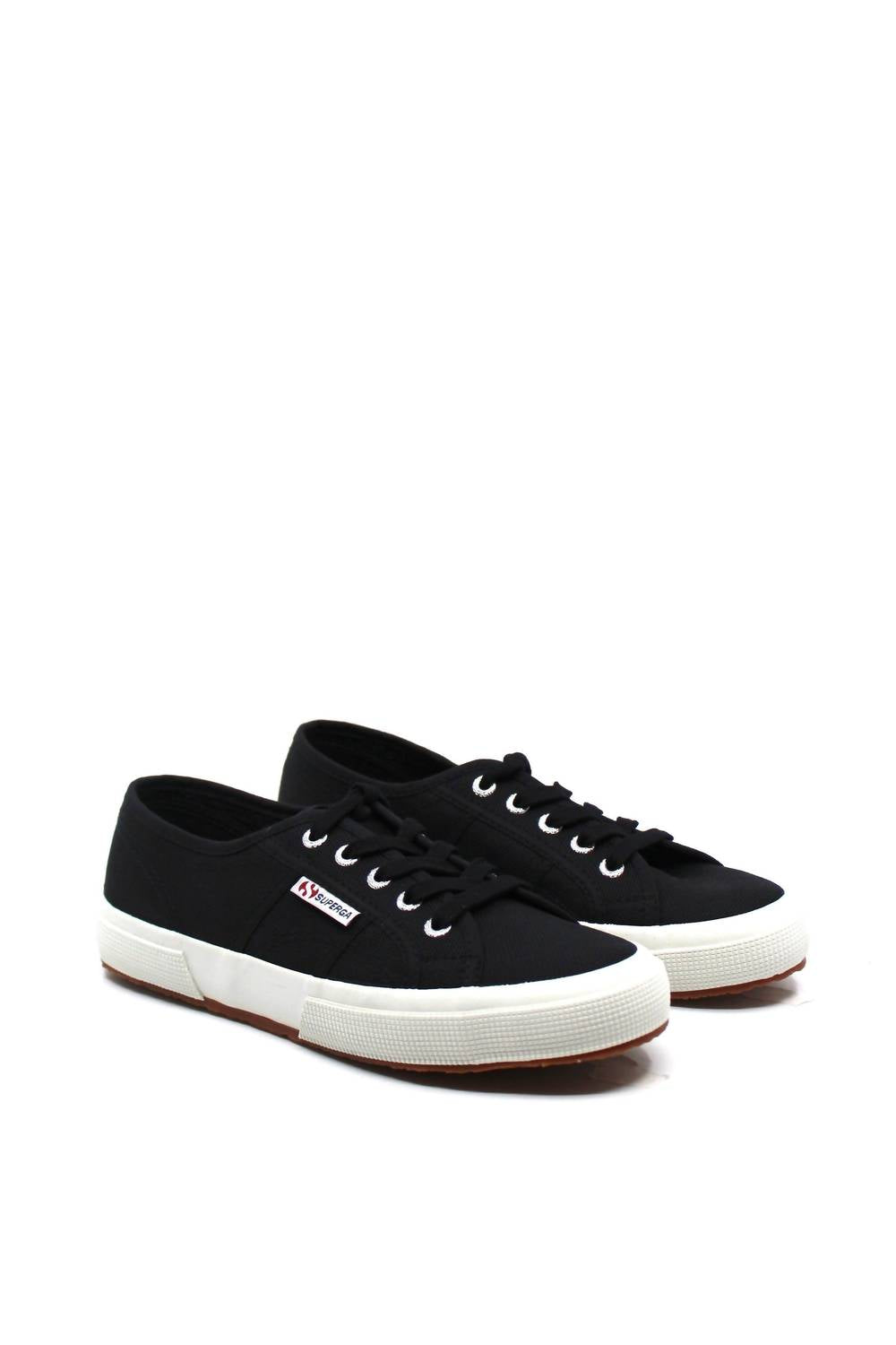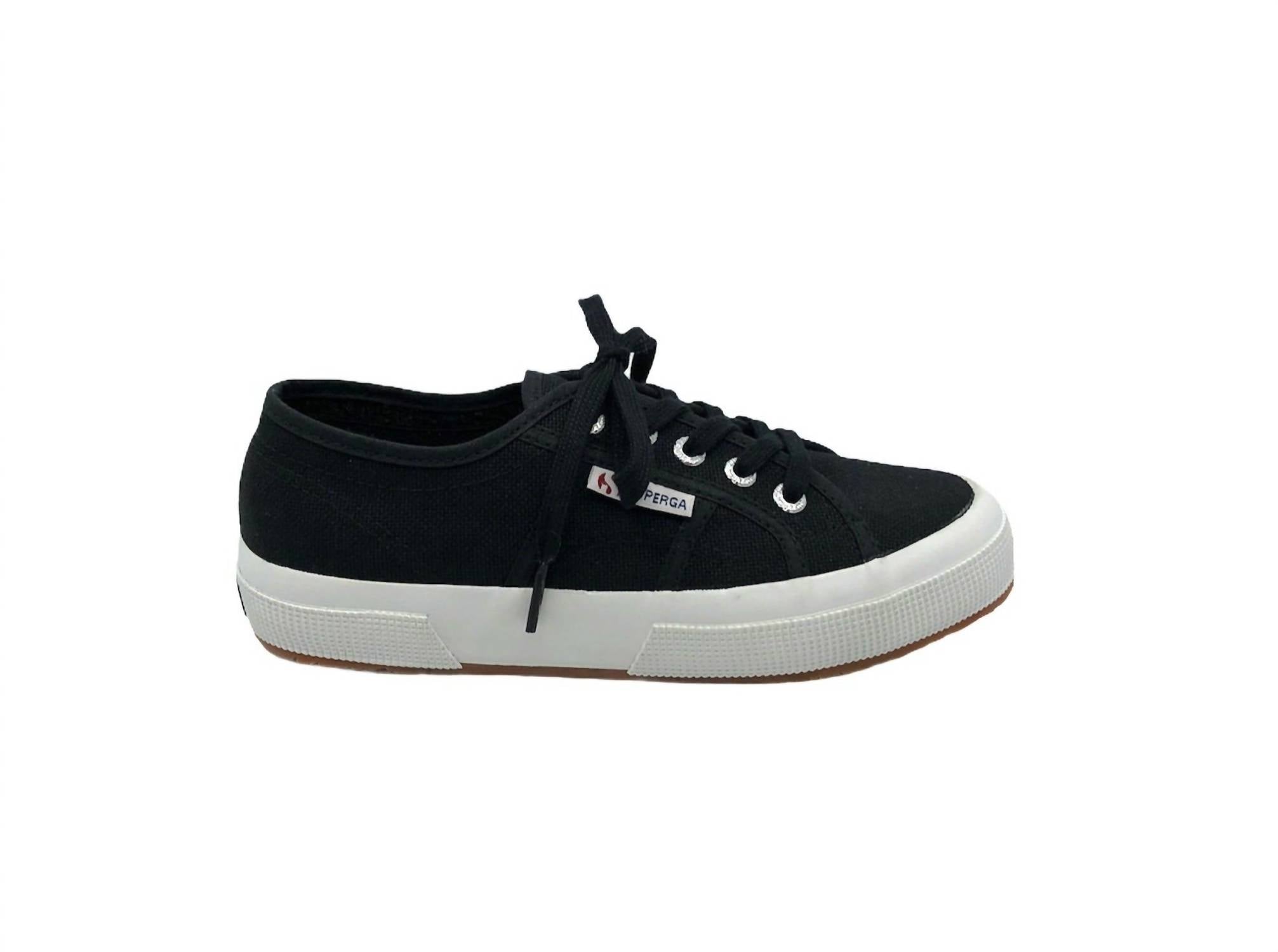 Step out in style with the Women's 2750 Cotu Classic Black Sneakers by SUPERGA, boasting a timeless design perfect for any wardrobe. These sneakers feature a sturdy cotton unlined canvas upper in a sleek black hue and a lace-up closure with metal eyelets for an adjustable fit. Enjoy all-day comfort with a cushioned footbed, while the natural rubber, crepe-textured outsole ensures traction and durability. Platform height is approximately 1", showcasing a flat heel design that pairs effortlessly with denim or dresses alike.
