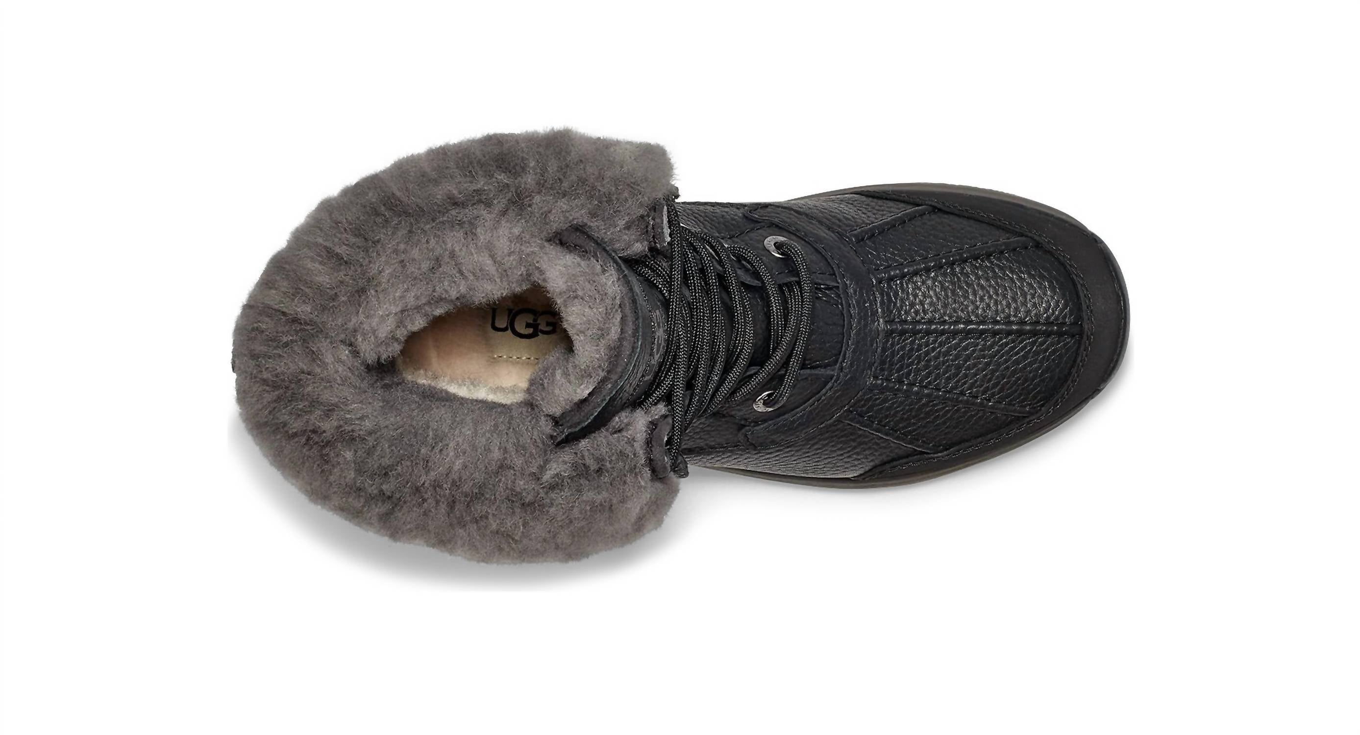 Meet the UGG Women's Adirondack III Waterproof Boots, your ultimate companion for winter adventures in sleek black leather. Designed for freezing temperatures, these boots feature a 7" shaft height with waterproof leather and suede, DryTech technology, and a gusseted tongue for superior protection against the elements. Inside, enjoy the warmth of 17mm UGGpure™ wool and 8mm sherpa lining, along with a cushioned enerG Comfort System footbed. Best suited for heavy rain and snow, these boots ensure style and functionality with a White Spider Rubber outsole for enhanced traction.