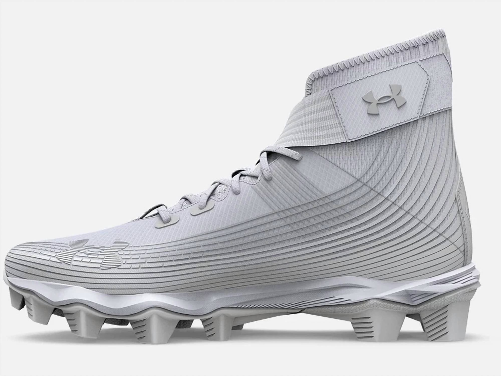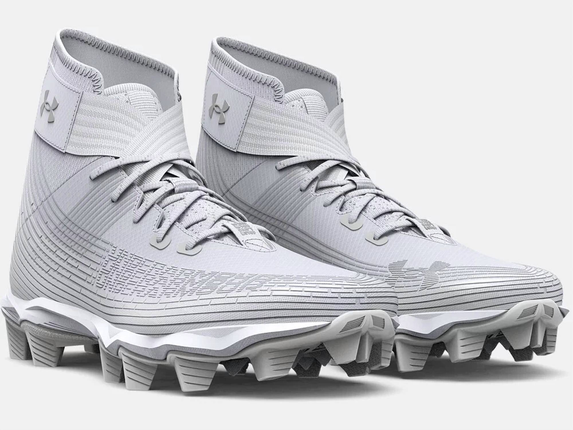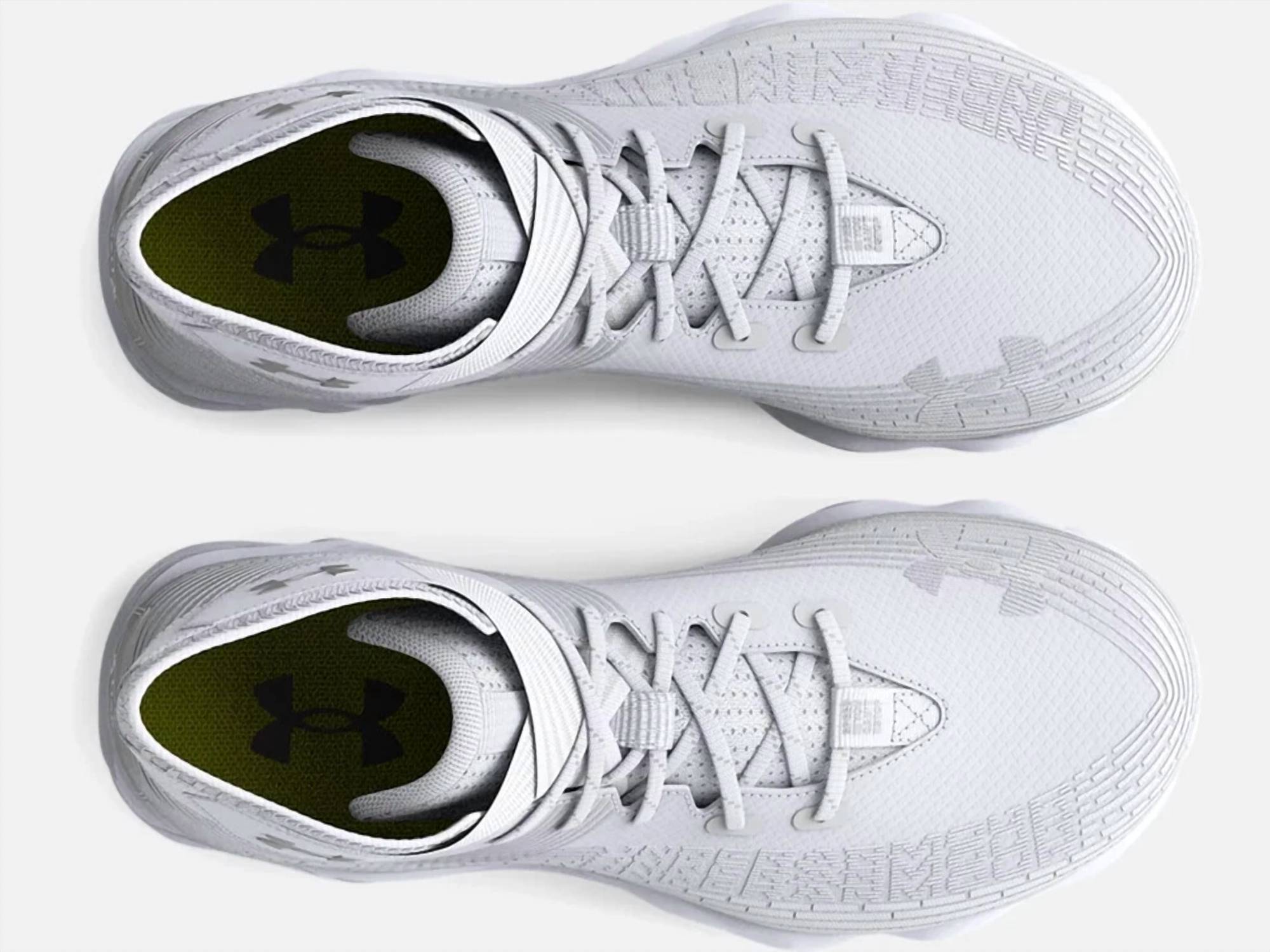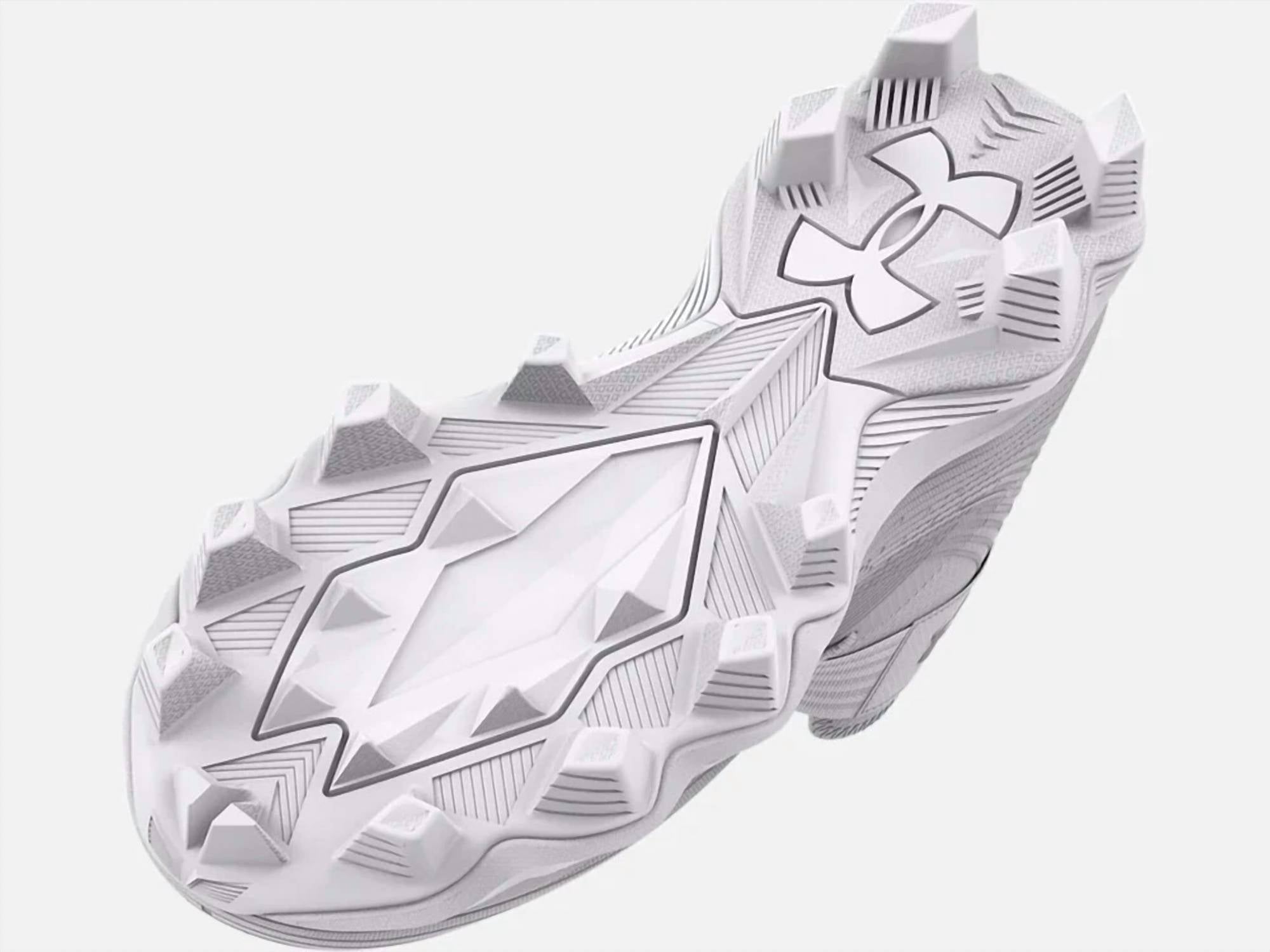 Meet the Kid's Highlight Franchise Jr Shoes by Under Armour, perfect for active toddlers. Crafted with a performance synthetic upper and textile collar, these sneakers offer a lightweight fit with excellent mobility and support. Enhance ventilation through the open-holed mesh tongue, while the die-cut EVA sockliner ensures comfort and durability. The rubber molded cleats deliver aggressive traction on all surfaces, making these shoes ideal for active little ones. Featuring a round toe shape and designed in classic white.