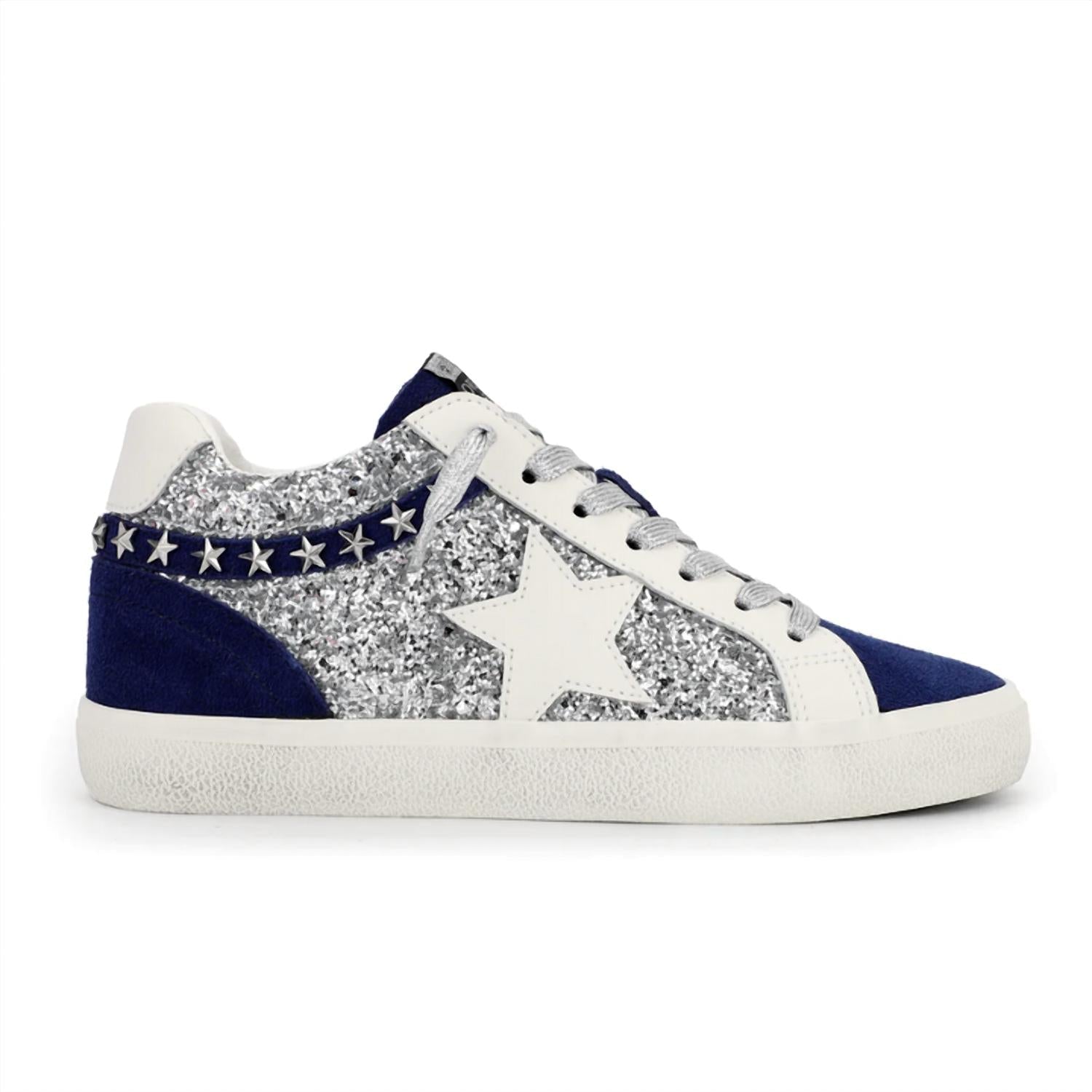 Step into style with the Women's Navy Vamp Sneakers by Vintage Havana, an eye-catching combination of blue and silver glitter. These sneakers feature a slip-on design for easy wear and a round toe shape, complete with decorative silver laces. Enjoy secure footing with a traction signature outsole and a flat heel style for all-day comfort. Proudly made with quality craftsmanship, these shoes fit true to size, ensuring a perfect fit straight from the box.