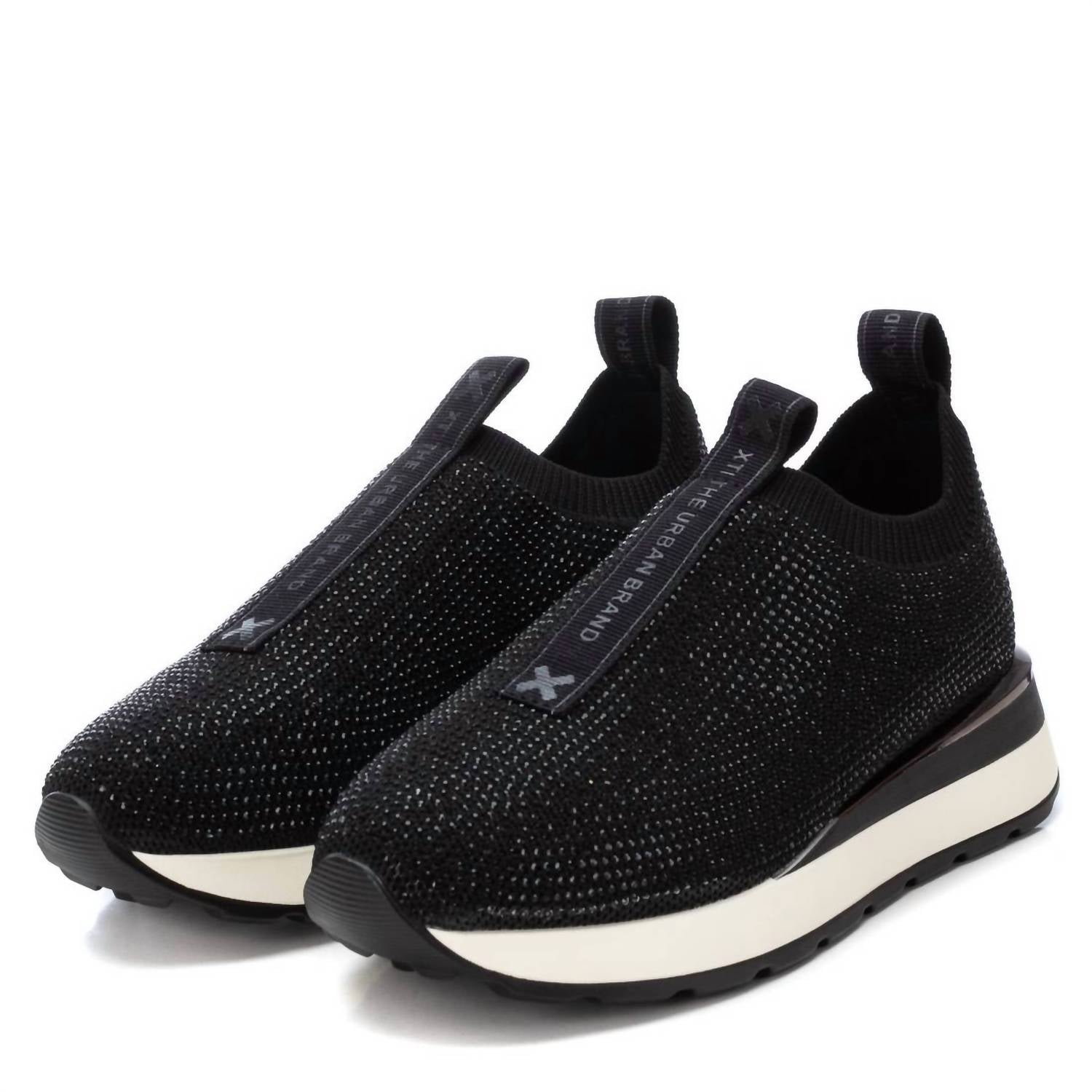 Step up your style with the Women's Casual Sneakers by Xti, designed in chic black for a versatile look. Crafted with a polyester fabric upper adorned with decorative rhinestones, these trainers feature a breathable and padded insole for enhanced comfort. The sneakers boast adjustable laces and a thick, non-slip rubber sole, perfect for daily wear. Enjoy the convenience of a removable insole and the assurance that these shoes are PETA-certified vegan.
