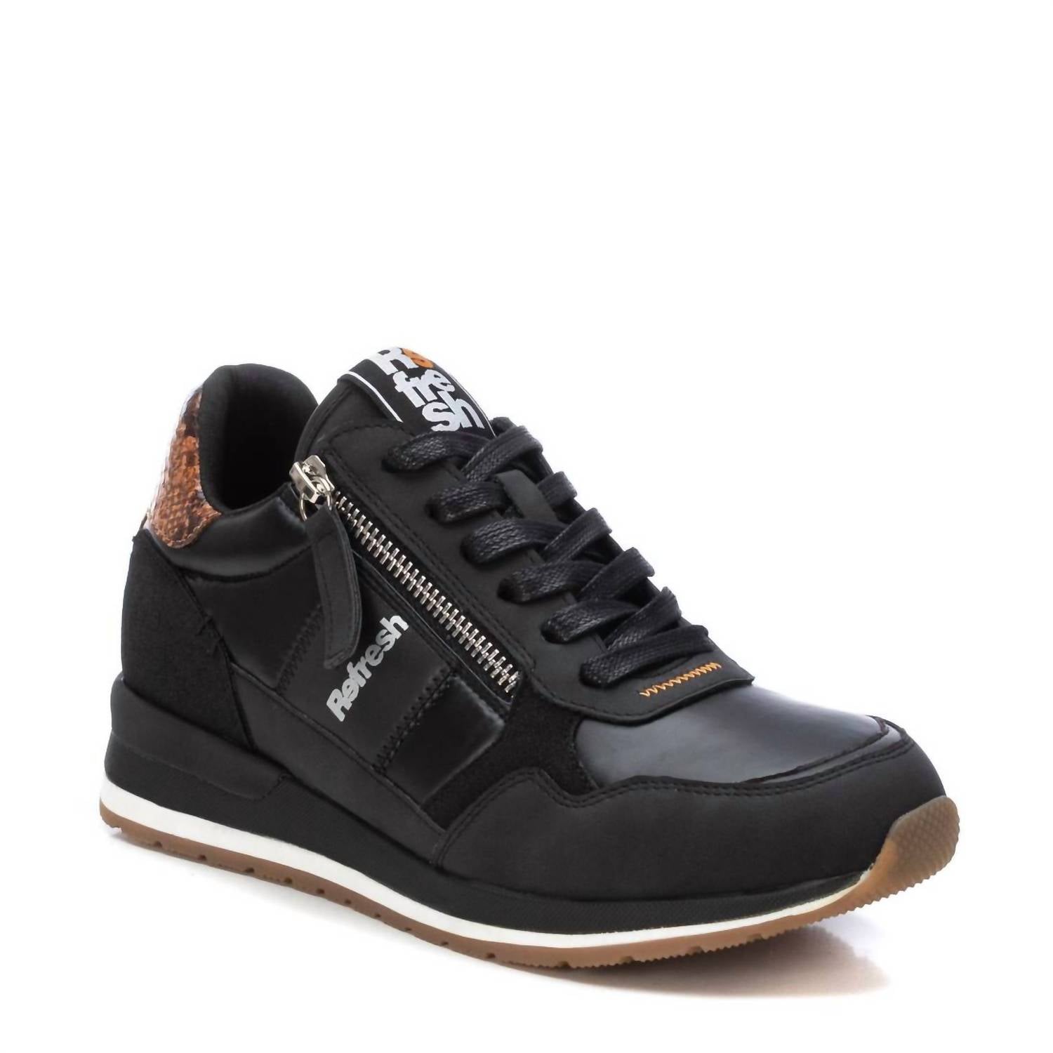 This casual sneaker features a lightweight design, lacing for a secure fit, a side zipper for easy wear, an upper with different textures, a durable non-slip rubber sole, breathable material, and a padded insole for comfort.