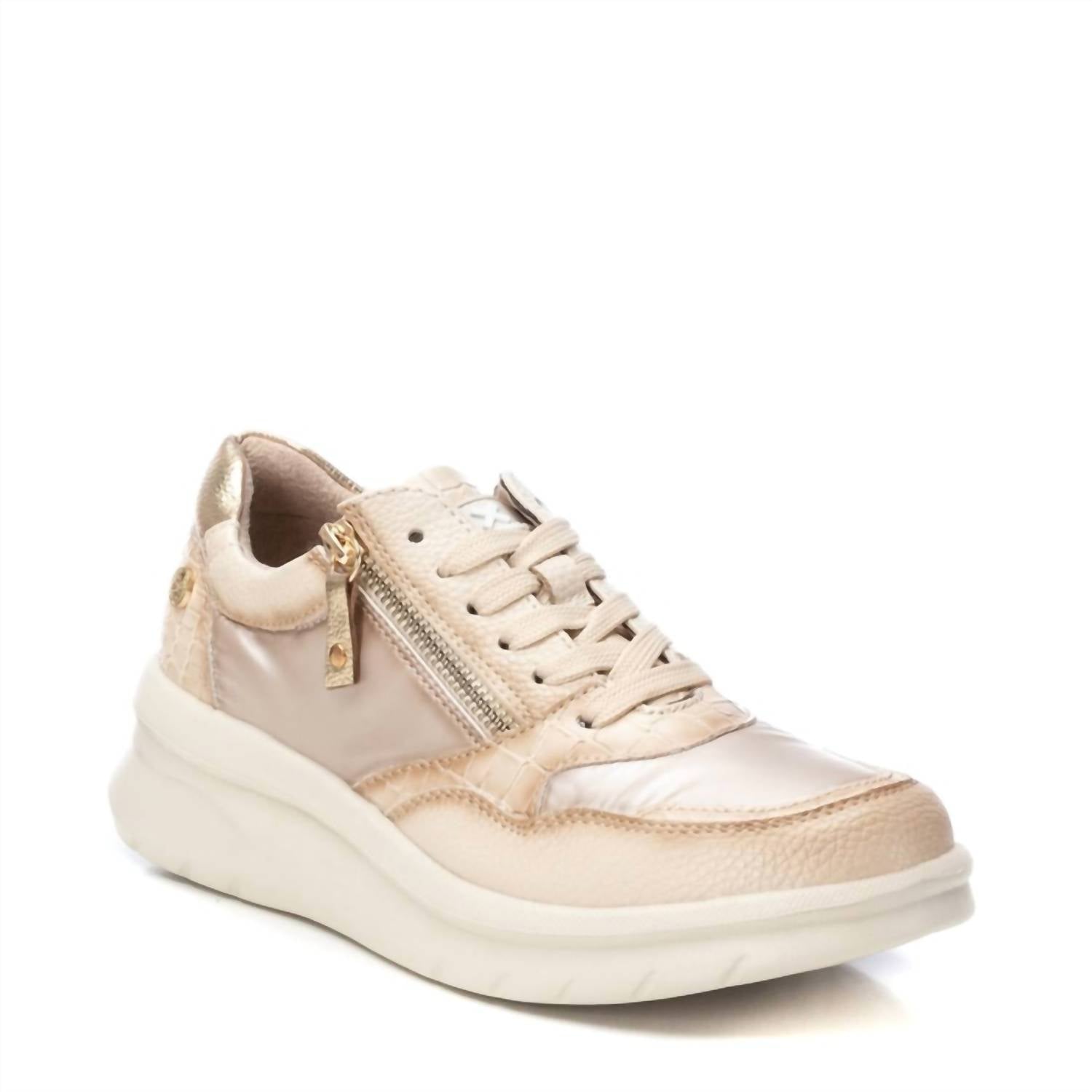 This Trainer Sneaker is crafted from high-quality faux leather with a side zipper and adjustable laces for a snug fit. It features a non-slip rubber sole for grip, removable insole for convenience, and a low wedge heel for added lift. Made with certified vegan materials.