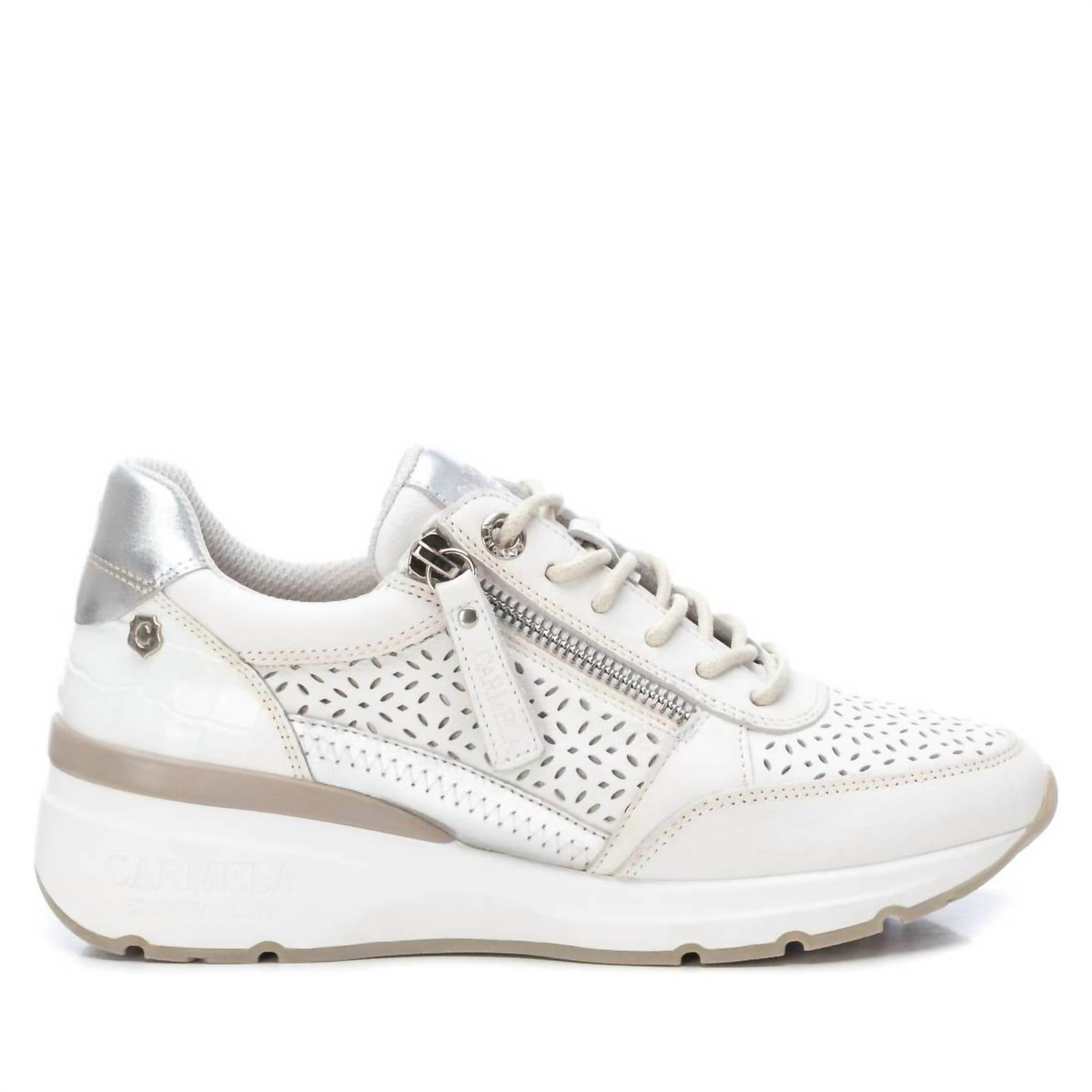 Experience unparalleled style and comfort with Xti's Women's Trainer Sneakers in classic white. These sneakers boast a high-quality leather construction with an openwork design, ideal for the season. They feature a zip fastening for easy wear and a non-slip rubber sole, ensuring both durability and a luxurious feel. Step into fashion-forward footwear from the Carmela Collection and elevate your everyday look.