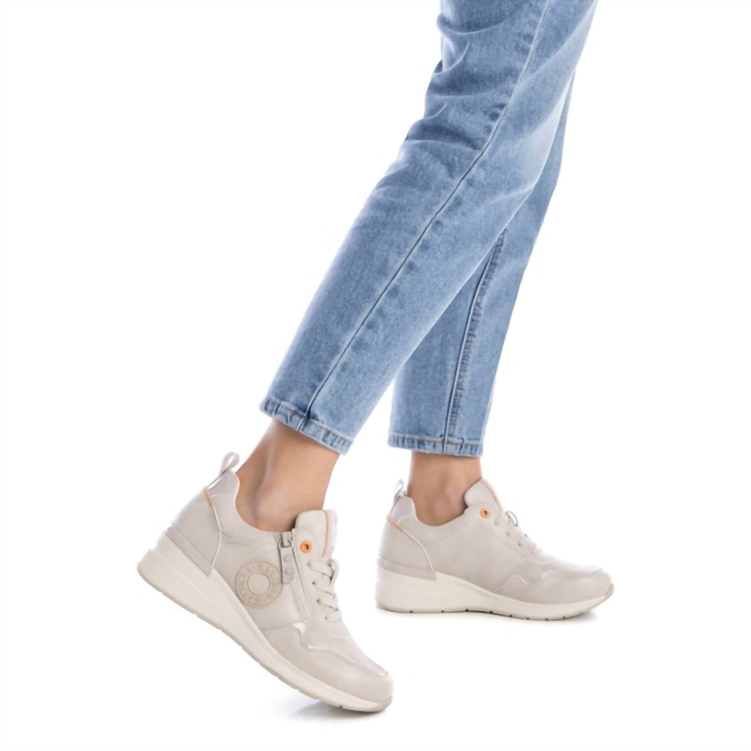 This Wedge Trainer Sneaker is crafted from high-quality faux leather with a side zipper and adjustable laces for a secure fit. It features a comfortable 1.57-inch wedge heel, non-slip rubber sole, and a removable insole for convenience. Made with certified vegan materials.