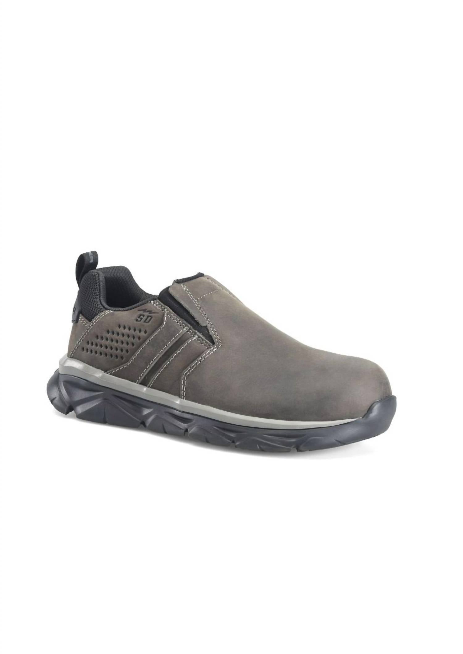 Introducing the Men's Flyweight Composite Toe Slip On Work Shoes by Carolina, designed to blend style with durability in a sleek grey hue. These slip-on sneakers feature a composite safety toe and are Static Dissipative rated for added safety. Made with an Aspen Charcoal Gray leather upper and completed with a mesh lining for comfort. This work shoe includes a removable AG8 Intelli/Sphere and PU Dual-Density Foam Comfort Footbed, all built on a cement construction with an XL Extralight Industrial Plus Outsole that provides slip, oil, and abrasion resistance while being non-marking. Perfect for demanding work environments.