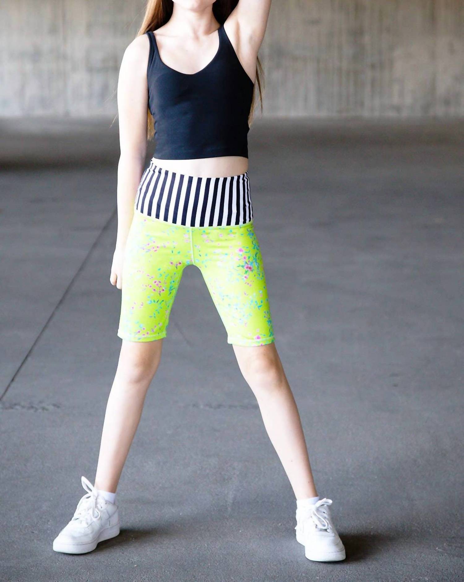 Our printed bicycle shorts are a staple for active girls 7 to 14. CAROLE: green floral print shorts is a Limeapple exclusive and gives a fun update to a classic piece. MARIE: grey tie dye print with contrasting piping, adds a pop of fun to this exclusive Limeapple style. ANDY: multicolor print is a splash of Limeapple exclusive and gives a fun update to the classic piece. The bicycle length gives it extra comfort and coverage and makes a perfect transitional piece from the gym to the playground. Features The wide waistband and continuous draw-cord help keep the leggings in place, so she doesn’t have to pull them up 4-way stretch construction allows for maximum mobility and comfort while maintaining shape Moisture-wicking technology keeps you dry, cool, and comfortable Pre-shrunk and made to give a perfect fit wash after wash Comfortable flat seams to prevent irritation Pilling resistant fabric keeps garments looking new after every wear Smooth fit waistband won’t dig into the skin Hidden pocket for small essentials. Fit Model wears size 7/8. Medium rise.