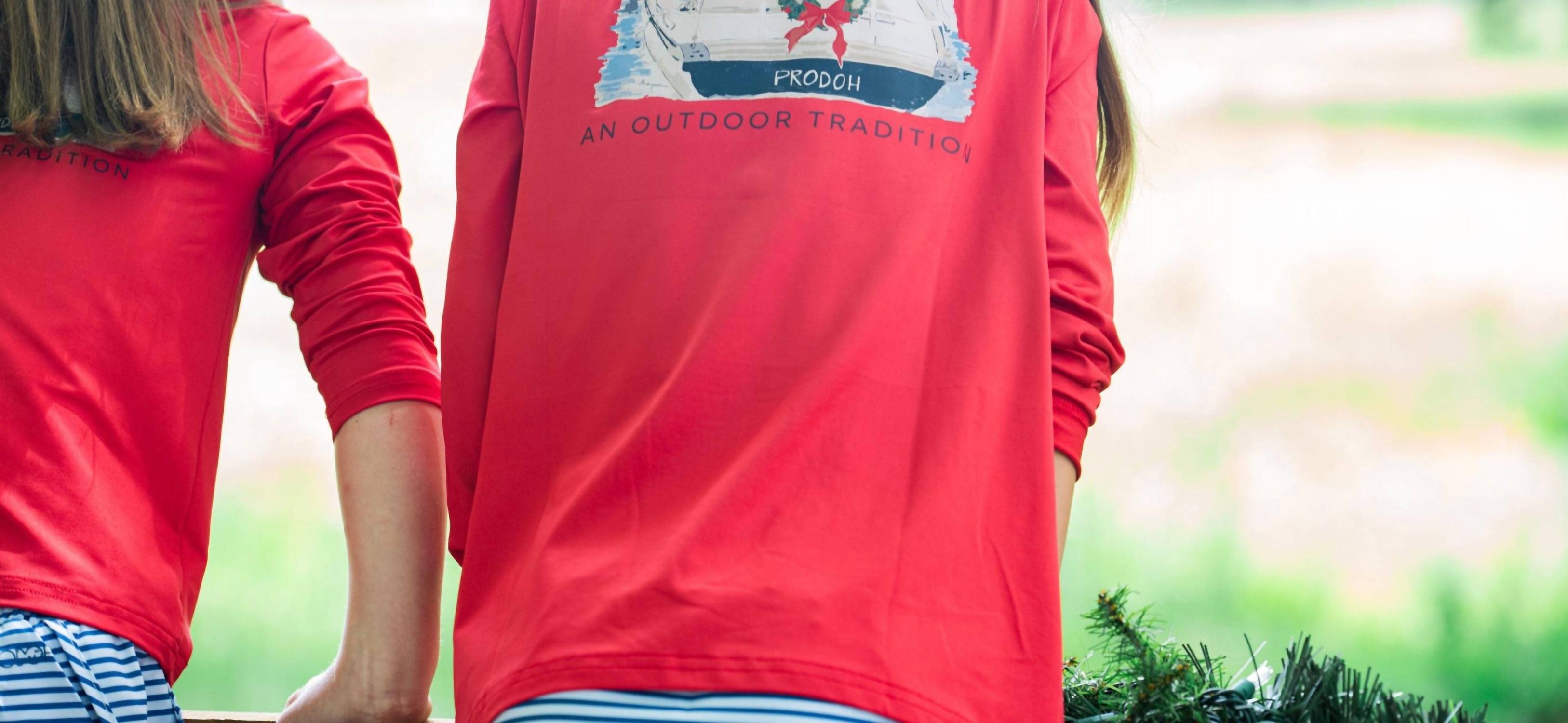 The PRODOH Girl's Long Sleeve Performance Fishing Tee in Winterberry Red is a stylish choice for those vibrant outdoor activities. Crafted from 95% polyester and 5% spandex, this solid, long-sleeve tee offers comfort and protection with UPF 50+. Designed in the USA, it features custom artwork and the brand's signature "Get Back Here Loop" for a unique touch. Easy to care for, simply machine wash and tumble dry to maintain its vibrant look and feel, perfect for any girl's wardrobe.