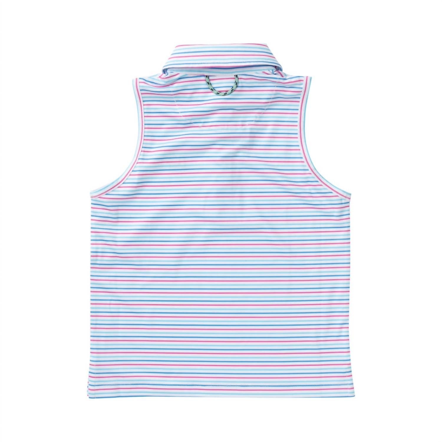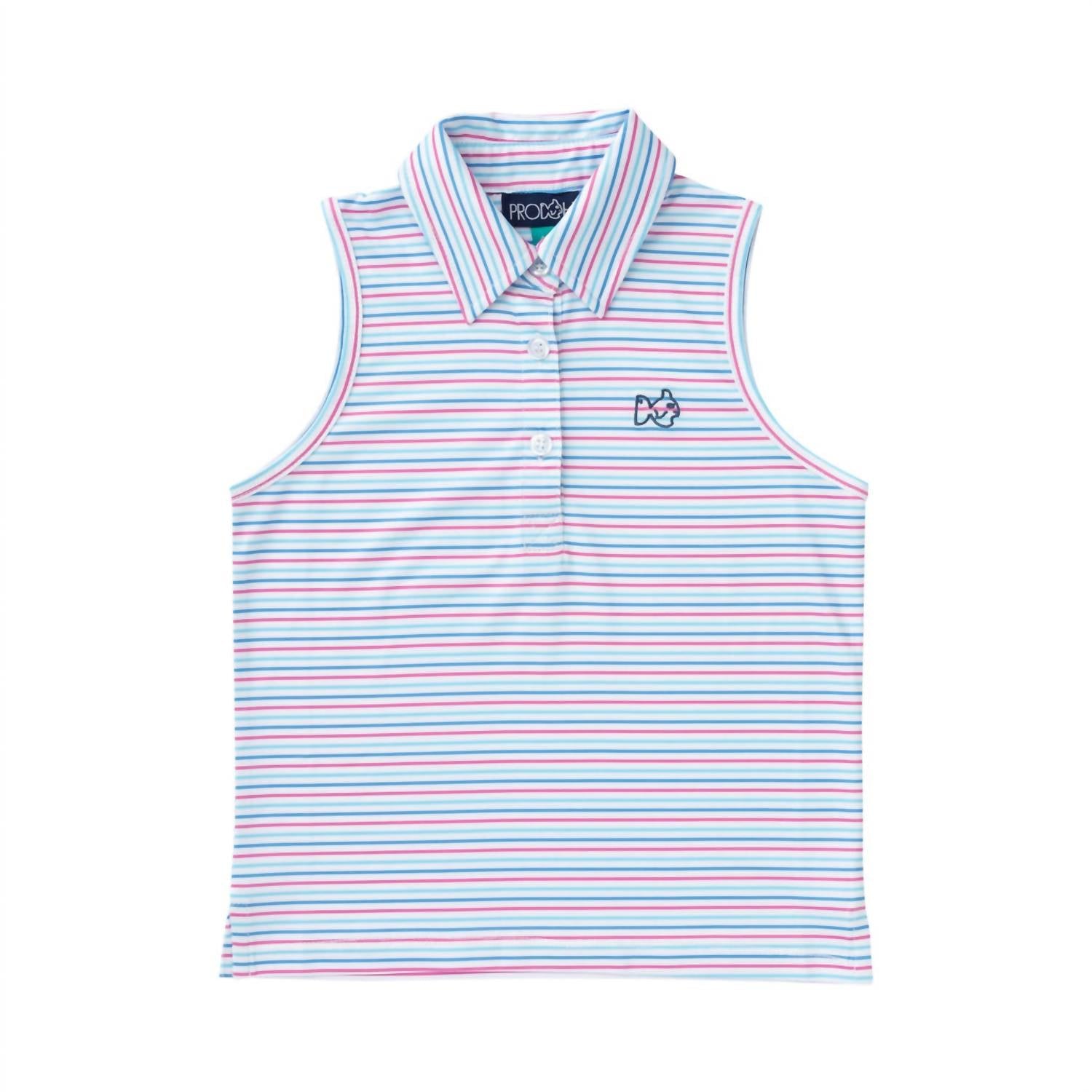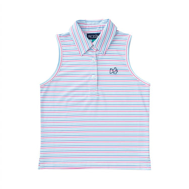 Gear up your girls for any adventure with the Girls' Sleeveless Pro Performance Polo by PRODOH in a vibrant Strawberry Moon Stripe. This polo is crafted from a UPF 50 protective, fast-drying performance jersey composed of 95% Polyester and 5% Spandex, offering both comfort and functionality. It features a structured collar with interfacing, a 3-button placket, and the signature "Get Back Here Loop" for an added touch. Made in China and designed in the USA, care for this polo is a breeze with machine wash and tumble dry instructions.