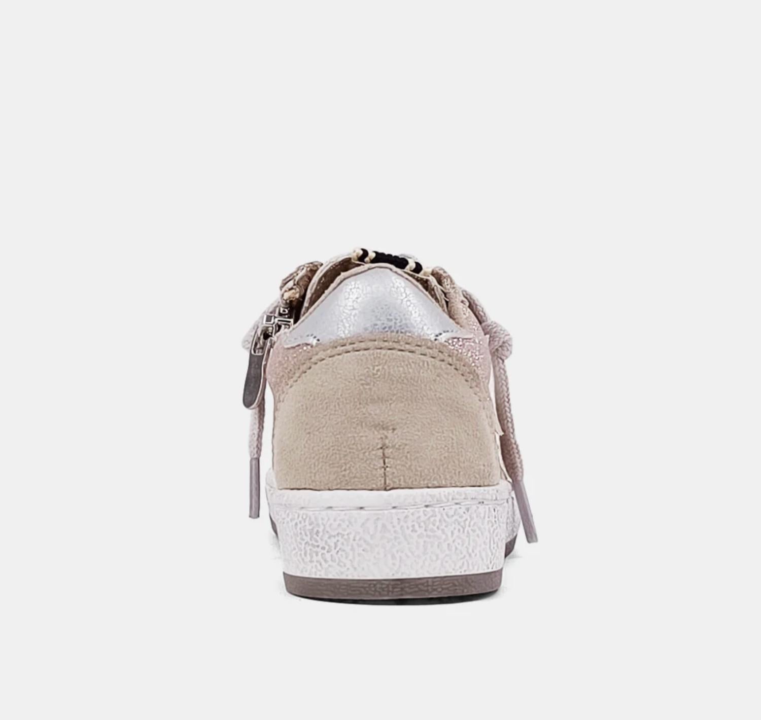 Introducing Girl's Paz Toddler Sneakers by SHU SHOP, a retro classic perfect for little ones. These sneakers come in a stunning champagne glitter finish, featuring a fiery glittering faux leather upper complemented by striking suede panels. Designed with a round toe and flat platform heel (1" & under), they ensure both style and comfort. Ideal for spring and fun holiday parties, these shoes are crafted for durability and effortless wear.