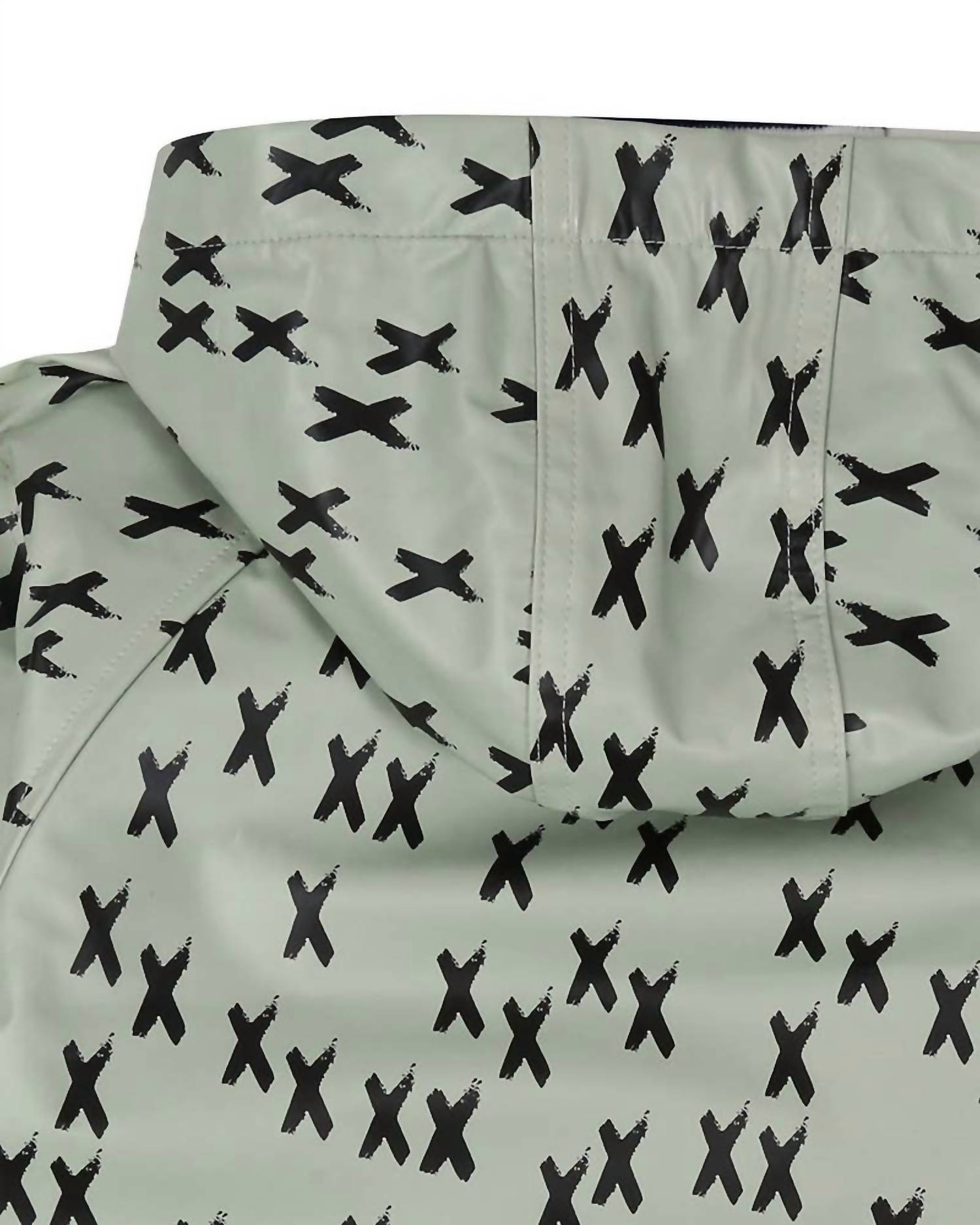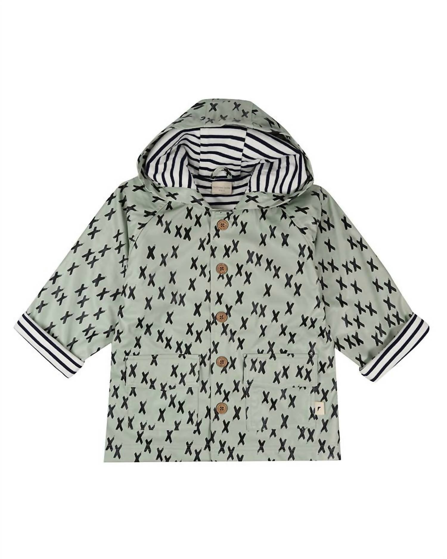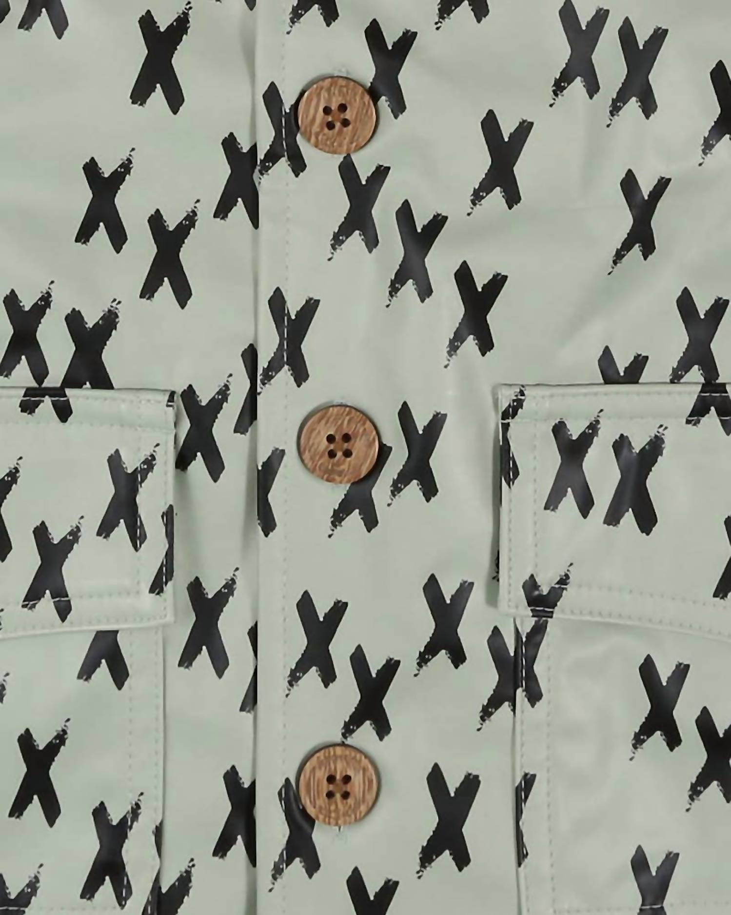 Introducing the Turtledove London Kisses Raincoat, perfect for adventurous days filled with muddy puddle splashing or simply heading back to school. This green rainwear jacket is composed of waterproof fabric and lined with super-soft 100% GOTS organic cotton for ultimate comfort. Made sustainably from 28 single-use recycled plastic bottles, it features wood effect fastenings for easy dressing, a protective hood, and two pockets for hidden treasures. The eco-friendly Kisses Print design, crafted with azo-free dyestuffs, ensures it's gentle on delicate skin and the environment.