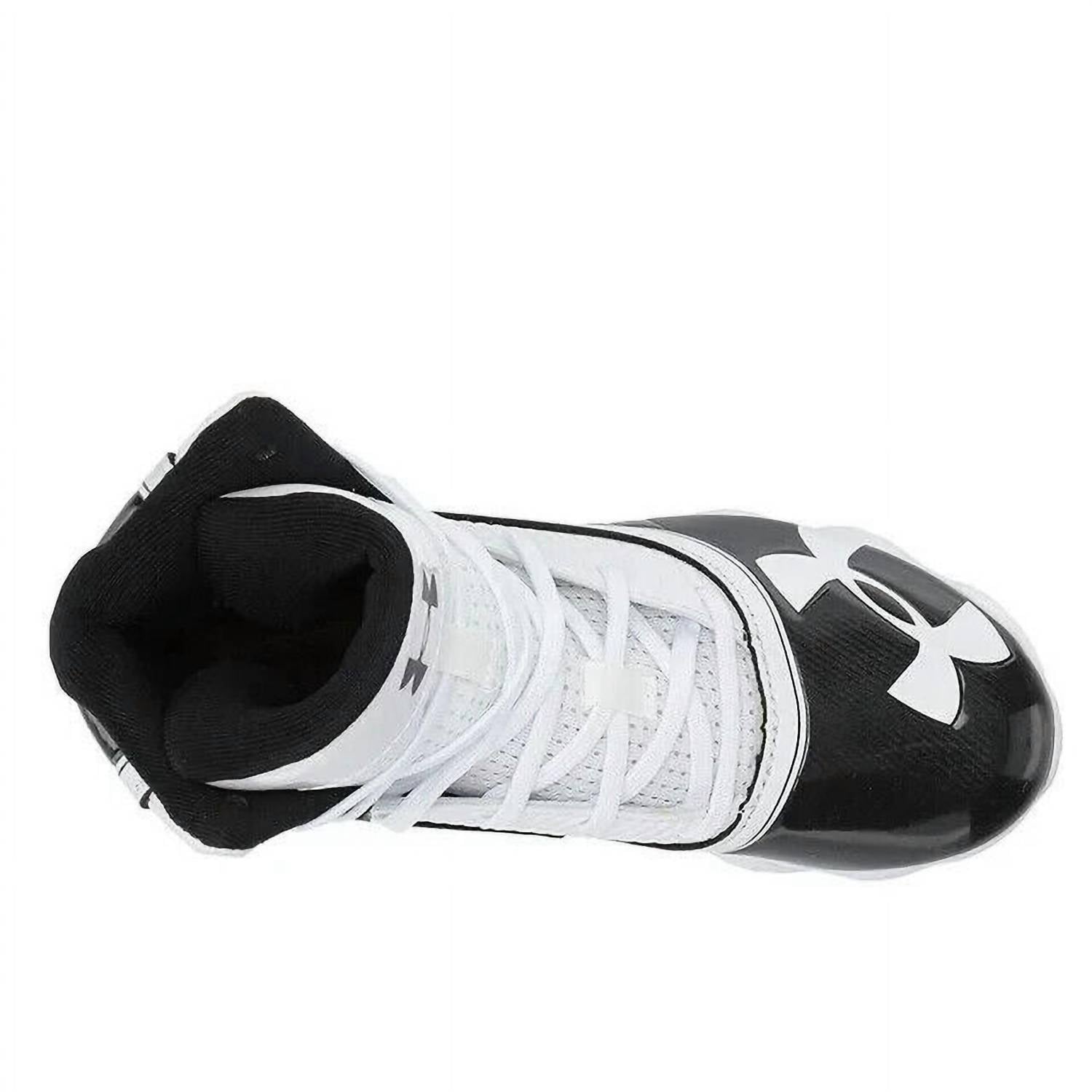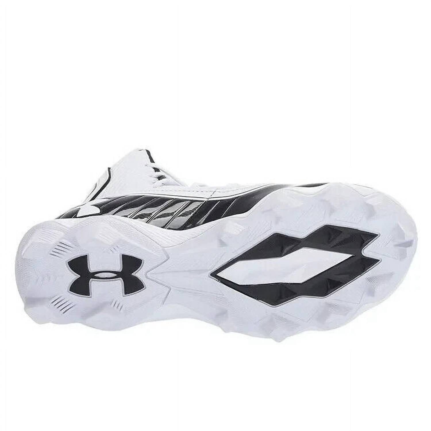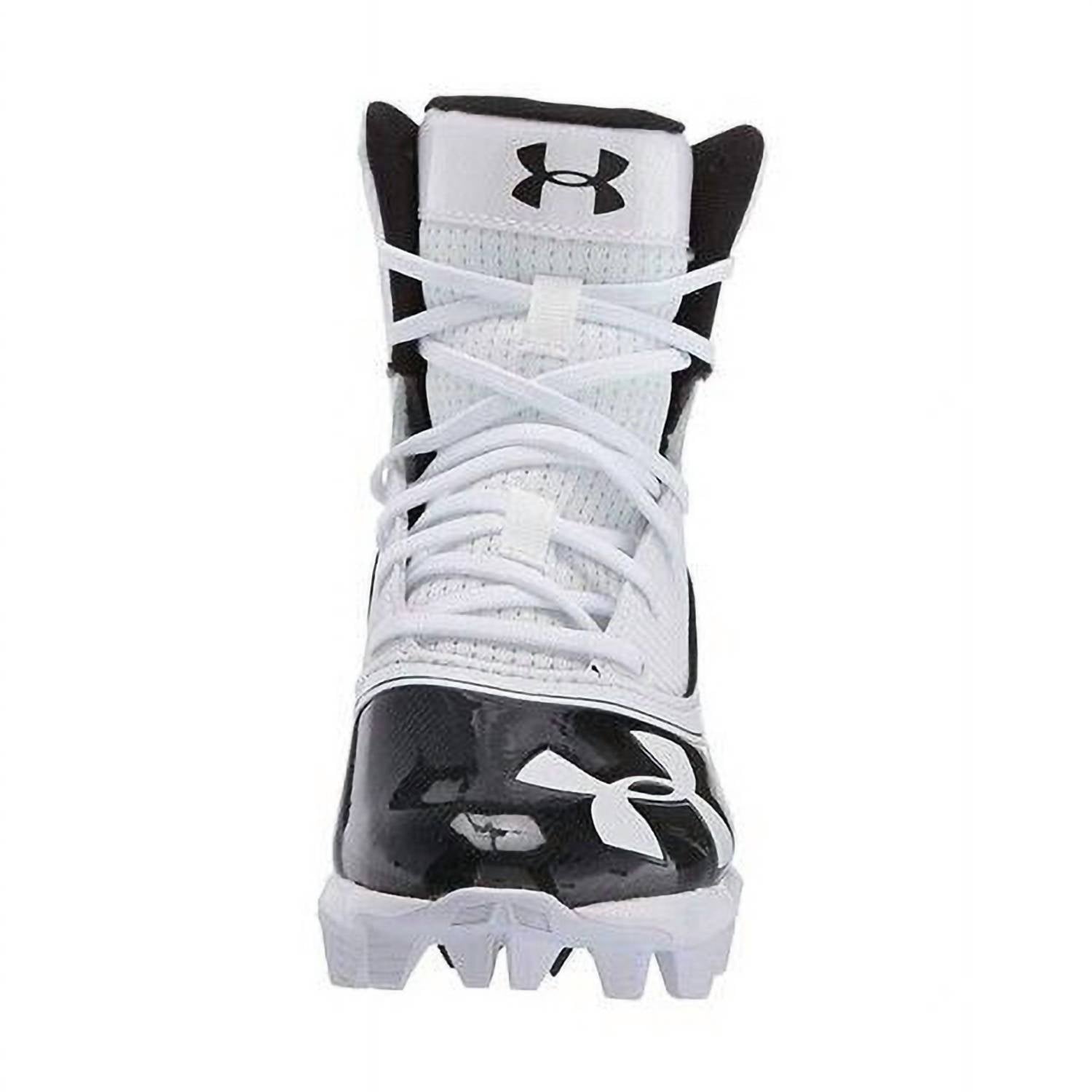 The Junior Highlight RM Football Cleats Shoes by Under Armour offer exceptional performance for the spring season's game day. Constructed with a performance synthetic upper and textile collar, they ensure lightweight fit and durable support, perfect for big kids in athletic activities. The open-holed mesh tongue enhances ventilation, while the die-cut EVA sockliner provides remarkable comfort underfoot. These black sneakers feature rubber molded cleats for aggressive traction across all playing surfaces, making them an essential athleisure staple for boys.