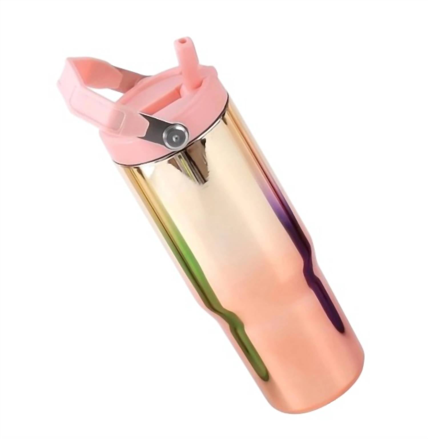 Introducing the 30 Oz Stainless Steel Insulated Tumbler by 42POPS, a vibrant addition to your drinkware collection with its Metallic Champagne Pink Ombre finish. This tumbler is crafted from durable stainless steel and features a built-in flip straw for convenience. Its double wall vacuum insulation keeps your beverages at the desired temperature, and it's dishwasher safe up to 100F for easy cleaning. With a convenient carrying handle and cup holder-friendly design, this tumbler is both practical and stylish for any outing.