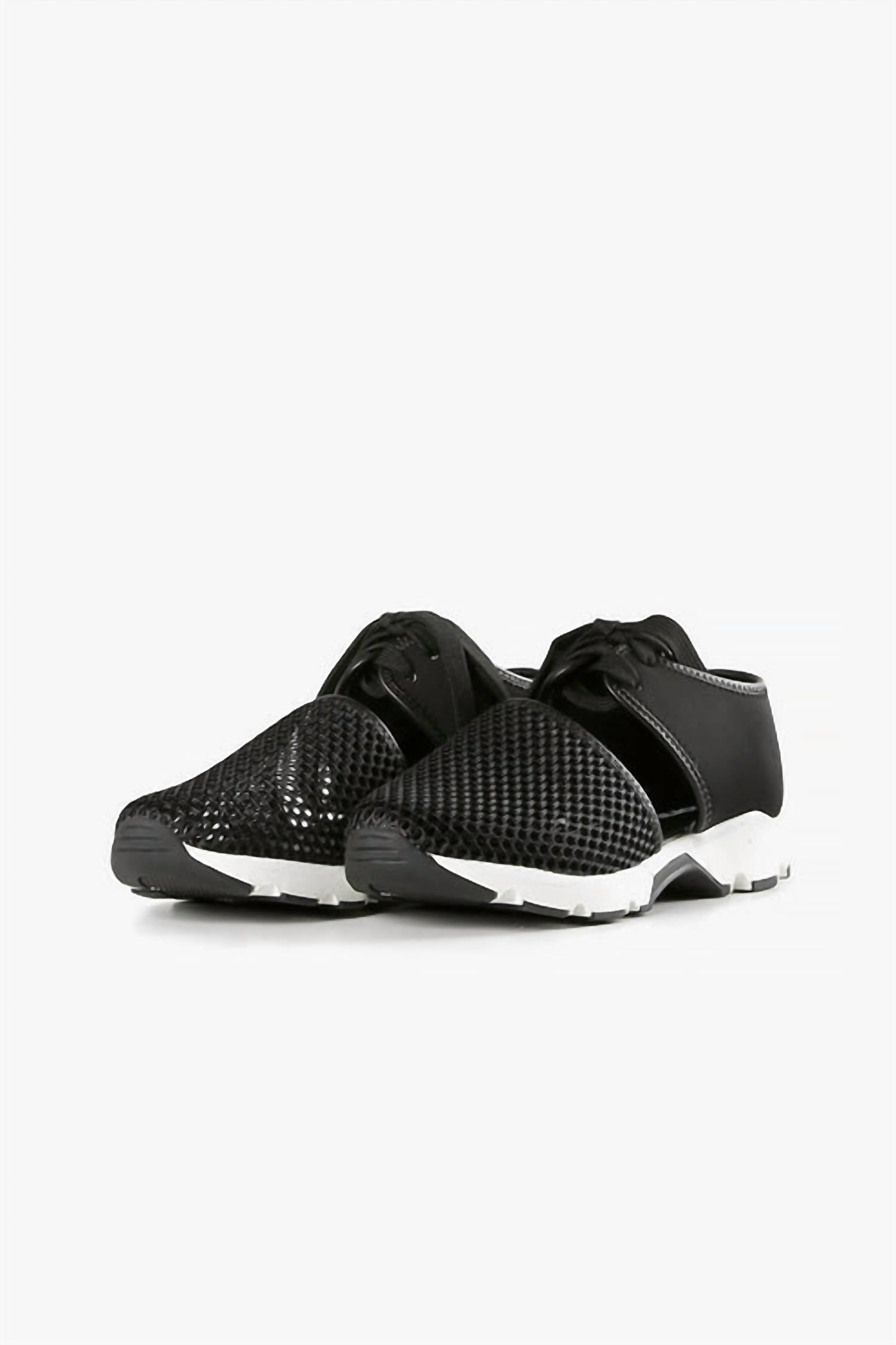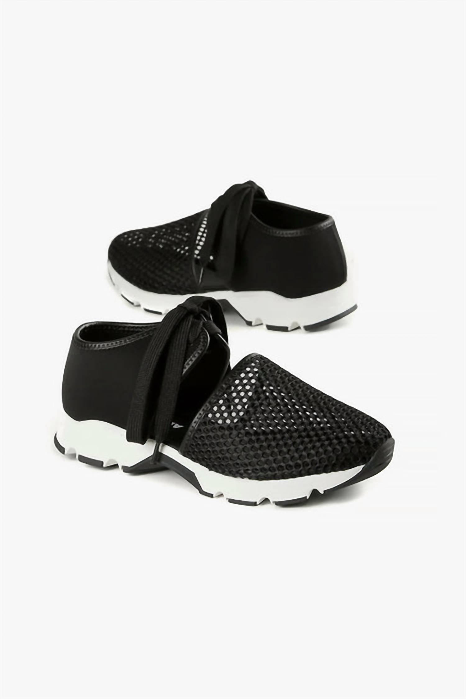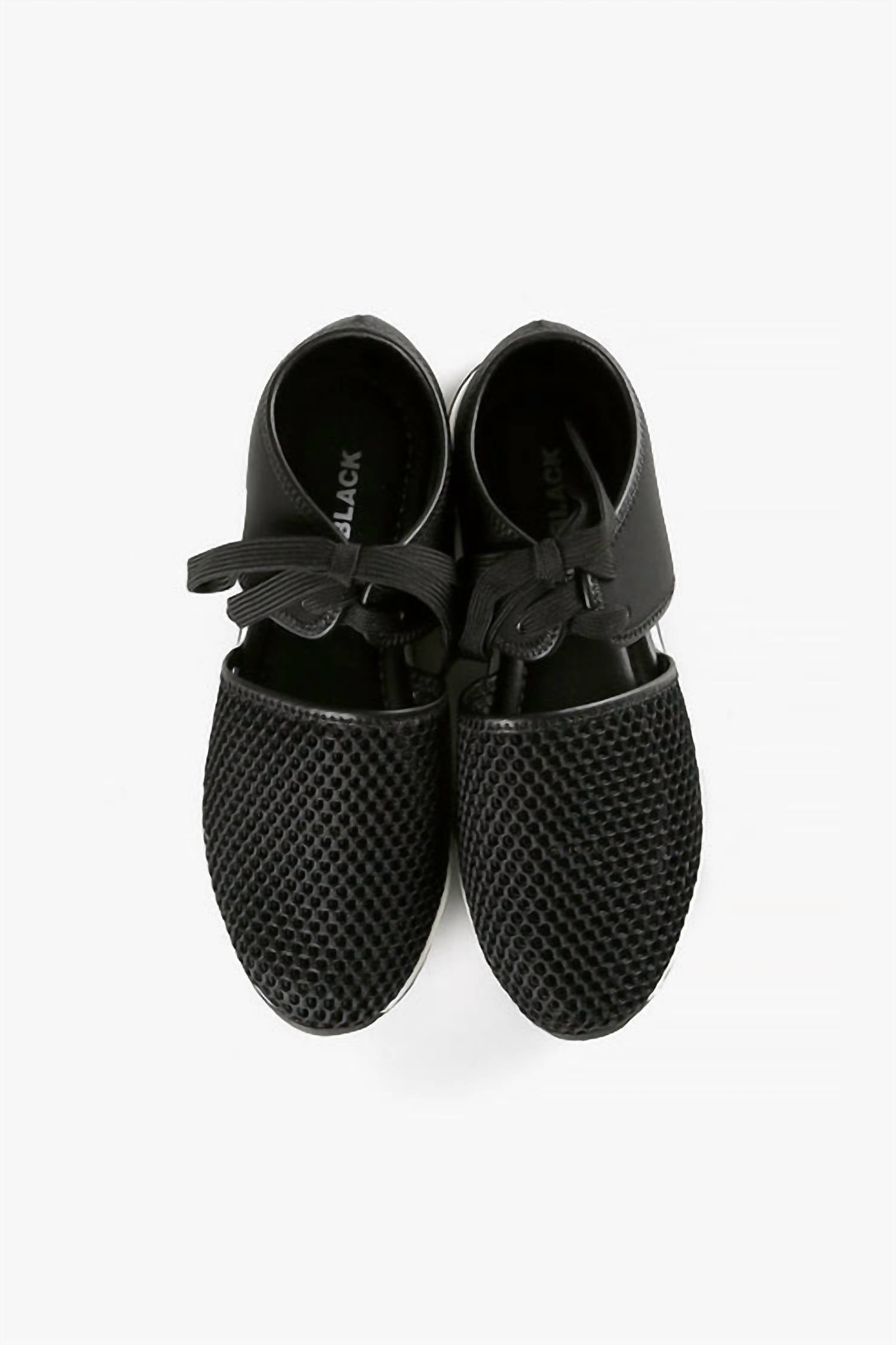 Step into the season with the Women's Amazing Mesh Sneaker by ALL BLACK, a stylish choice in sleek black for any sneaker collection. This fashion-forward footwear features a comfortable neoprene and mesh upper with an almond toe shape. It boasts a flat heel with a height of 1" and under, perfect for keeping you grounded in style. Lace-up closure.