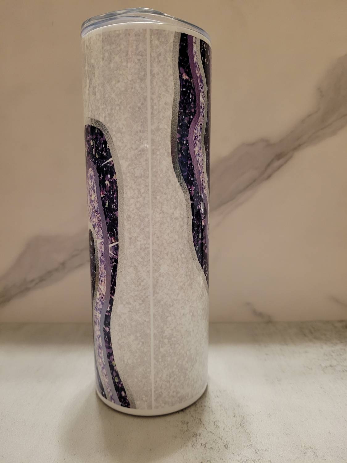 Introducing the Glitter Geode Stainless Steel Double Wall Tumbler by Donny Brooks Designs, perfect for enjoying beverages in style. This 20 oz tumbler in purple features high-quality sublimated graphics without epoxy or physical glitter, ensuring durability and vibrant design. Material: Stainless Steel with a double wall for optimal insulation. Includes a lid and a plastic reusable straw for convenience.
