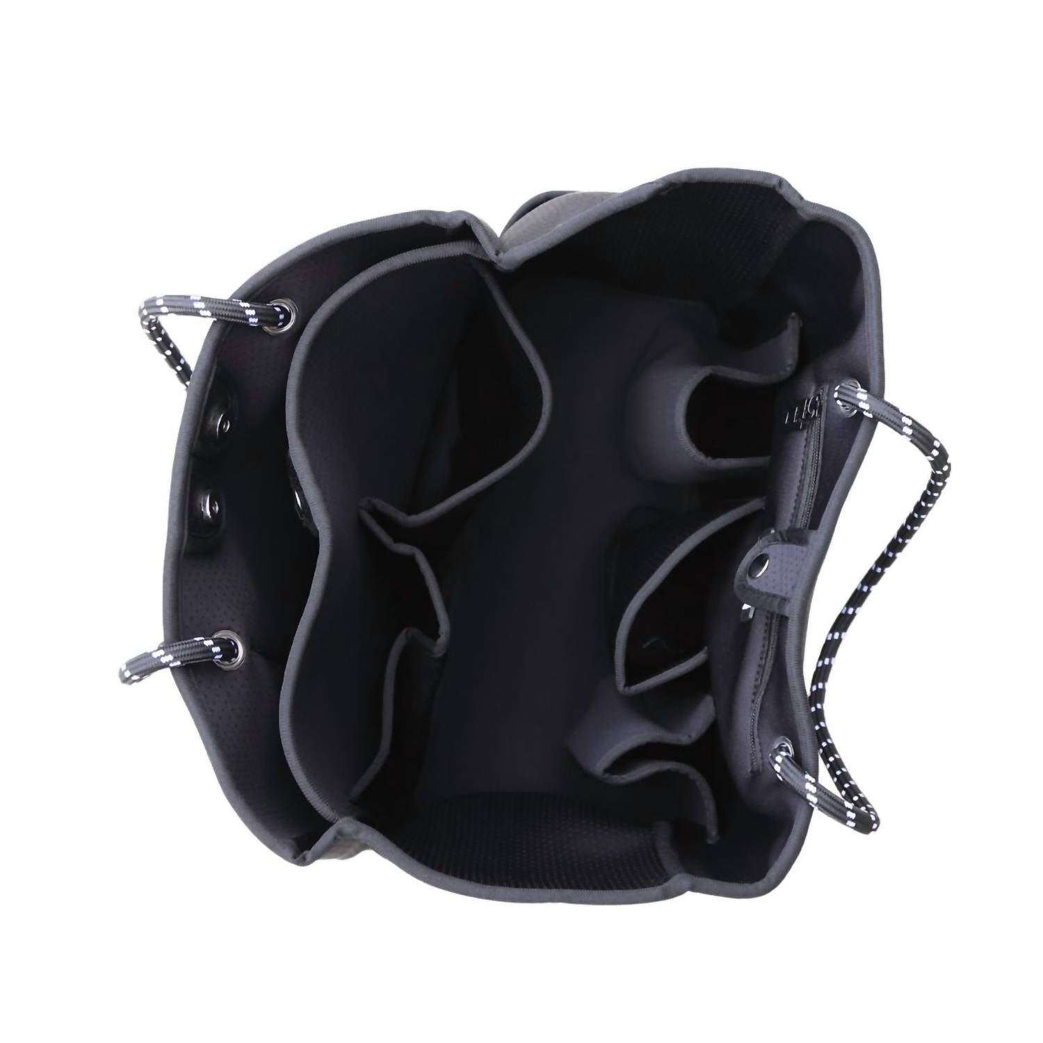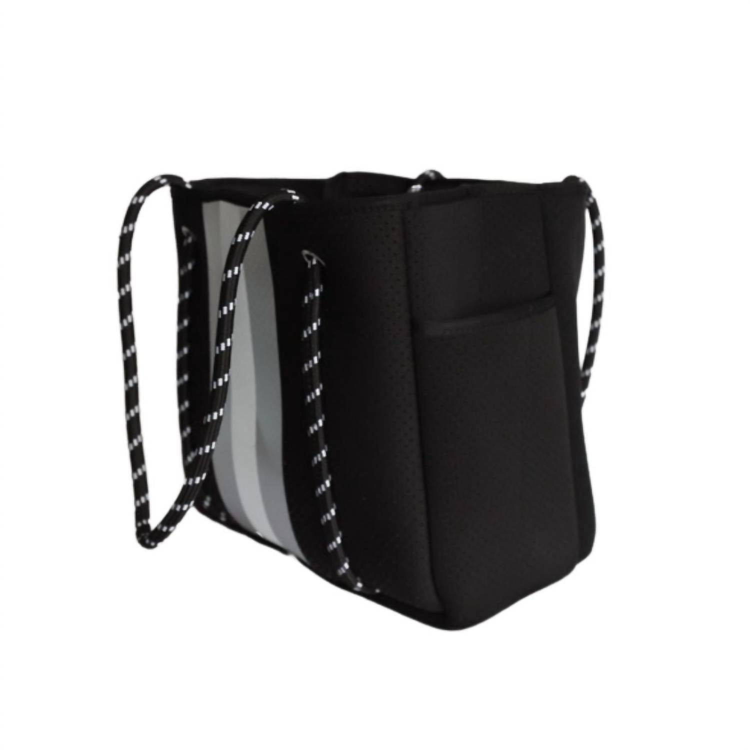 Introducing the Women Courtside Large Tennis Racket Tote Bag by Five Love, a sophisticated and functional choice for both tennis and everyday adventures. This tote, crafted from durable neoprene, comes in a stylish black and white with silver accents. With dimensions of 16" L x 15" H x 7" W, it offers ample space to accommodate up to two tennis rackets and additional essentials. Care for this versatile tote is hassle-free with a machine wash on a cold, gentle cycle.