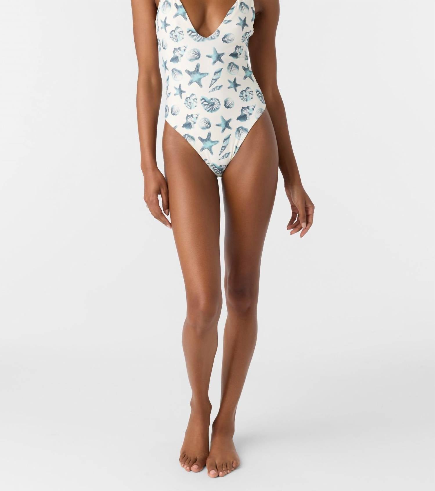 Embrace a chic and sustainable beach look with the O'NEILL Saltwater Essentials Edgewater One Piece Swimsuit in a captivating vanilla shade. This women's one-piece features adjustable straps, a double v-neckline, and a cheeky coverage fit with a high-leg detail, all adorned with a stylish allover print. Made from 82% recycled polyamide and 18% elastane tactel, this swimsuit ensures comfort and a perfect fit. Care for this swimsuit by hand washing, ideal for carefree summer beach days.