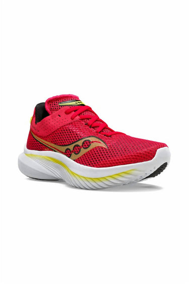 Introducing the Women's Kinvara 14 Shoes by SAUCONY, crafted for the modern athlete. These athletic shoes feature a vibrant Red Rose hue with a round toe design and a flat heel height of 1" or under for comfort. Material: Durable rubber, ideal for providing traction and flexibility. Perfect for adult women looking for stylish and functional athletic footwear.