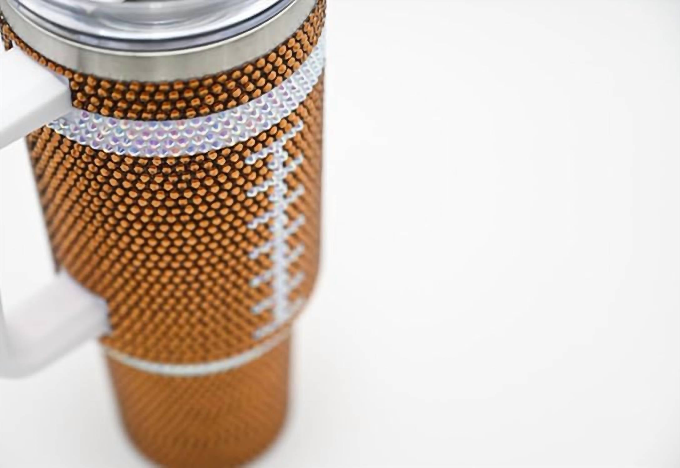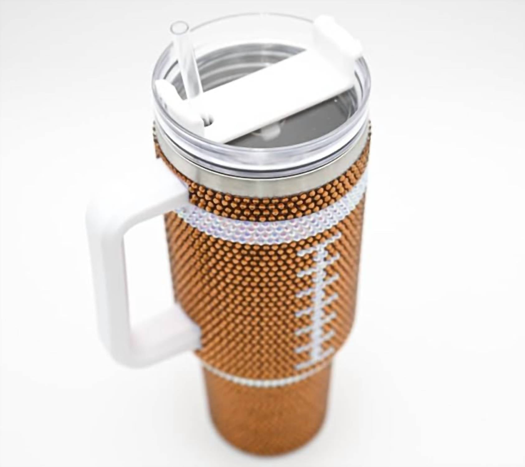 40oz capacity with handle and reusable straw. Double-wall vacuum insulation. Made of high-quality food grade 304 stainless steel. Rhinestones hand-applied with seamless design. Fits most vehicle cup holders. Hand wash only, not dishwasher or microwave safe. Suitable for cold or hot beverages.