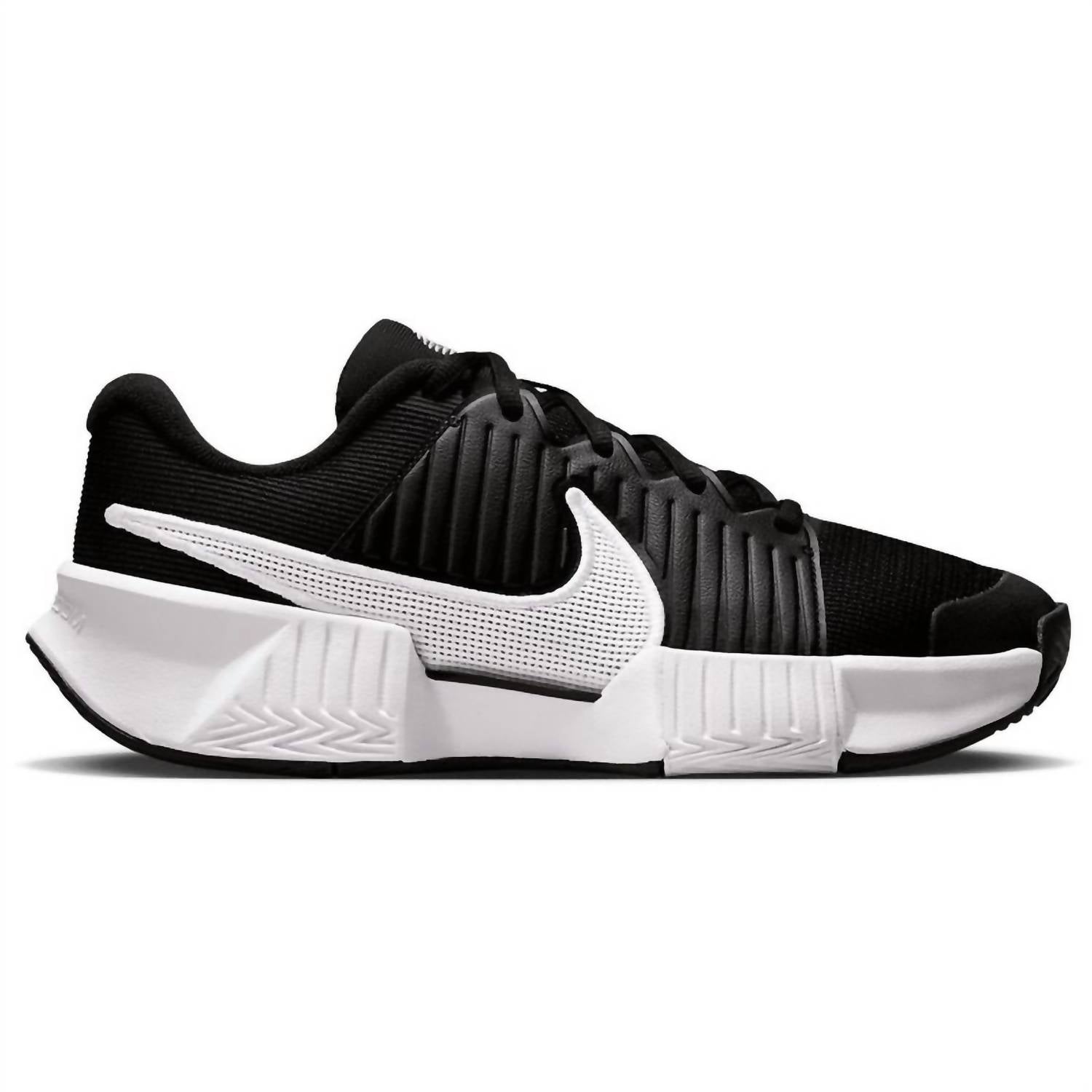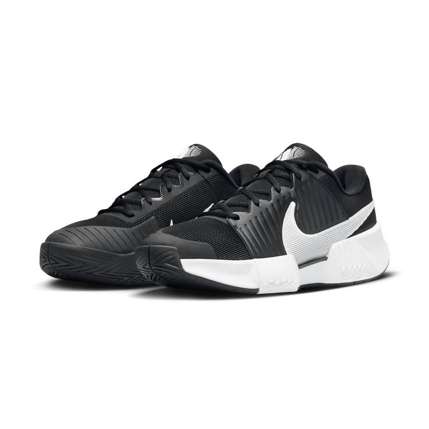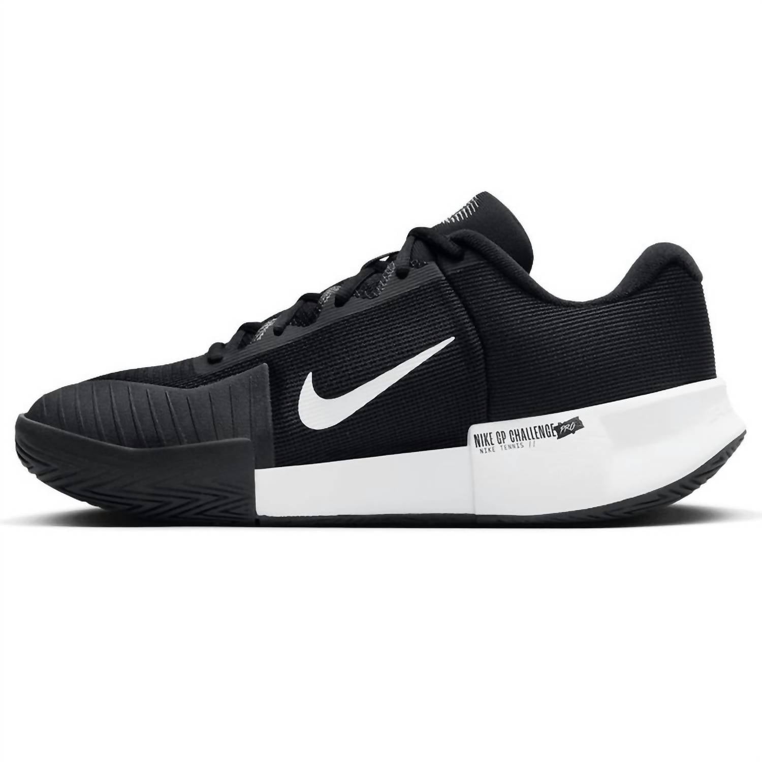 Meet the Men's Zoom Gp Challenge Pro Hard Court Tennis Shoes by Nike, crafted for effortless agility and speed on the court. In a classic Black/White colorway, these shoes feature a robust midfoot plastic plate for stability and a padded tongue with breathable mesh to keep you cool. The wide base enhances stability, with extra rubber in the toe area ensuring durability, while high abrasion rubber in the forefoot provides exceptional traction. Designed for the modern athlete, they boast a round toe and platform heel, perfect for Game Day or any athleisure occasion.