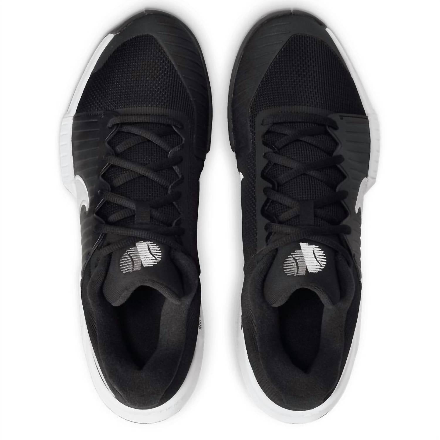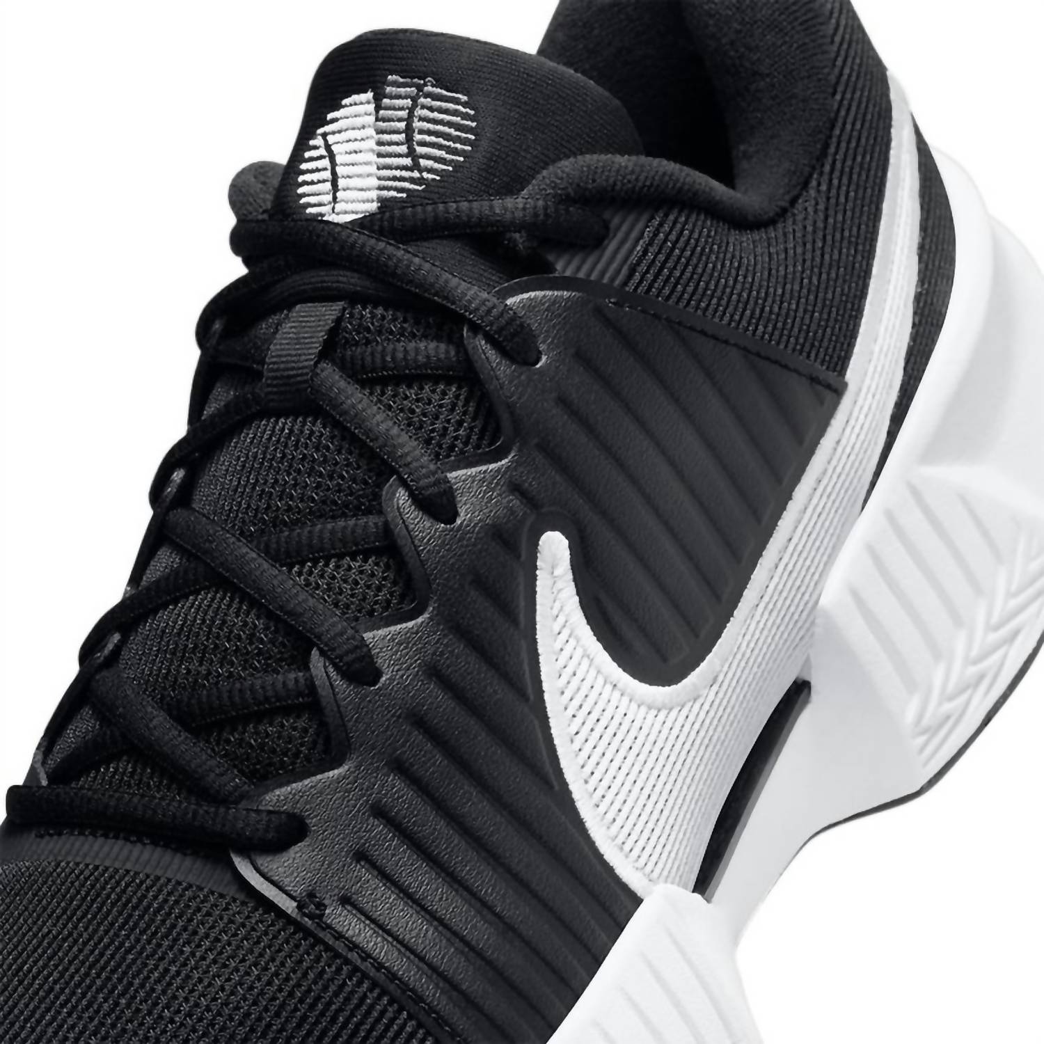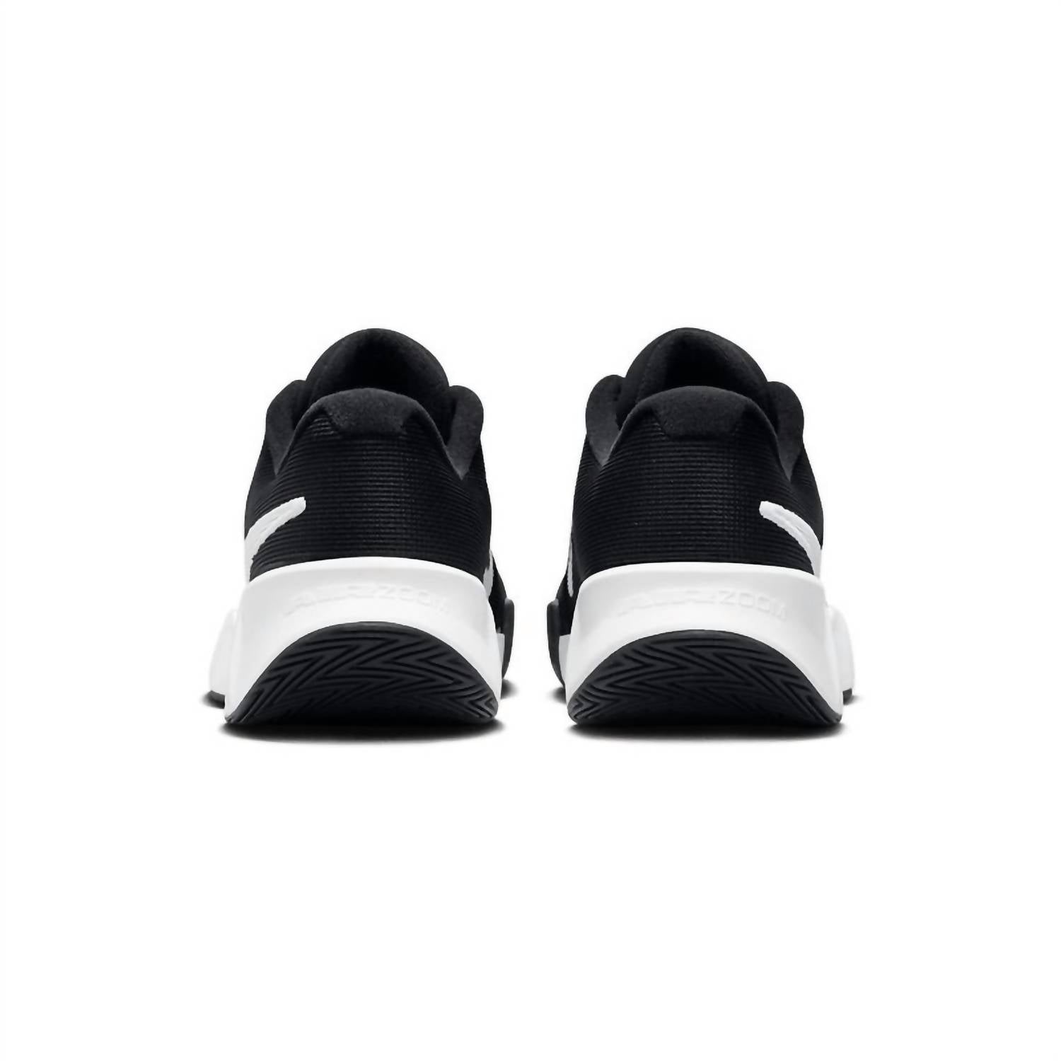 Meet the Men's Zoom Gp Challenge Pro Hard Court Tennis Shoes by Nike, crafted for effortless agility and speed on the court. In a classic Black/White colorway, these shoes feature a robust midfoot plastic plate for stability and a padded tongue with breathable mesh to keep you cool. The wide base enhances stability, with extra rubber in the toe area ensuring durability, while high abrasion rubber in the forefoot provides exceptional traction. Designed for the modern athlete, they boast a round toe and platform heel, perfect for Game Day or any athleisure occasion.