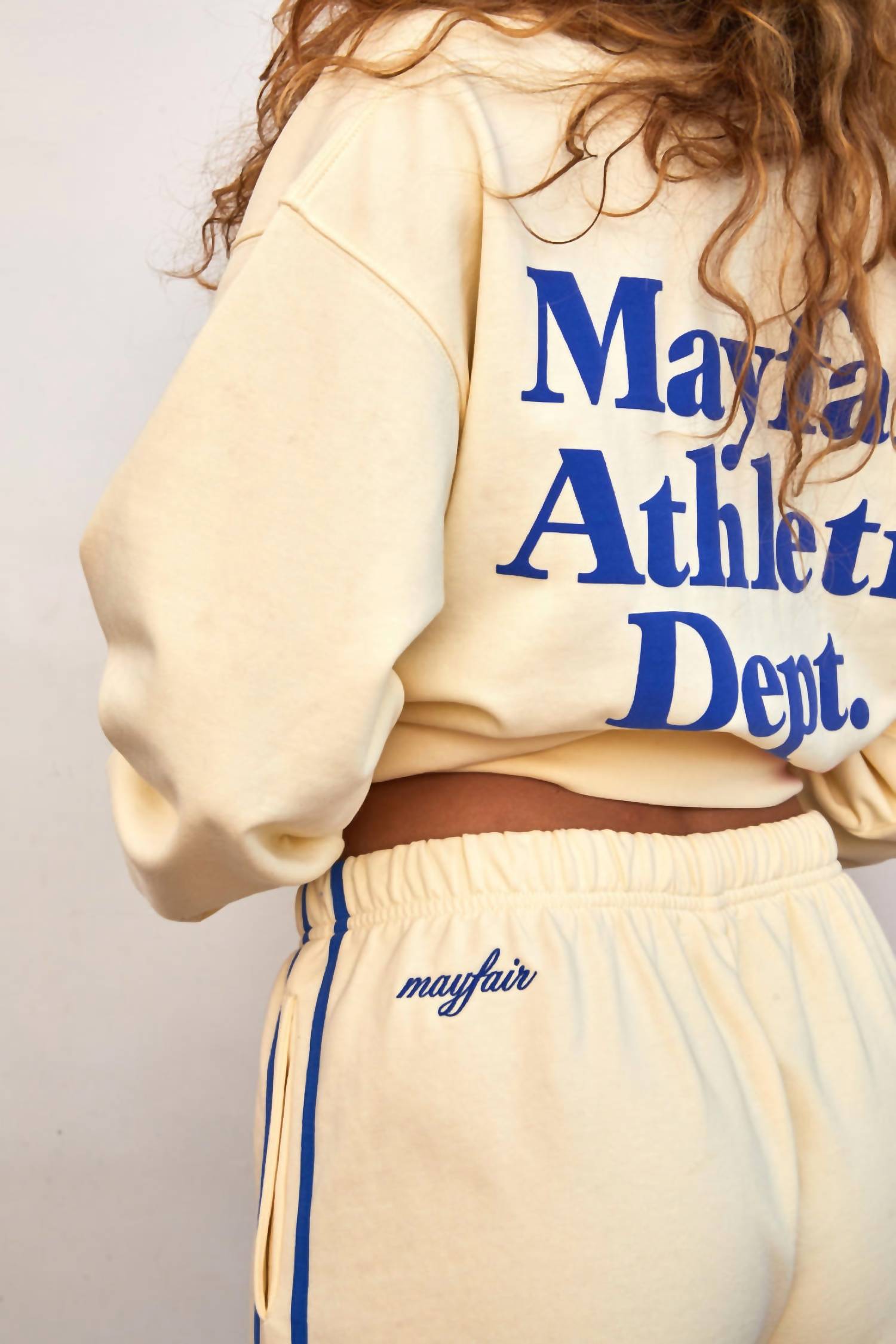 Experience the perfect blend of comfort and style with The Mayfair Group's Athletic Department Shorts in a refreshing yellow hue. Designed to be worn high-waisted, these women's shorts feature split hem detailing with track style double stripe detail in blue for a sporty flair. Made from a lightweight 75% cotton and 25% polyester blend, they boast '111' in blue puff print on the right leg and 'mayfair' embroidered in blue on the back left hip. Closure: Pull on. Care: Machine wash, line dry.