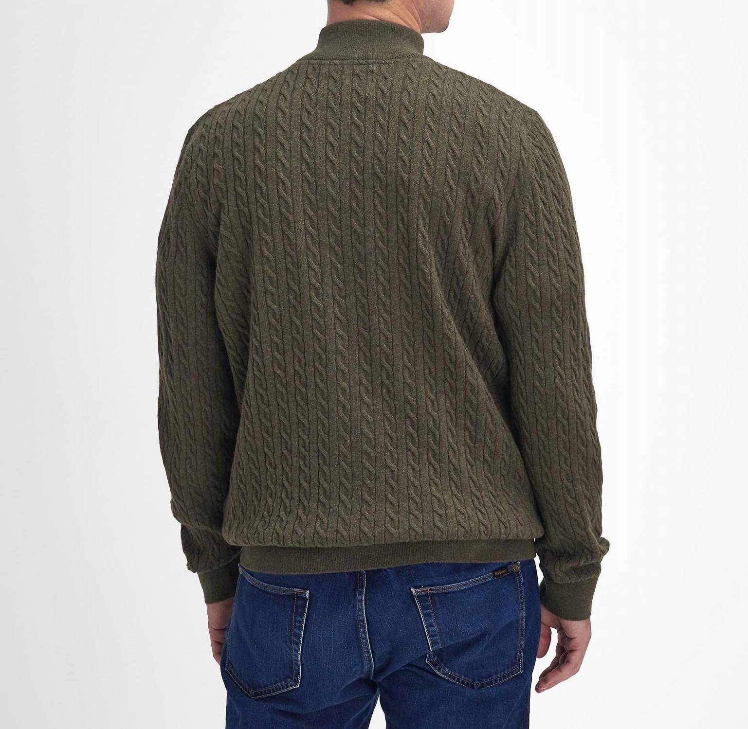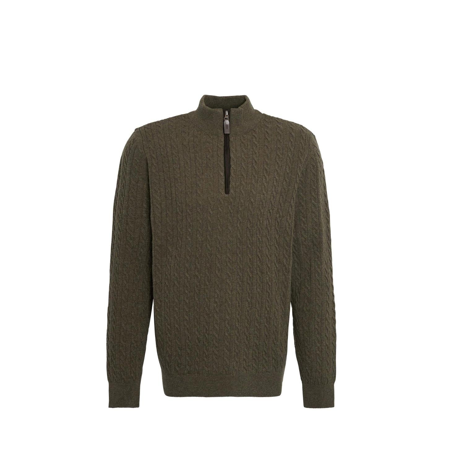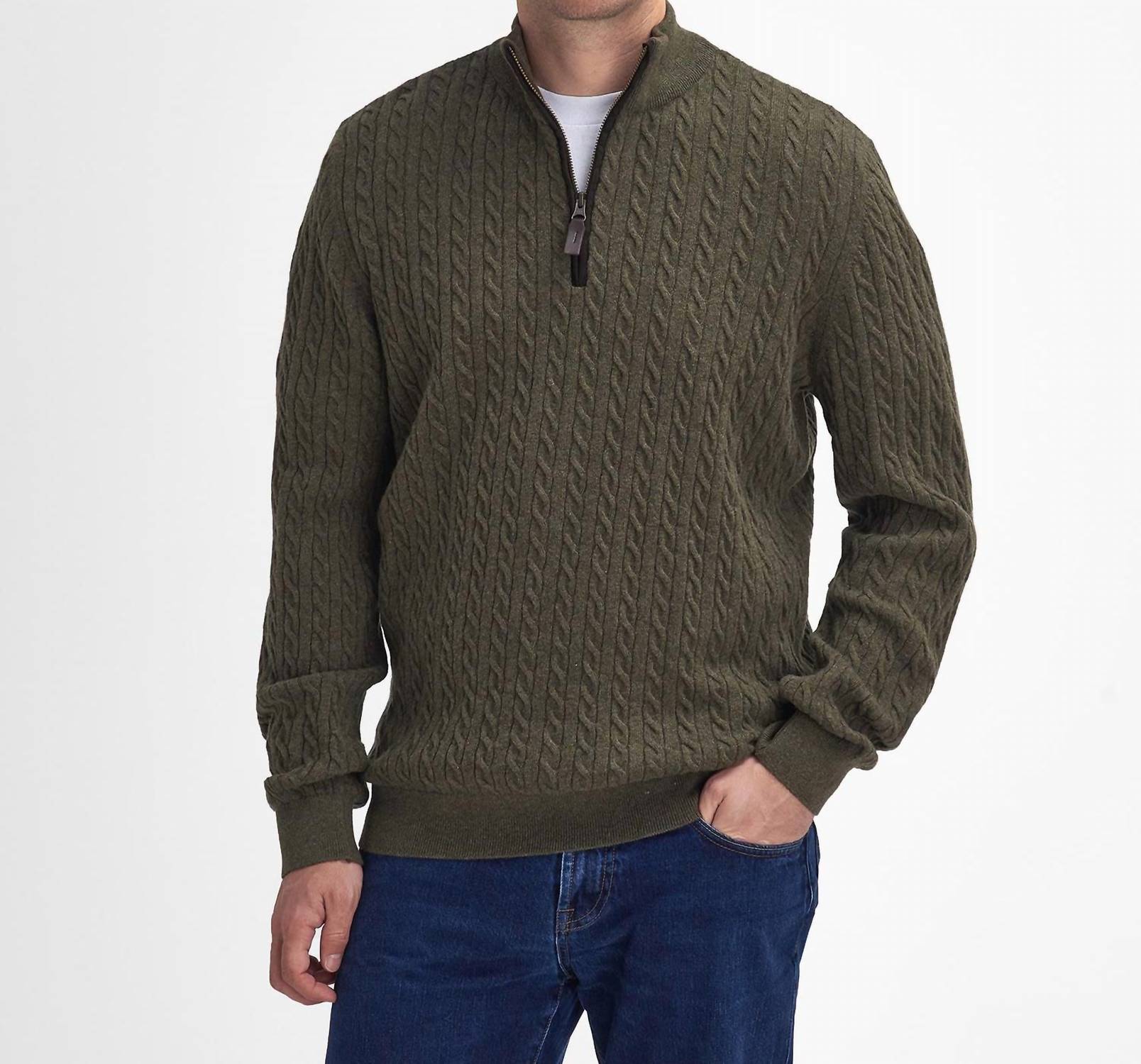 Introducing the Ramsden Half Zip Knitted Jumper by Barbour, an ivy green staple crafted for the modern man's wardrobe. This long sleeve jumper displays a solid pattern with a collar neckline, perfect for layering with T-shirts or shirts. Expertly made from 100% wool, it offers warmth and breathability thanks to its cable-knit design, ensuring comfort on colder days. Closure: Zip closure. Care: Hand wash at 30°C.