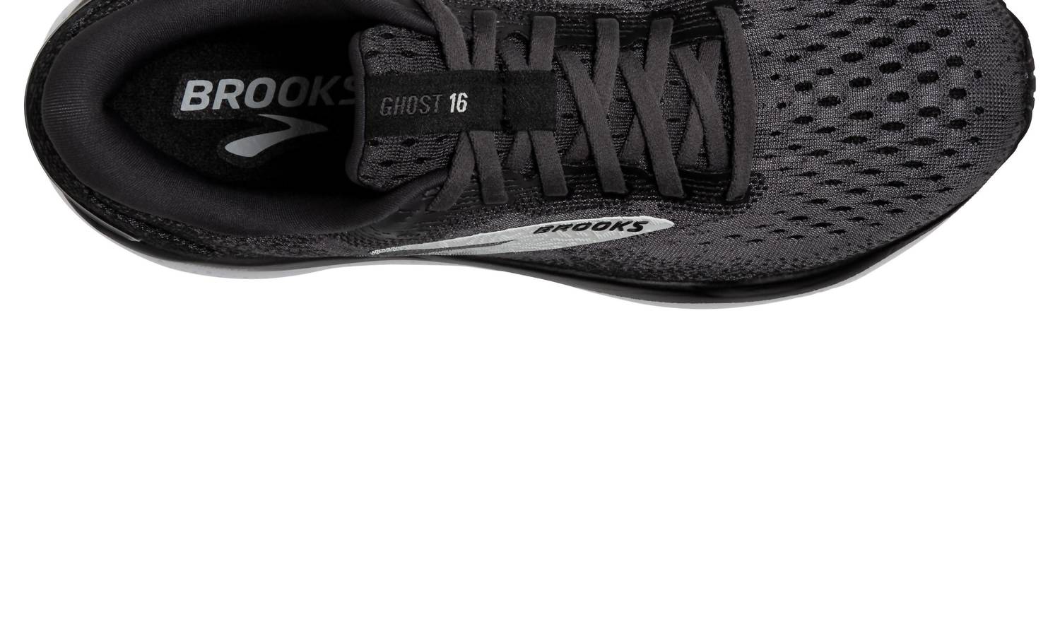 Introducing the Men's Ghost V16 Running Shoes by Brooks, a stylish choice in the Black/White colorway for optimal performance. These athletic shoes are equipped with nitrogen-infused DNA LOFT v3 cushioning, offering balanced softness and support. The engineered air mesh upper provides a breathable, secure fit, while the round toe and flat heel enhance comfort. Lightweight and durable with the new RoadTrack rubber blend, these shoes are perfect for an active lifestyle during game day or any summer occasion.