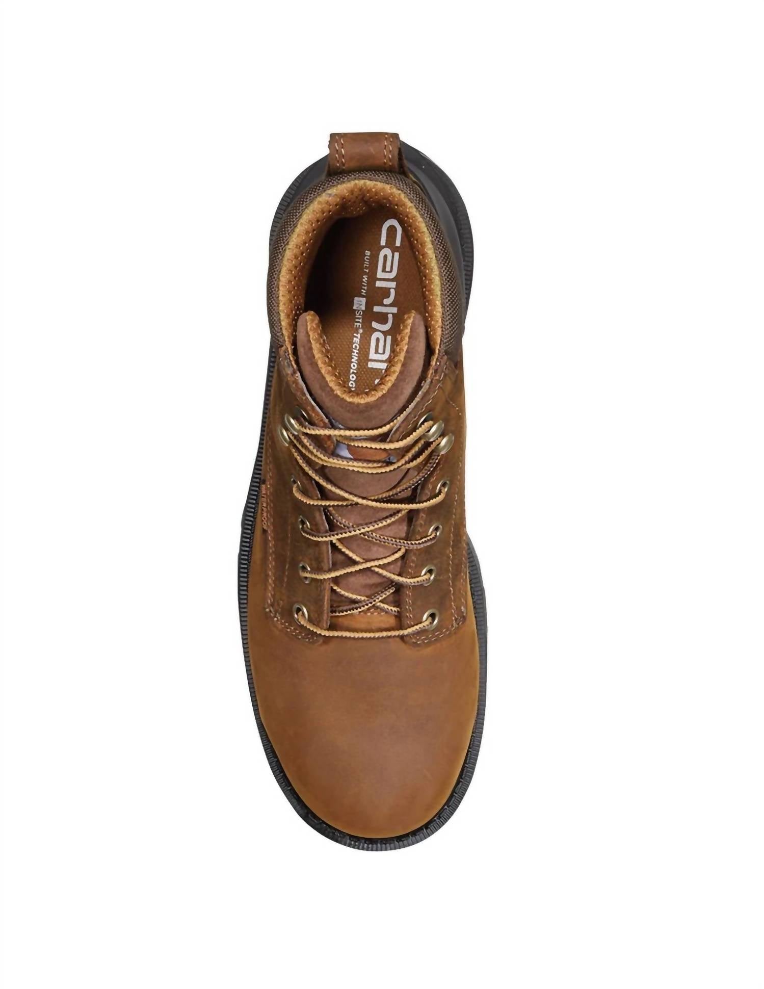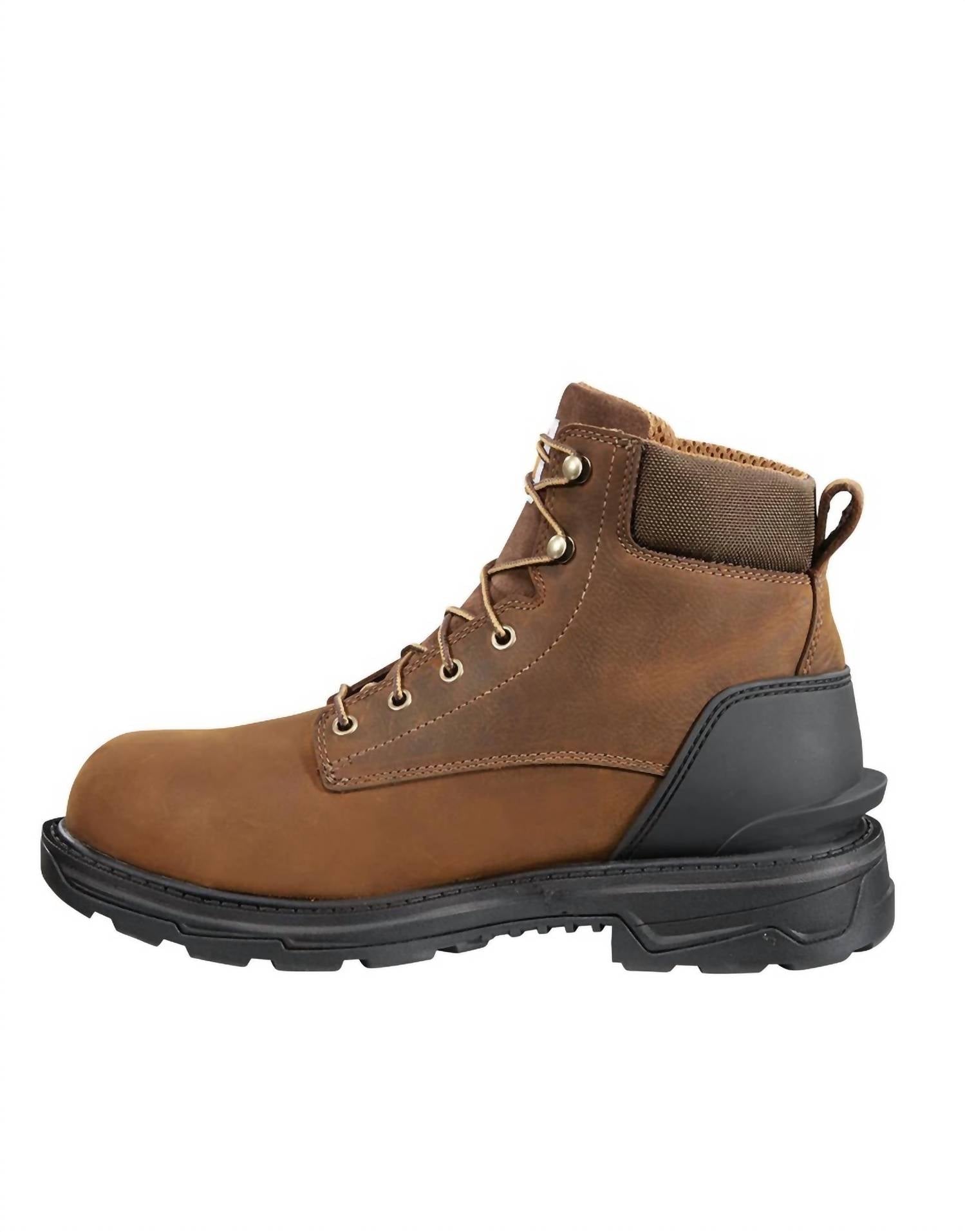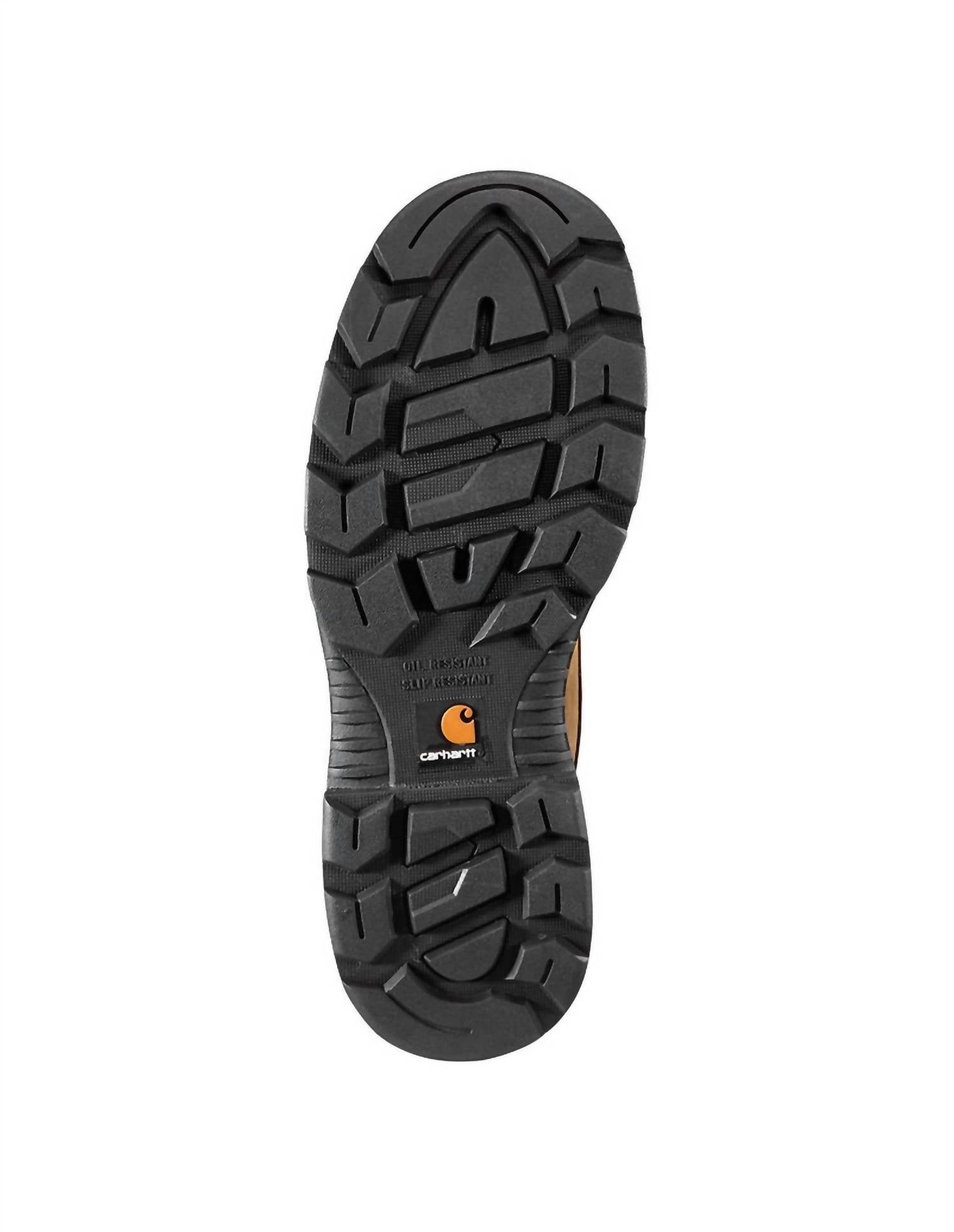 Brown oil tanned leather. Cement constructed with Carhartt rubber. Ironwood outsole. Storm Defender® waterproof breathable membrane. Revolutionaty light and high rebound PU midsole with Insite® Technology footbed. Heel Kicker utility ledge for easy-off. Soft Toe ASTM F2892-18 EH. Slip Resistant ASTM F3445-21 SR.