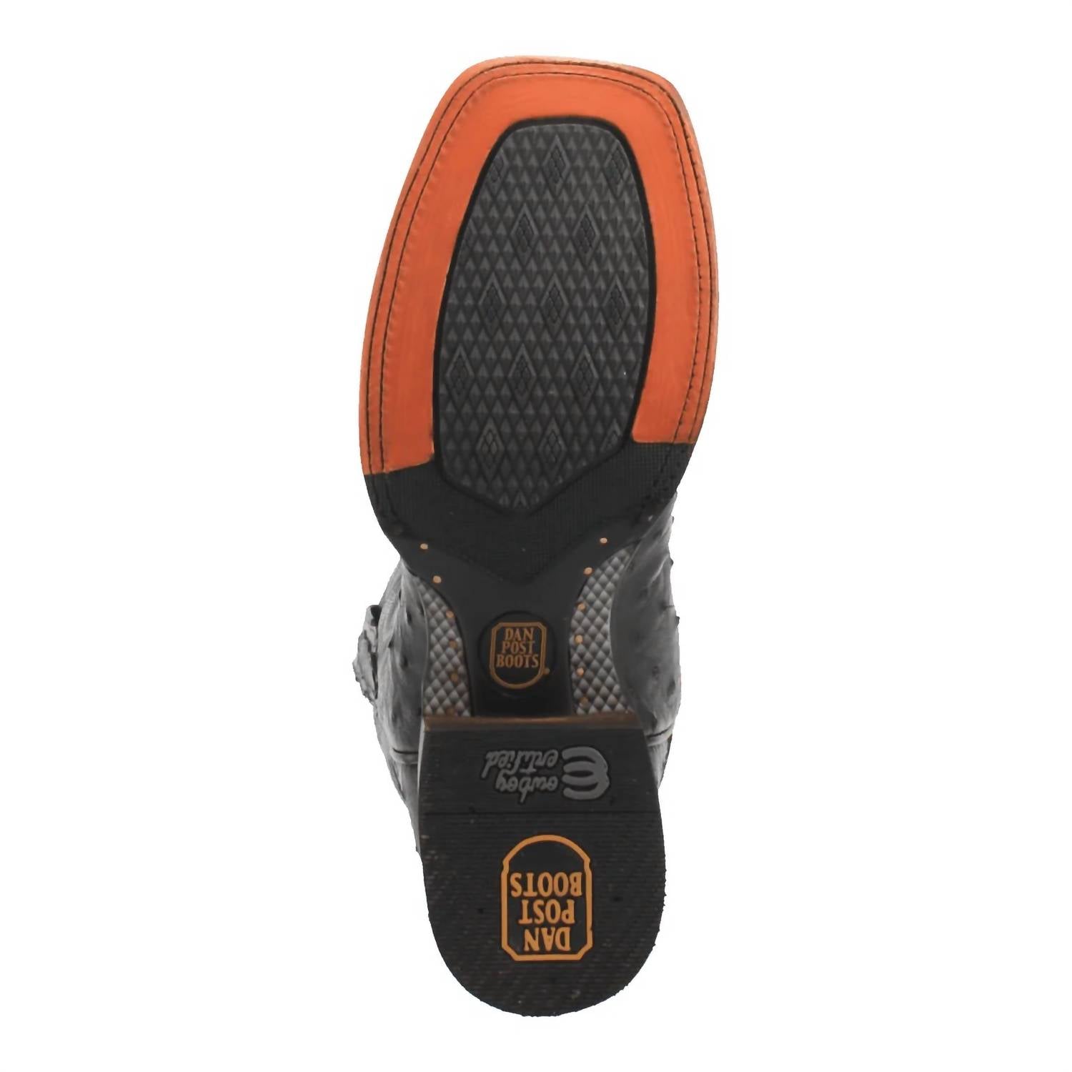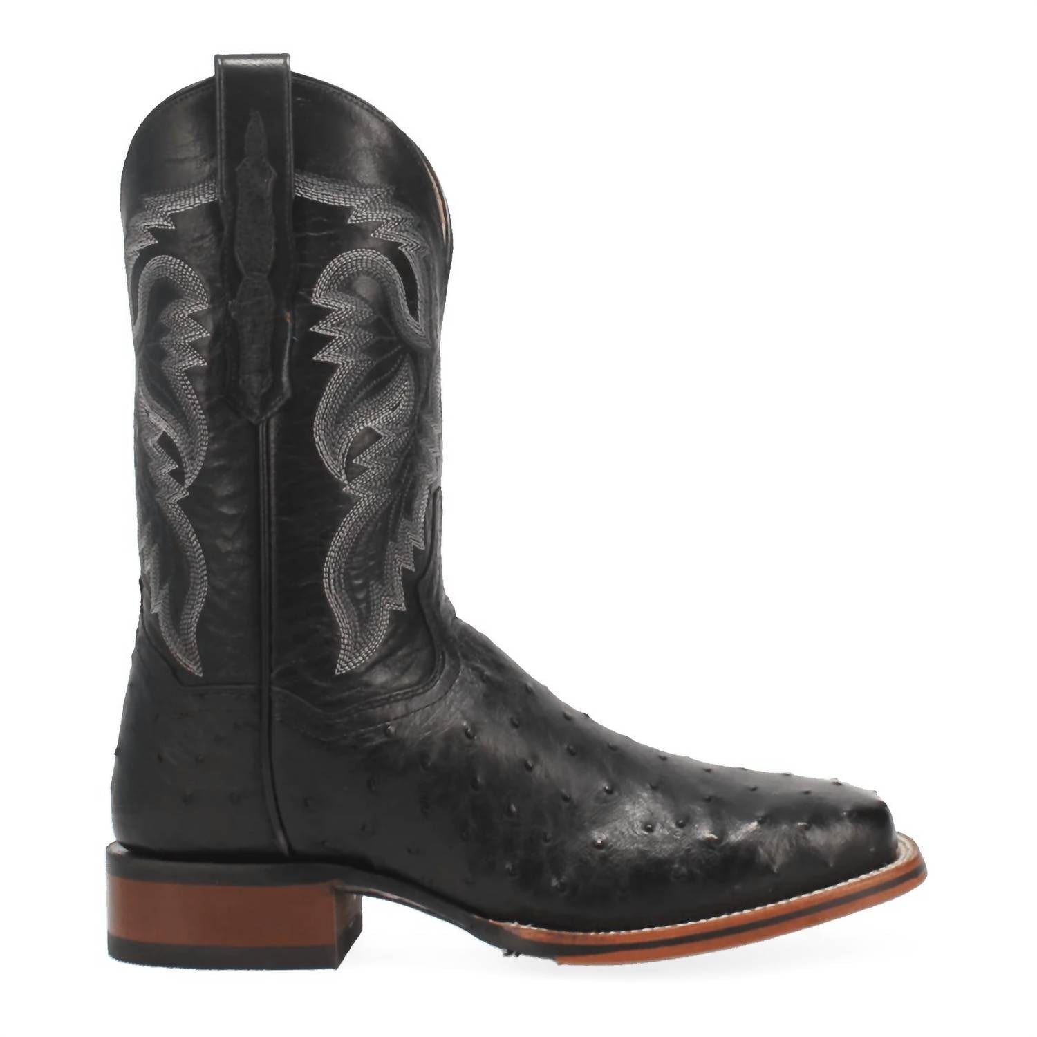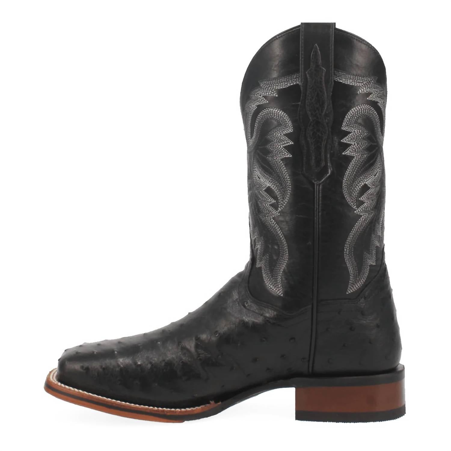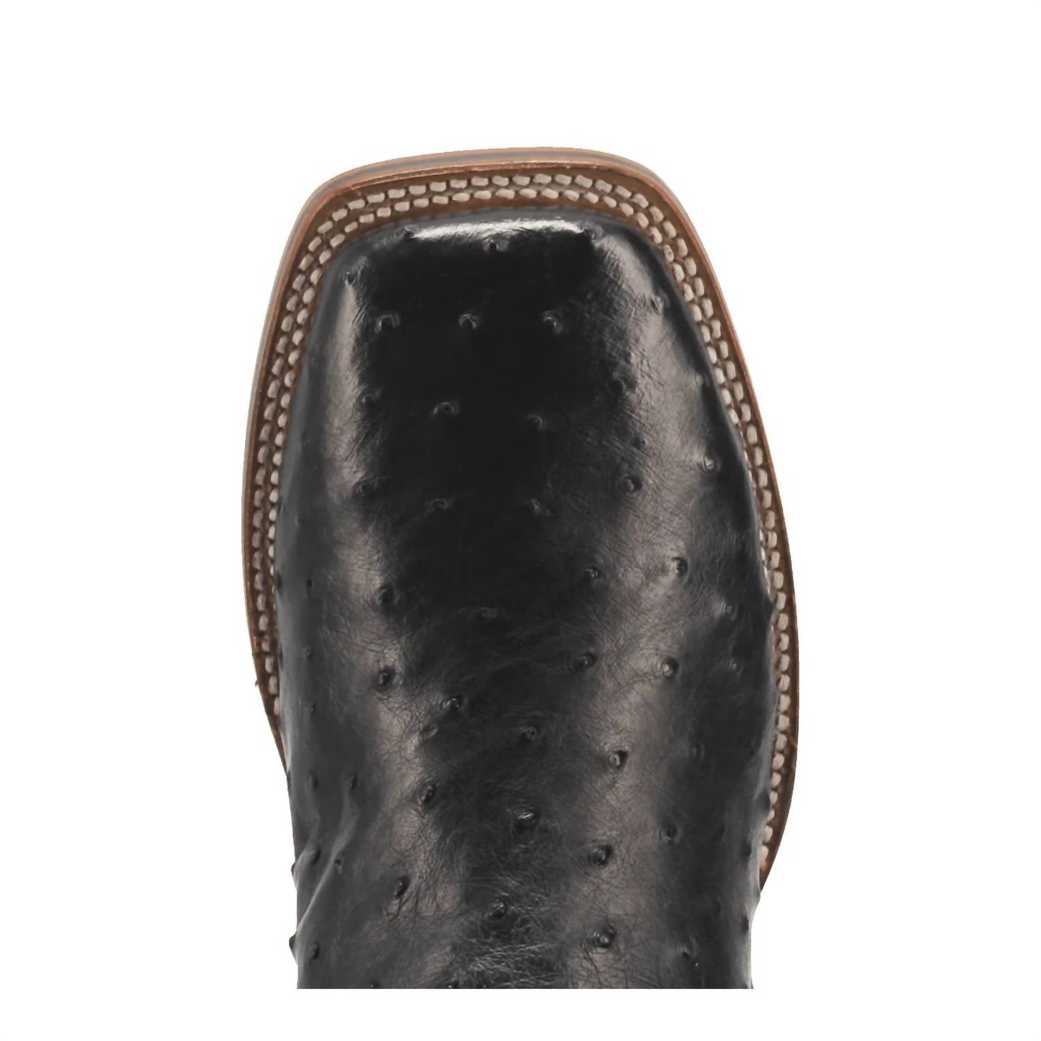 Introducing the Men's Alamosa Full Quill Ostrich Boots by DAN POST, a distinguished piece in sleek black leather that blends rugged style with refined design. These boots feature an 11" leather shaft and a 13" circumference, complemented by a squared toe and a 1" Stockman heel. Crafted for comfort, they include a fully leather-lined interior with a Soft Strike Removable Orthotic, offering antibacterial and antifungal benefits. Built with a durable TPU and leather outsole, these boots promise both style and everyday comfort.