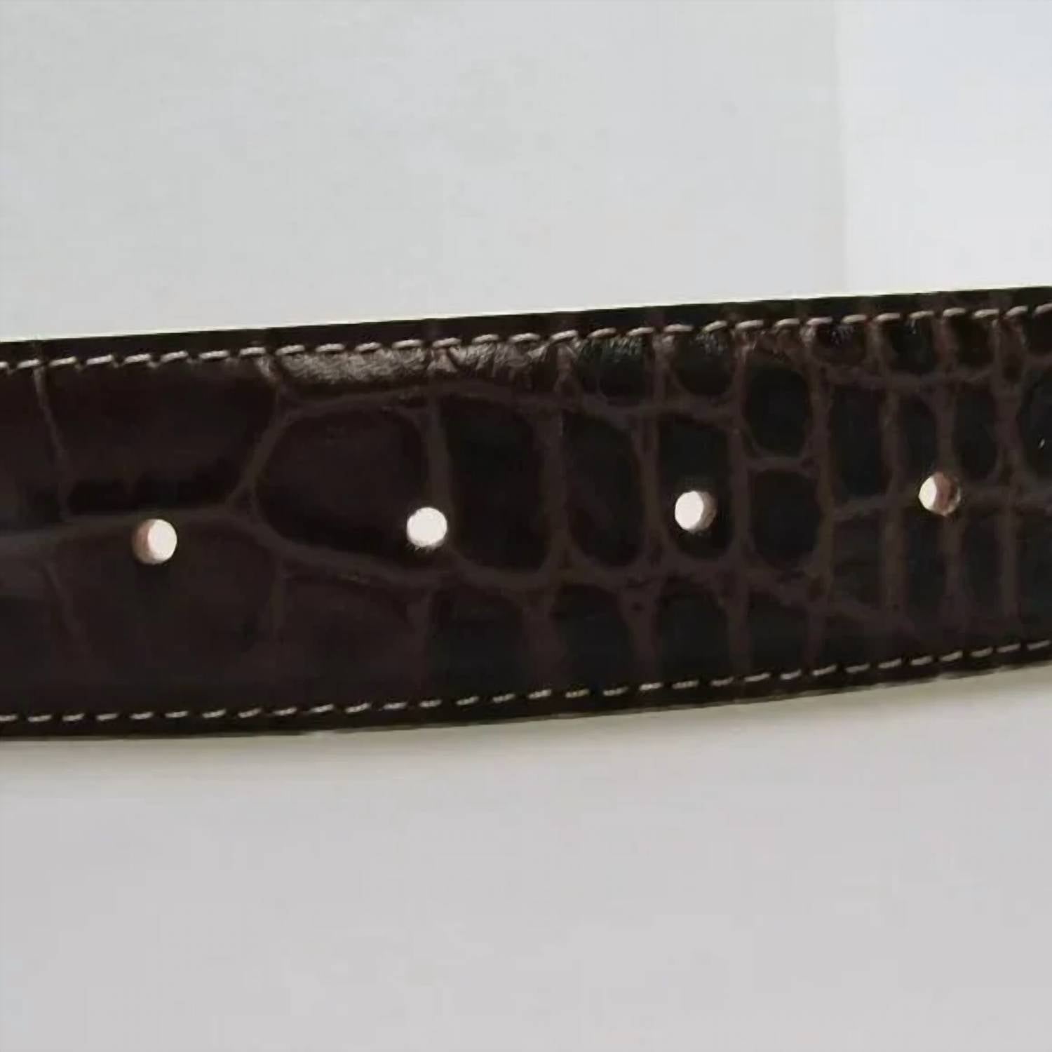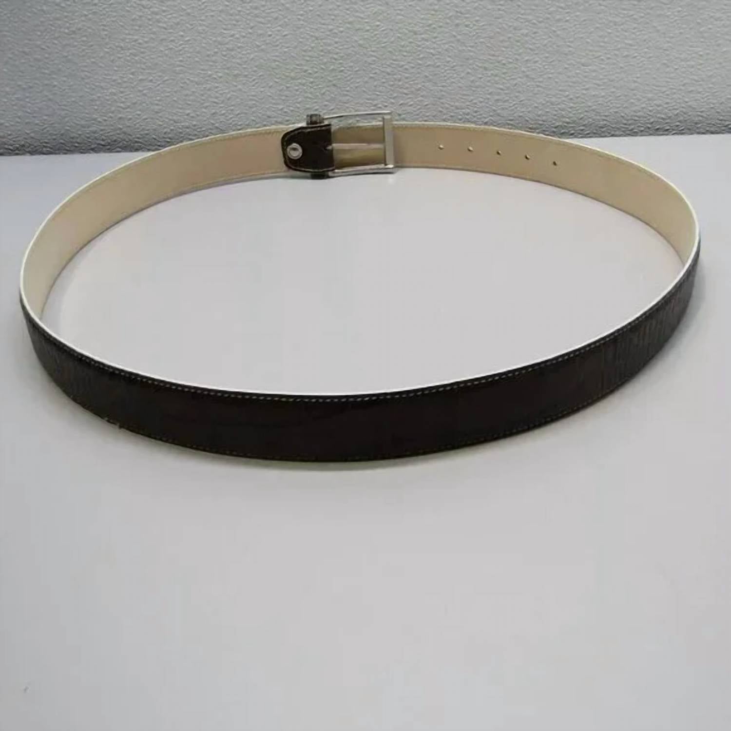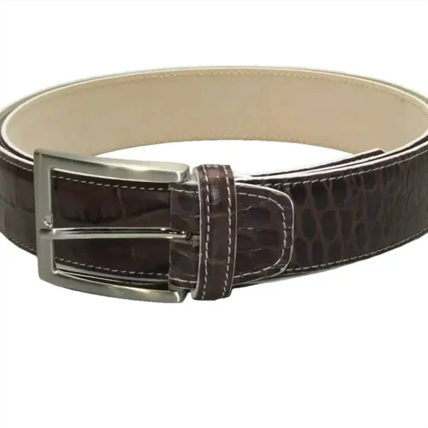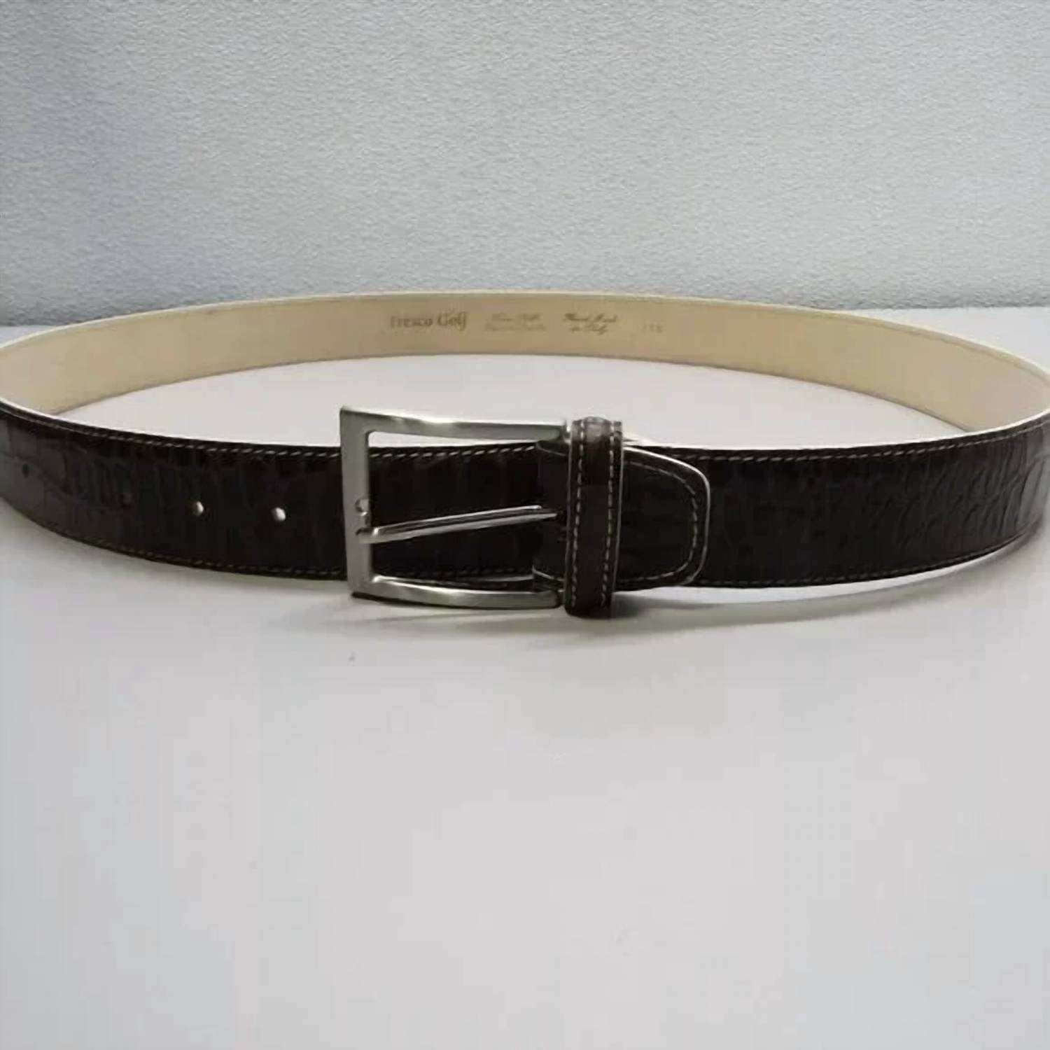 Introducing the Men's Leather Alligator Embossed Belt by Fresco Golf, designed for the discerning gentleman. Made from genuine, high-quality leather, this belt showcases a luxurious dark brown alligator-embossed design. Originating from Italy, it features a secure buckle closure for a comfortable fit. Perfect for adding a touch of sophistication to any outfit.