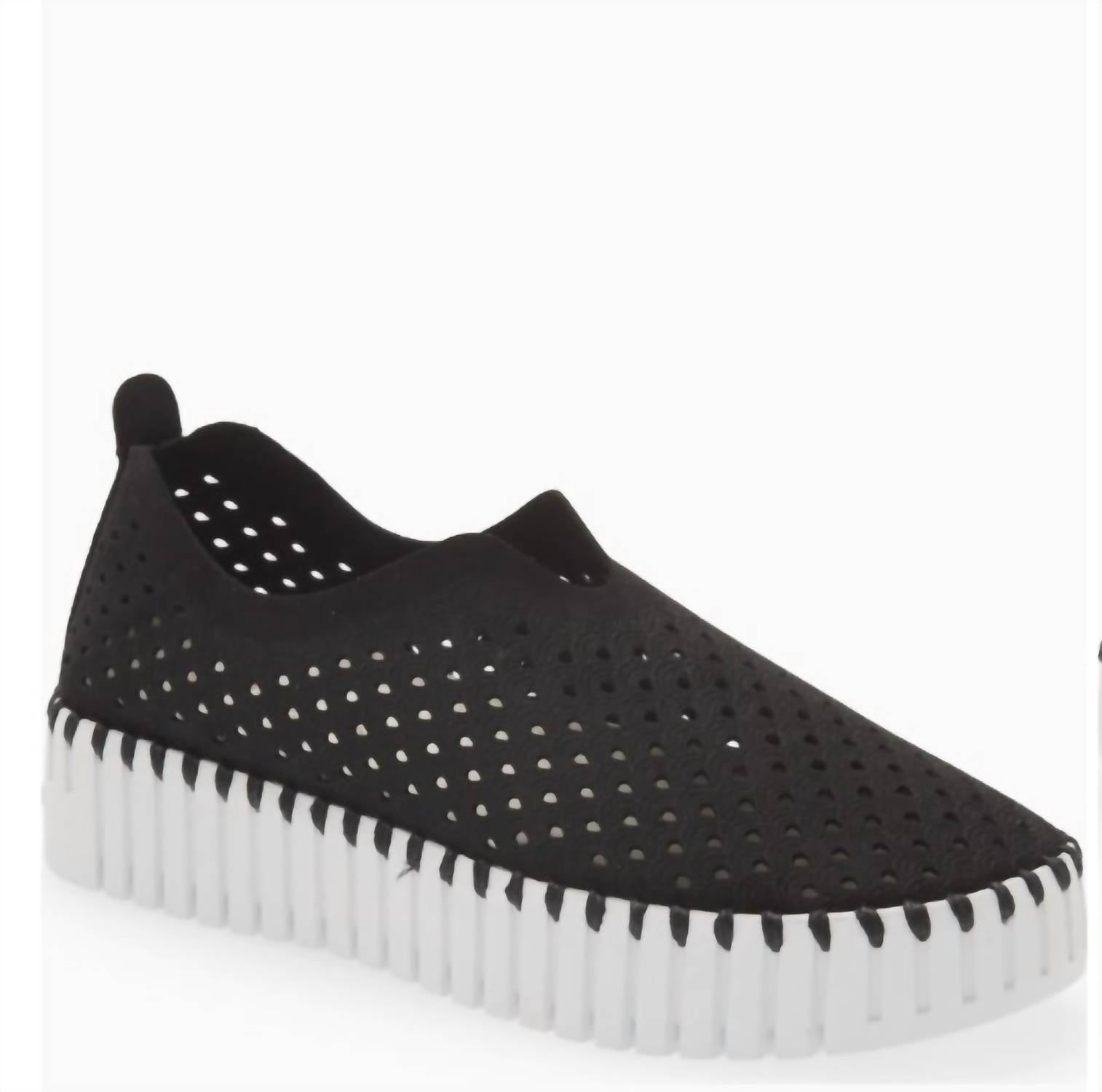 This slip-on sneaker features decorative perforations for style and breathability, a 1 1/2-inch heel, a 1 1/4-inch platform (size 9 US/39 EU), a removable insole, and is made with a recycled microfiber upper, synthetic lining, and a sole composed of rubber and recycled rubber. It is imported.