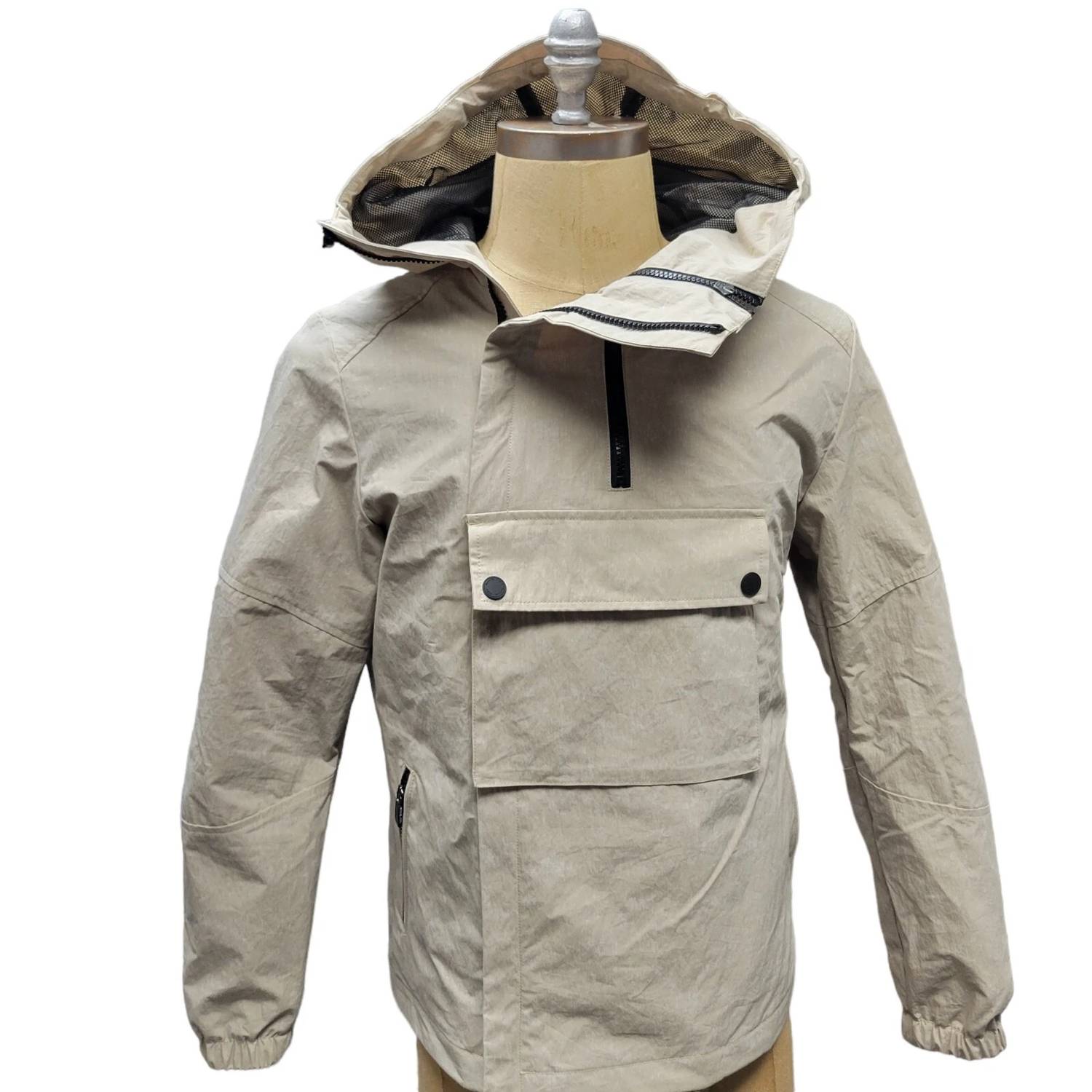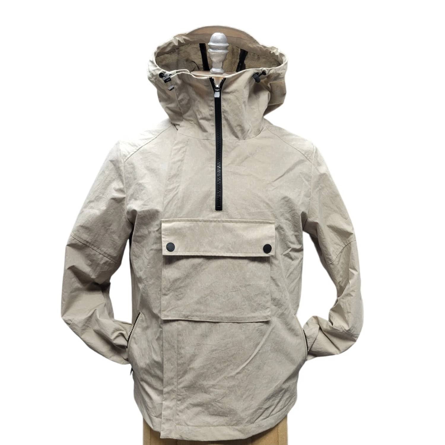 Introducing the Crinkled Woven Hoodie Cargo Jacket by MICHAEL KORS, an essential for any winter wardrobe. This men's windbreaker, in a unique Dune color, features long sleeves, a hooded neckline, and a solid pattern. Crafted from 100% polyester with an inner vest fill, it includes practical design elements such as a large cargo front pocket and side zip pockets. With a secure zip closure, this jacket is perfect for combating chilly days, and it’s easy to care for with its machine-washable fabric.