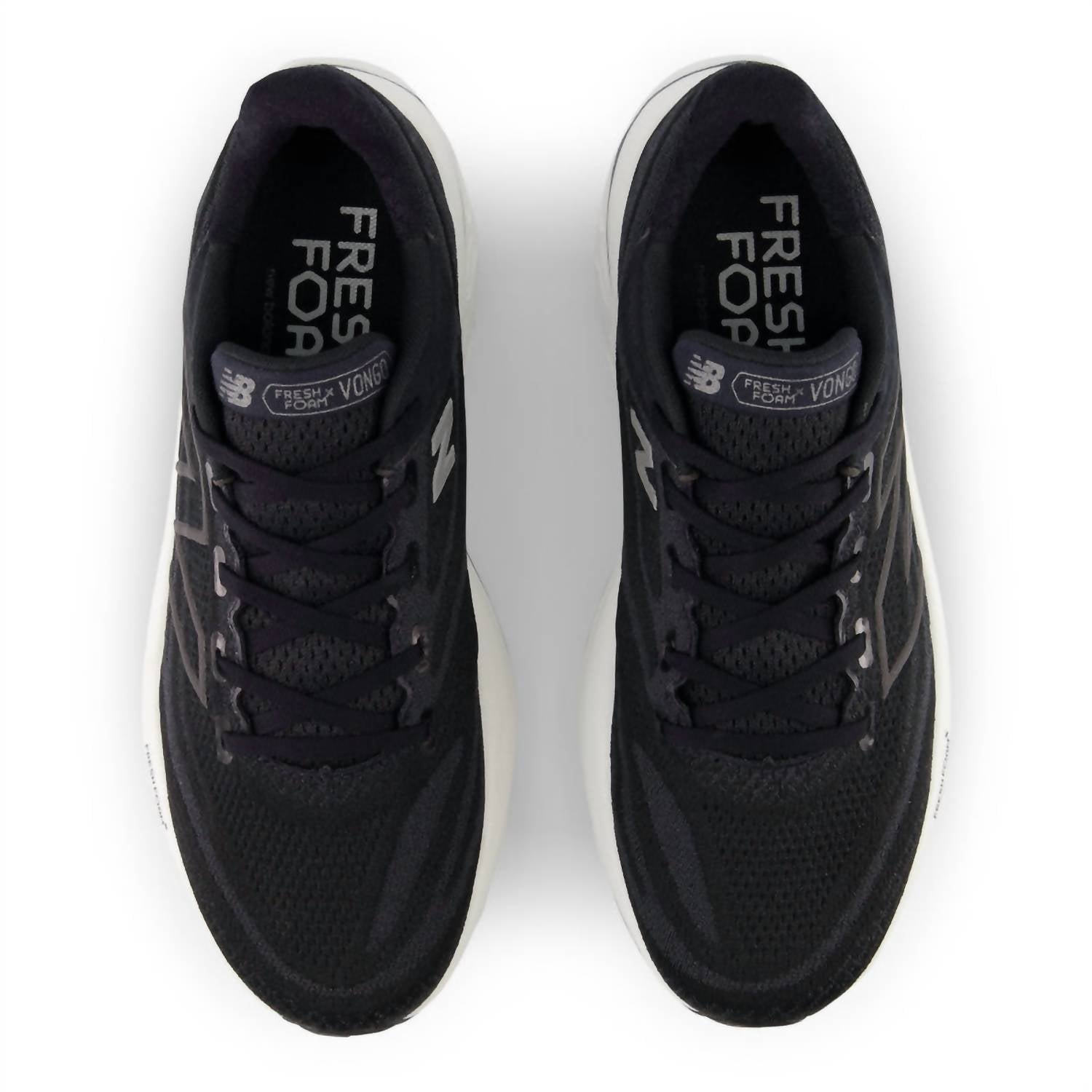 Introducing the Men's Fresh Foam X Vongo V6 Running Shoes by New Balance, crafted for a superb running experience with black and white style. Engineered with a mesh upper for breathable support and synthetic materials with no-sew overlays, these shoes offer a comfortable fit. Weighing 303 grams (10.7 oz), they feature a Fresh Foam X midsole for exceptional cushioning and a supportive medial zone to enhance stability and minimize overpronation. Ideal for summer streetwear fashion, these shoes are perfect for Thanksgiving athletics.