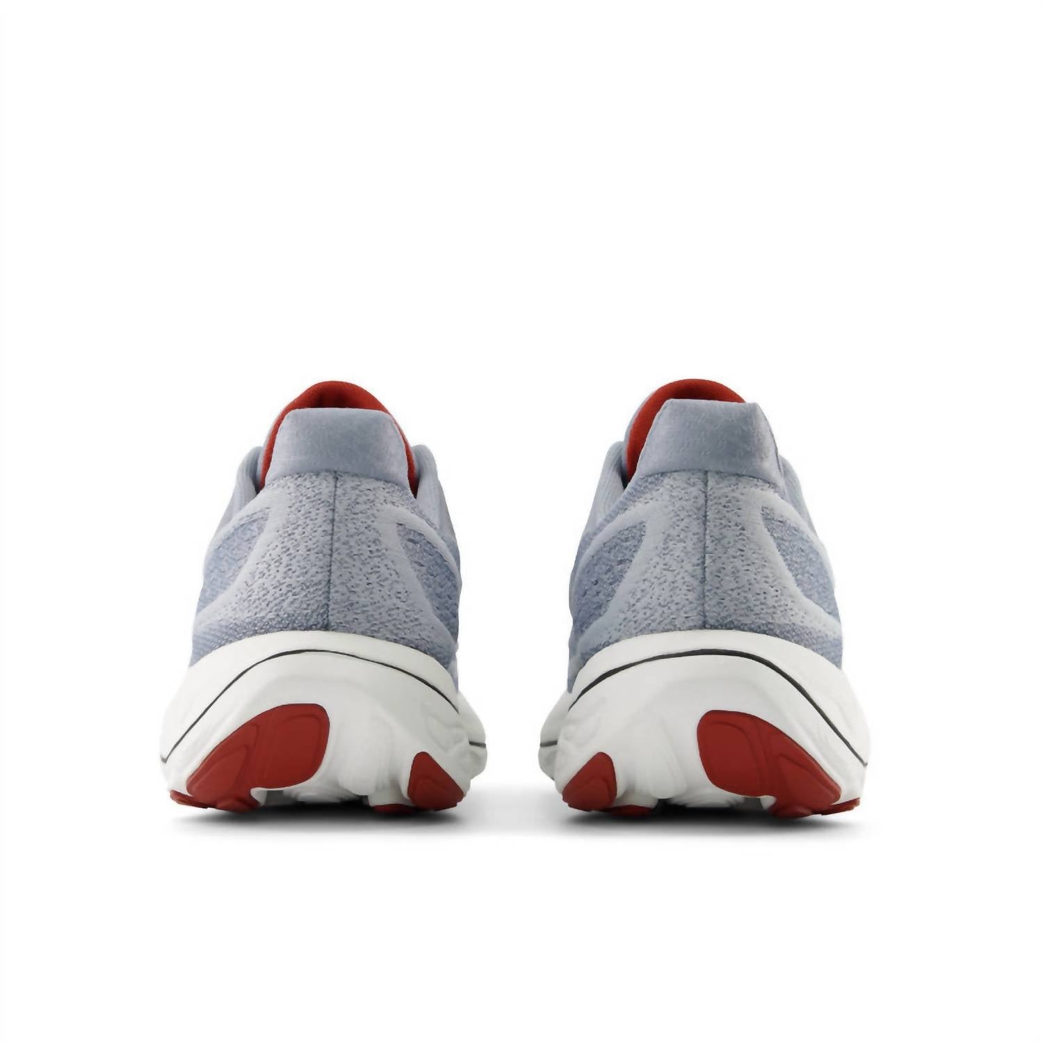 Experience unparalleled comfort and support with the Men's Fresh Foam X Vongo V6 Running Shoes by New Balance. Crafted with an engineered mesh and synthetic upper featuring no-sew overlays, these shoes provide both breathability and a snug fit. The Fresh Foam X midsole delivers exceptional cushioning, while the supportive medial zone minimizes overpronation, ensuring stability. Weighing 303 grams (10.7 oz), these Aluminium Brick Red shoes are perfect for your fitness and workout needs.