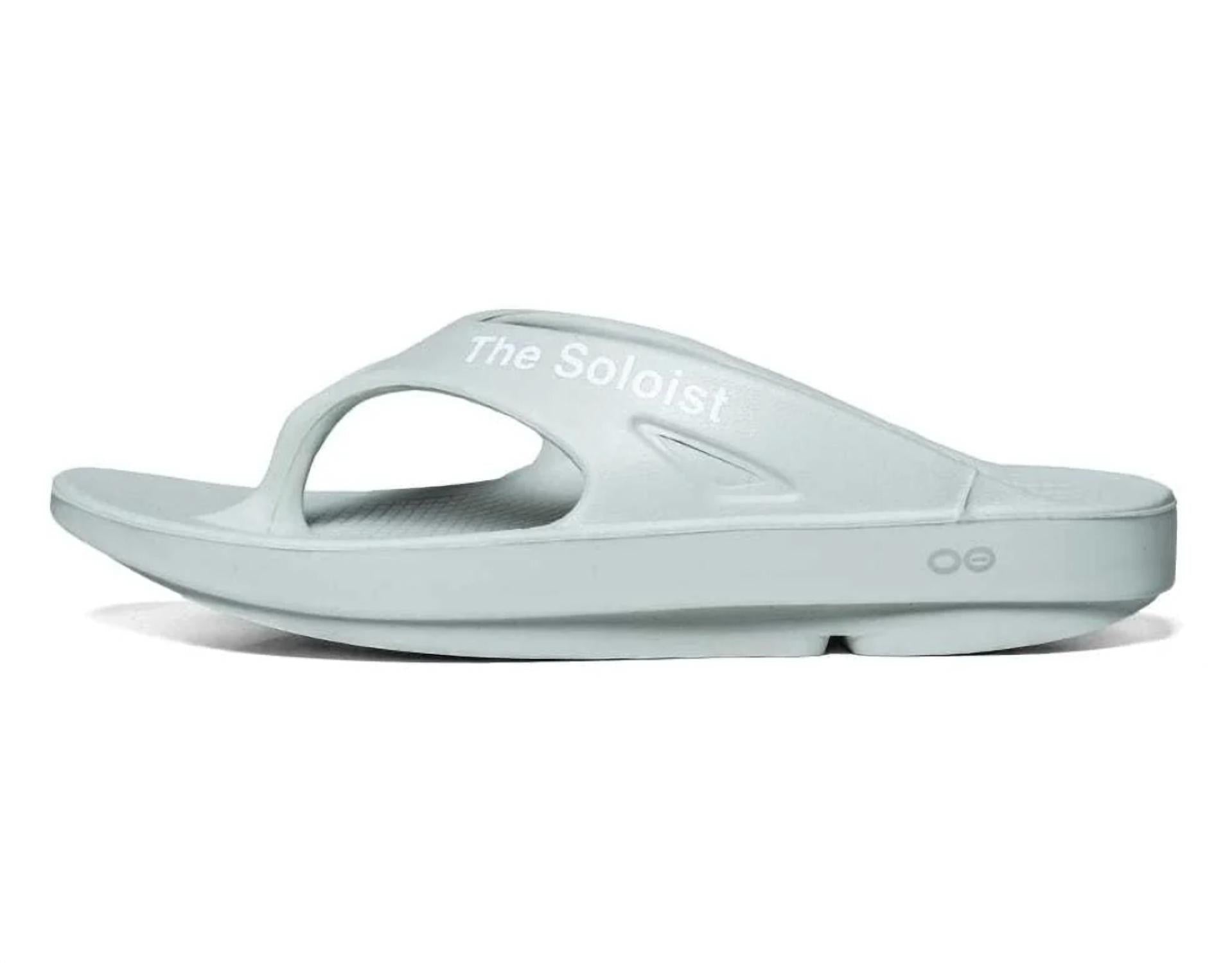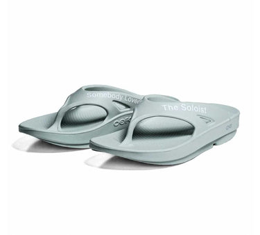 Experience exceptional comfort and style with the Men Slider Flip Flop by OOFOS x TAKAHIROMIYASHITATheSoloist., presented in Cosmic Grey. Composed of 100% recovery foam rubber, these sandals promise superior cushioning and support. Made in Vietnam, they showcase distinctive phrases—"The Sound of The Soloist" and "Last Night I Dreamt That Somebody Loved Me"—adding a unique touch to any outfit. Ideal for summer or beach days, the round toe design maintains a chic, minimalist aesthetic.