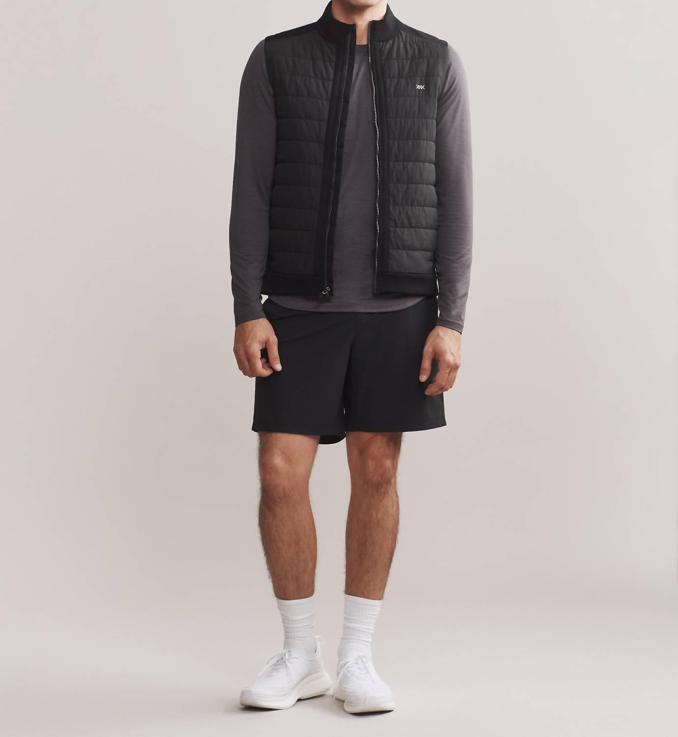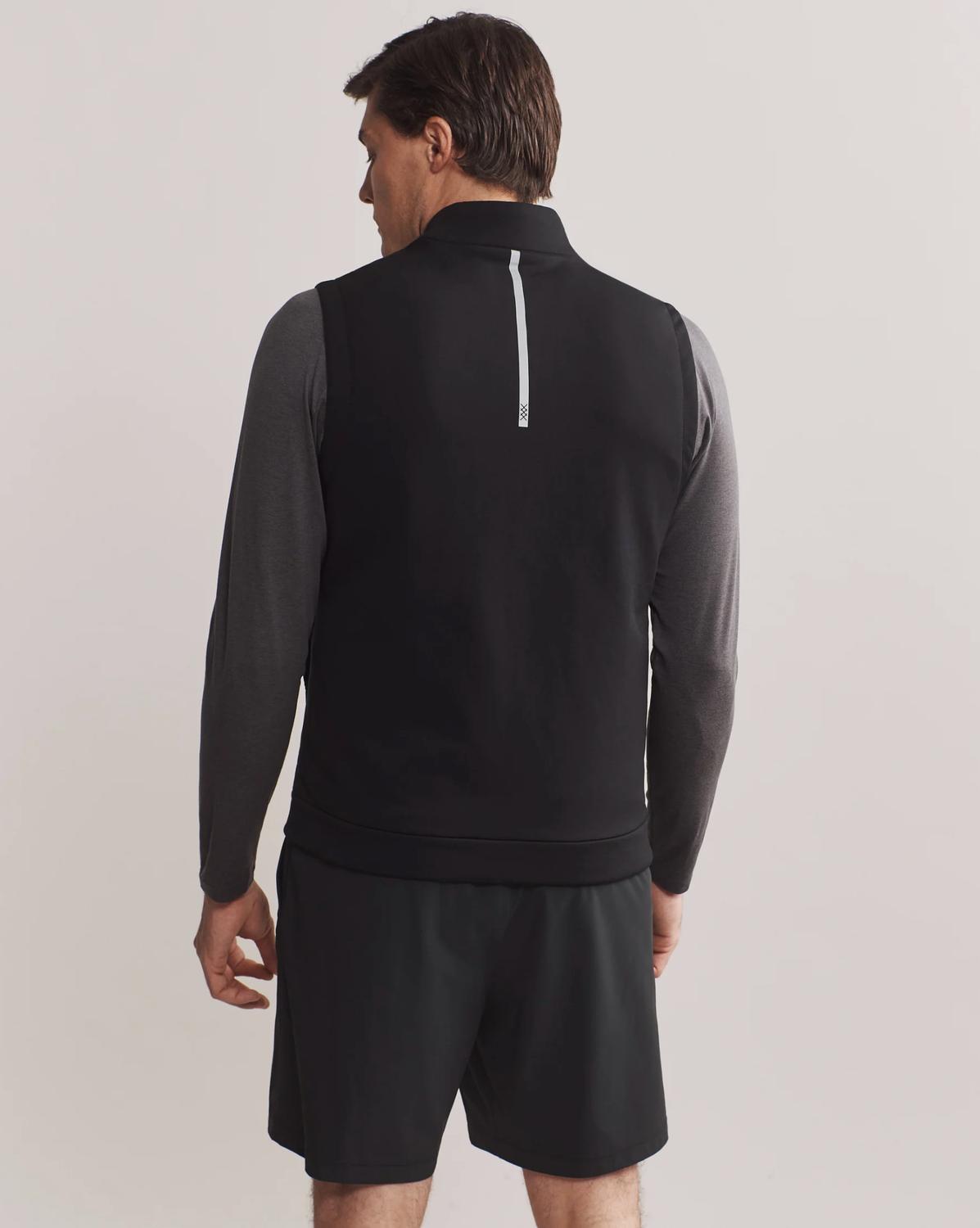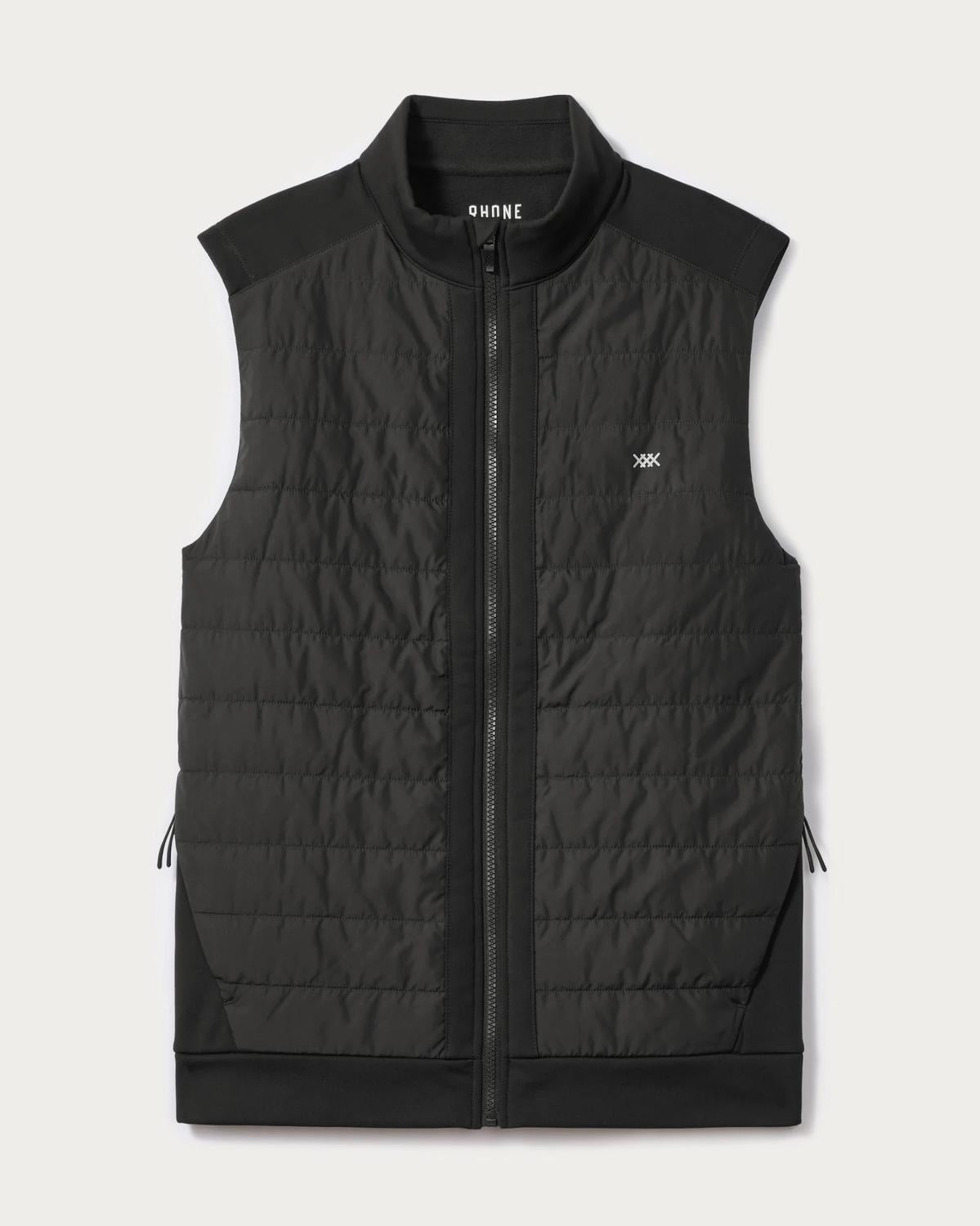 Stay active with the Alpine Insulated Active Vest by RHONE, designed for women who move with confidence even in cold conditions. This sleeveless vest in solid black combines stretch fleece with weather-resistant quilted front panels for lightweight warmth and protection. It features a secure zip closure and reflective logos for added visibility, plus practical stretch hand pockets for valuables. Care for this piece is easy: simply machine wash and line dry.