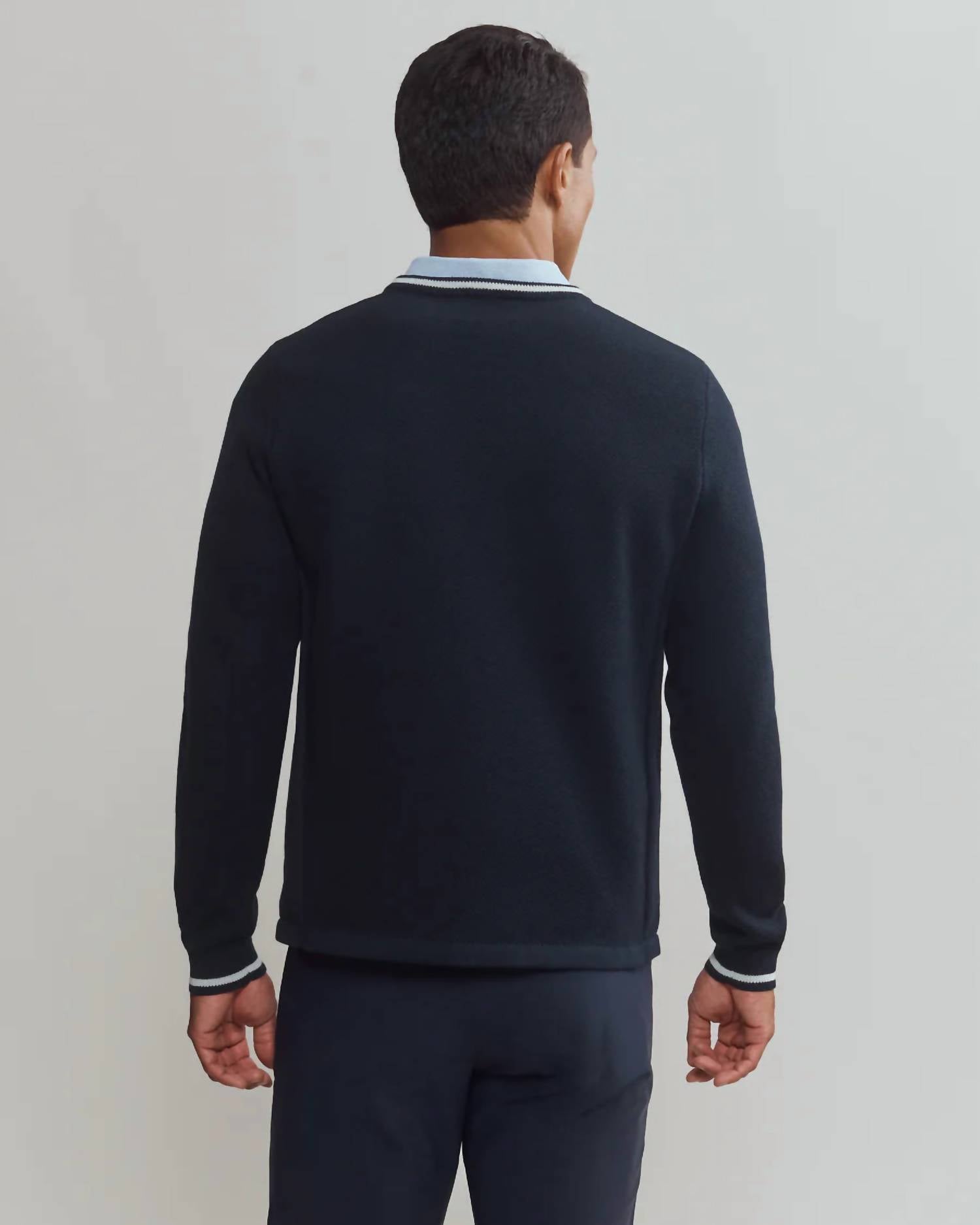 Introducing the RHONE Golf V-Neck Sweater in navy, a refined choice for the discerning golfer. Crafted with long sleeves and made from a cotton blend with polyester, this sweater offers both comfort and performance. With a pull-on closure, this minimalist piece has a solid pattern perfect for a variety of occasions. Care for this elegant layer by machine washing it cold on a gentle cycle, reshaping while damp, and laying it flat to dry. Dry cleaning is recommended for the best results.